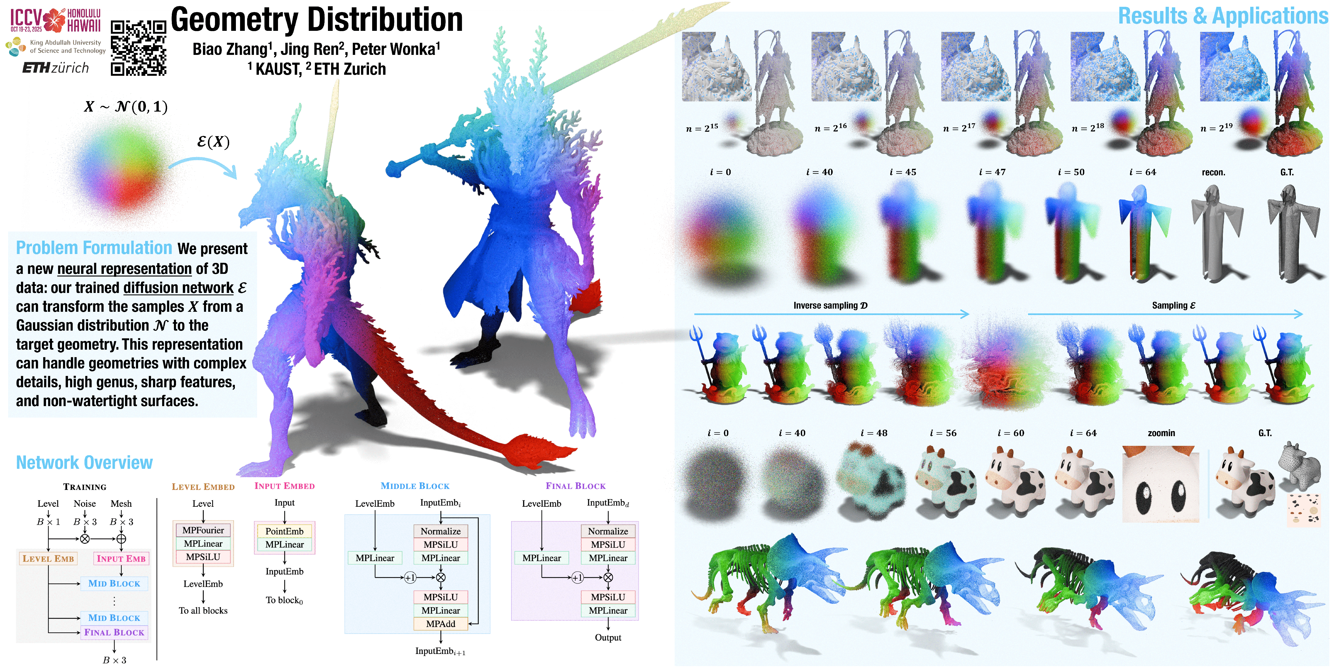 Neural representations of 3D data have been widely adopted across various applications, particularly in recent work leveraging coordinate-based networks to model scalar or vector fields. However, these approaches face inherent challenges, such as handling thin structures and non-watertight geometries, which limit their flexibility and accuracy. In contrast, we propose a novel geometric data representation that models geometry as distributions-a powerful representation that makes no assumptions about surface genus, connectivity, or boundary conditions. Our approach uses diffusion models with a novel network architecture to learn surface point distributions, capturing fine-grained geometric details. We evaluate our representation qualitatively and quantitatively across various object types, demonstrating its effectiveness in achieving high geometric fidelity. Additionally, we explore applications using our representation, such as textured mesh representation, neural surface compression, dynamic object modeling, and rendering, highlighting its potential to advance 3D geometric learning.