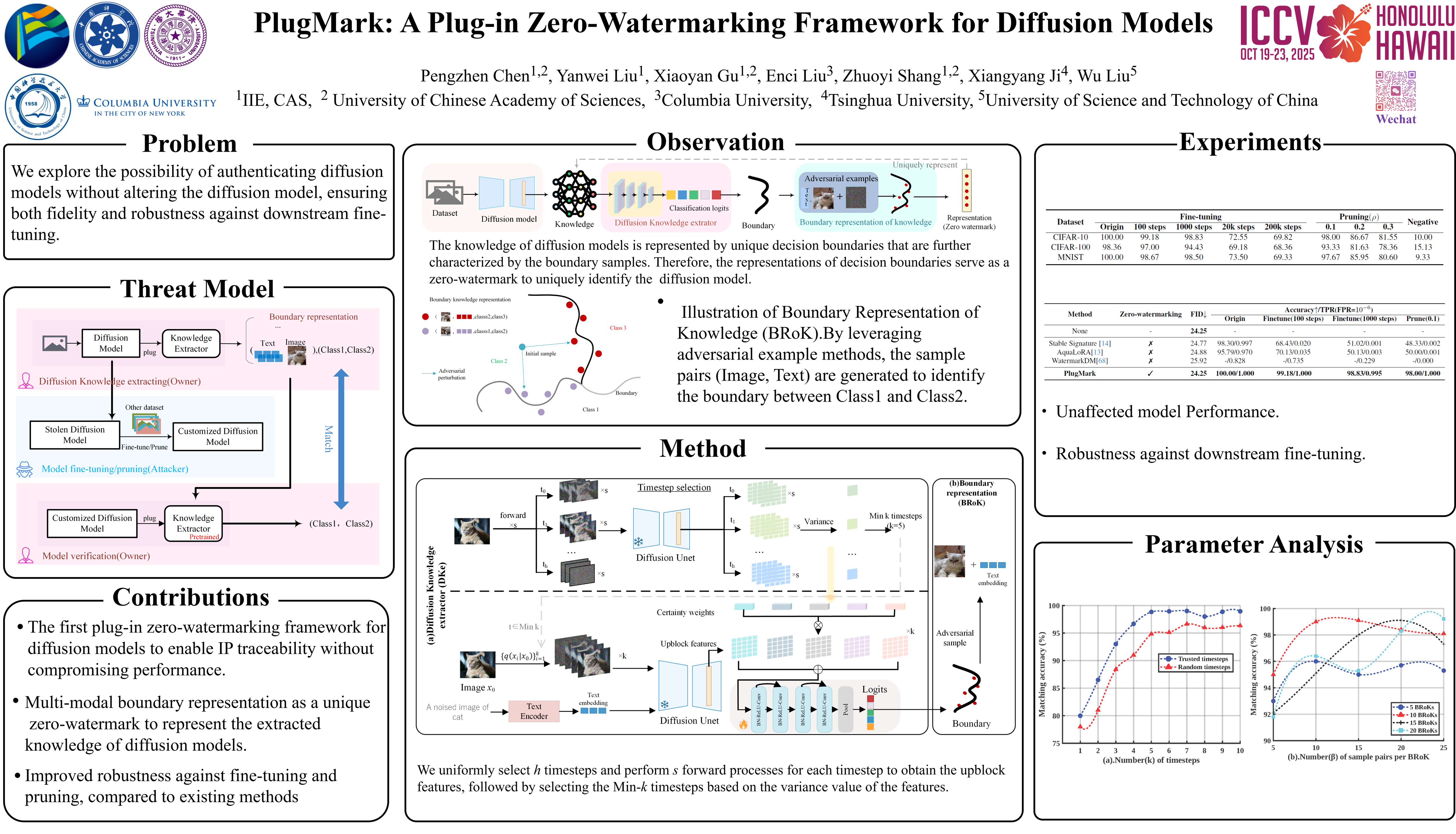 Diffusion models have significantly advanced the field of image synthesis, making the protection of their intellectual property (IP) a critical concern. Existing IP protection methods primarily focus on embedding watermarks into generated images by altering the structure of the diffusion process. However, these approaches inevitably compromise the quality of the generated images and are particularly vulnerable to fine-tuning attacks, especially for open-source models such as Stable Diffusion (SD). In this paper, we propose PlugMark, a novel plug-in zero-watermarking framework for diffusion models. The core idea of PlugMark is based on two observations: a classifier can be uniquely characterized by its decision boundaries, and a diffusion model can be uniquely represented by the knowledge acquired from training data.Building on this foundation, we introduce a diffusion knowledge extractor that can be plugged into a diffusion model to extract its knowledge and output a classification result. PlugMark subsequently generates boundary representations based on this classification result, serving as a zero-distortion watermark that uniquely represents the decision boundaries and, by extension, the knowledge of the diffusion model. Since only the extractor requires training, the performance of the original diffusion model remains unaffected.Extensive experimental results demonstrate that PlugMark can robustly extract high-confidence zero-watermarks from both the original model and its post-processed versions while effectively distinguishing them from non-post-processed diffusion models.