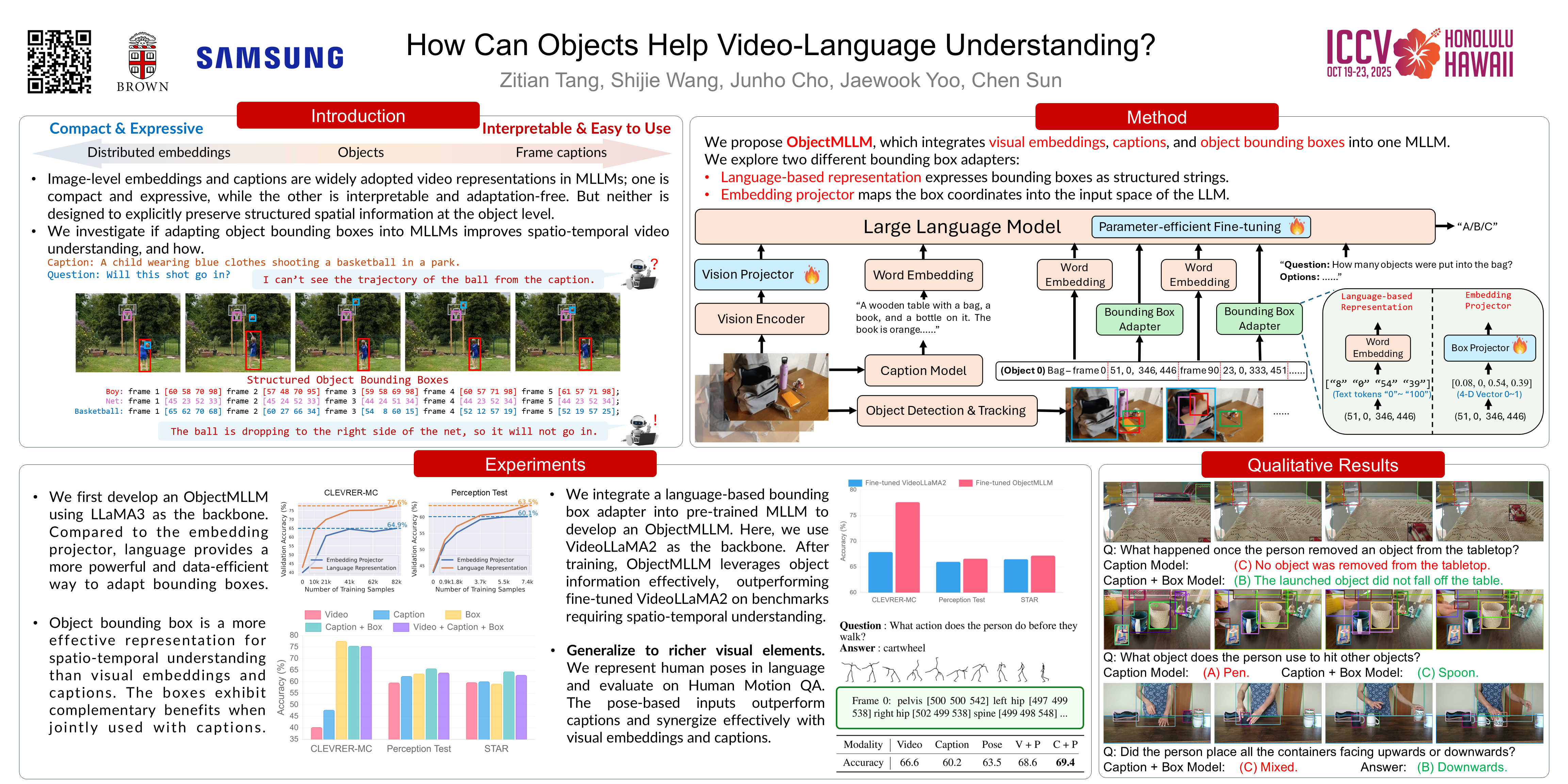 How multimodal large language models (MLLMs) perceive the visual world remains a mystery. To one extreme, object and relation modeling may be implicitly implemented with inductive biases, for example by treating objects as tokens. To the other extreme, empirical results reveal the surprising finding that simply performing visual captioning, which tends to ignore spatial configuration of the objects, serves as a strong baseline for video understanding. We aim to answer the question: how can objects help video-language understanding in MLLMs? We tackle the question from the object representation and adaptation perspectives. Specifically, we investigate the trade-off between representation expressiveness (e.g. distributed versus symbolic) and integration difficulty (e.g. data-efficiency when learning the adapters). Through extensive evaluations on five video question answering datasets, we confirm that explicit integration of object-centric representation remains necessary, and the symbolic objects can be most easily integrated while being performant for question answering. We hope our findings can encourage the community to explore the explicit integration of perception modules into MLLM design. Our code and models will be publicly released.