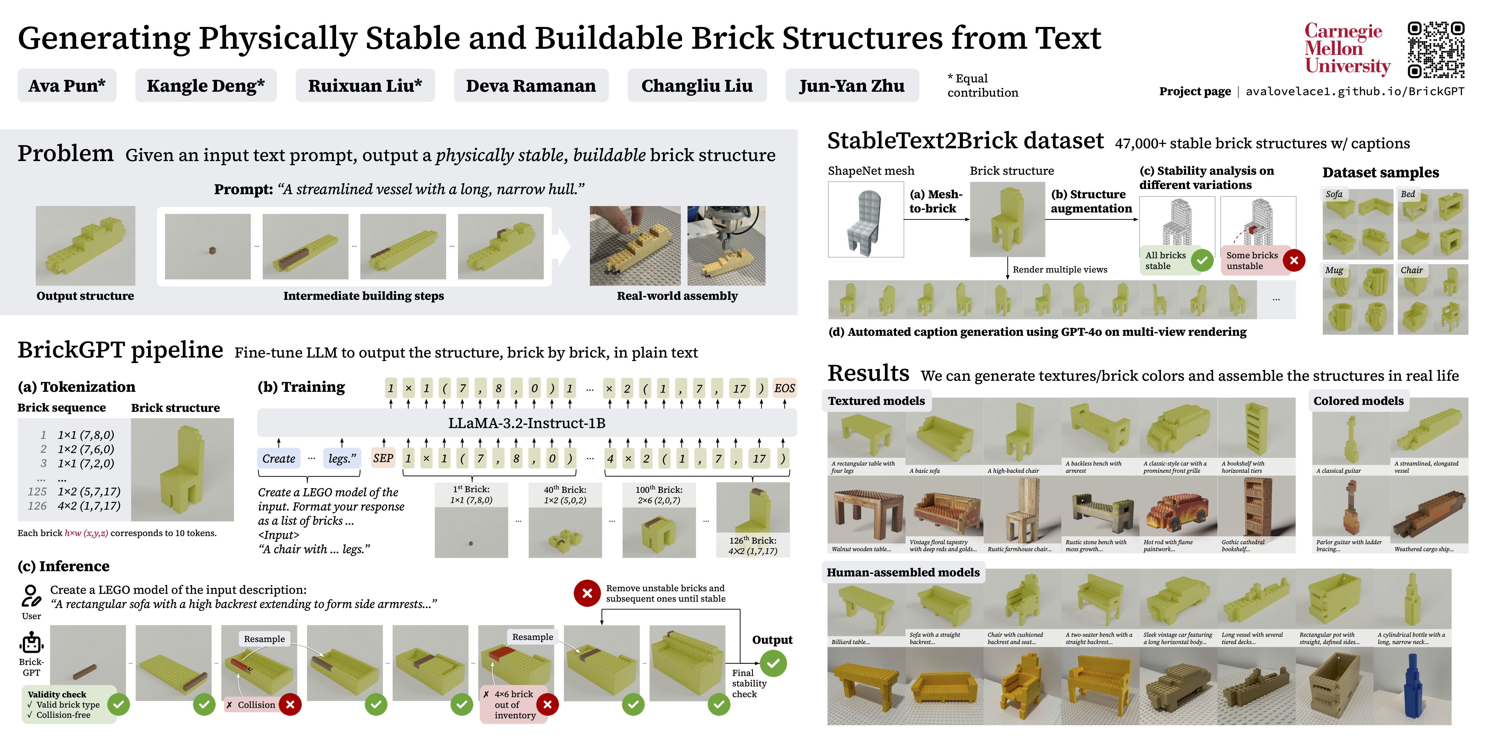 We introduce LegoGPT, the first approach for generating physically stable LEGO brick models from text prompts. To achieve this, we construct a large-scale, physically stable dataset of LEGO designs, along with their associated captions, and train an autoregressive large language model to predict the next brick to add via next-token prediction. To improve the stability of the resulting designs, we employ an efficient validity check and physics-aware rollback during auto-regressive inference, which prunes infeasible token predictions using physics laws and assembly constraints. Our experiments show that LegoGPT produces stable, diverse, and aesthetically pleasing LEGO designs that align closely with the input text prompts. We also develop a text-based LEGO texturing method, enabling us to generate colored and textured designs. We show that our designs can be assembled by humans manually as well as by robotic arms automatically. Upon publication, we will release our new dataset, StableText2Lego, which contains over 47,000 LEGO structures of over 28,000 unique 3D objects accompanied by detailed captions, along with our code and models.