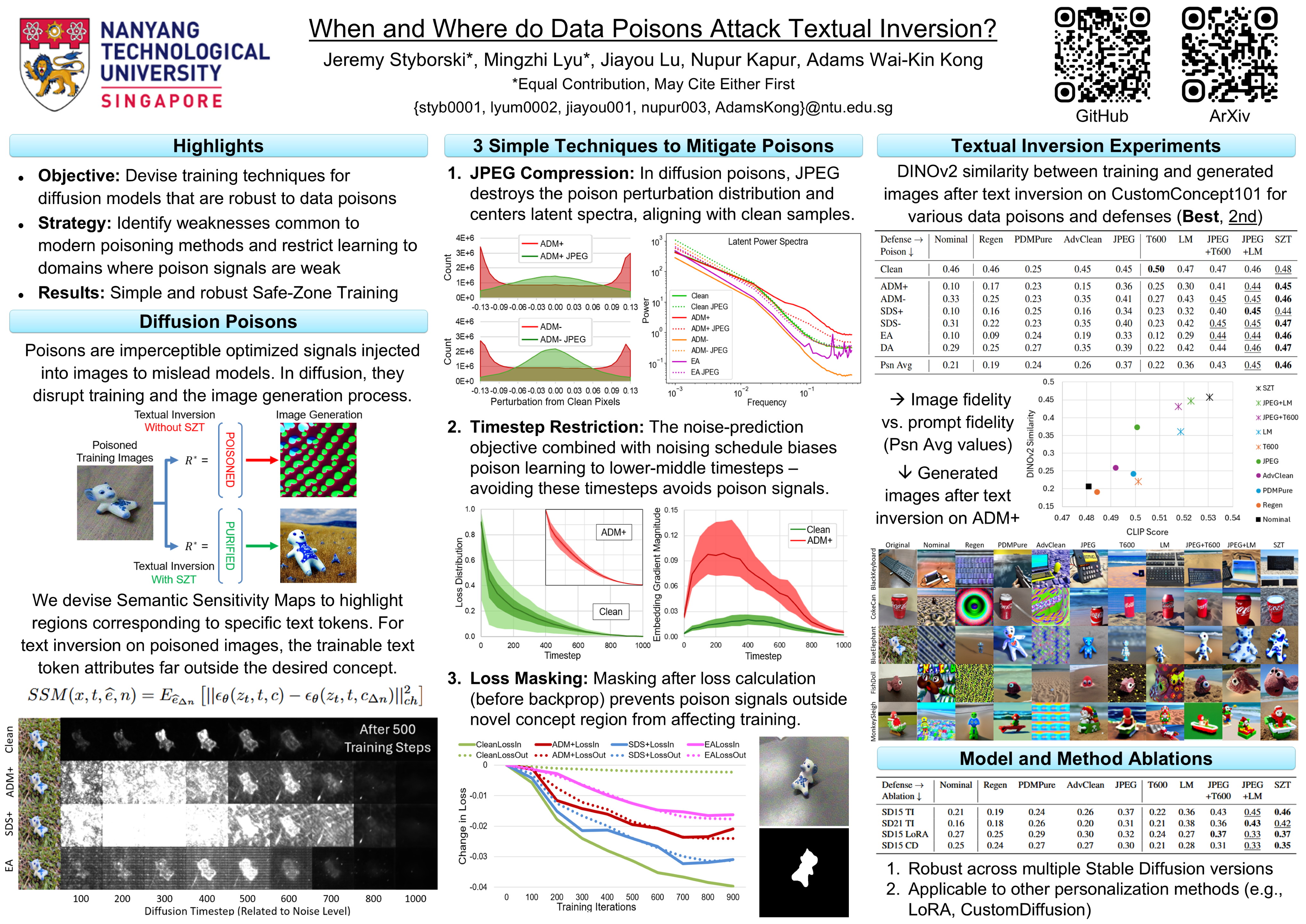 Poisoning attacks pose significant challenges to the robustness of diffusion models (DMs). In this paper, we systematically analyze when and where poisoning affects textual inversion, a widely used personalization technique for DMs. We first introduce Semantic Sensitivity Maps (SSM), a novel method for visualizing the influence of poisoning on text embeddings. Second, we identify and experimentally verify that DMs exhibit non-uniform learning behavior across timesteps, focusing on lower-noise samples. Poisoning attacks inherit this bias and inject adversarial signals predominantly at lower timesteps. Third, we find that adversarial signals distract DM learning away from relevant regions within training data, ultimately degrading textual inversion quality. Based on these insights, we propose Safe-Zone Training (SZT), a novel defense mechanism comprised of 3 key components: (1) JPEG compression to weaken high-frequency poison signals, (2) restriction to higher timesteps during textual inversion training to avoid adversarial signals at lower timesteps, and (3) loss masking to constrain learning to relevant regions. Extensive experiments across multiple poisoning methods demonstrate that SZT significantly enhances the robustness of textual inversion against all poisoning attacks, improving average DINOv2 similarity across poisons to 0.43, compared to prior published defenses at 0.26. We will publish code and datasets upon acceptance.