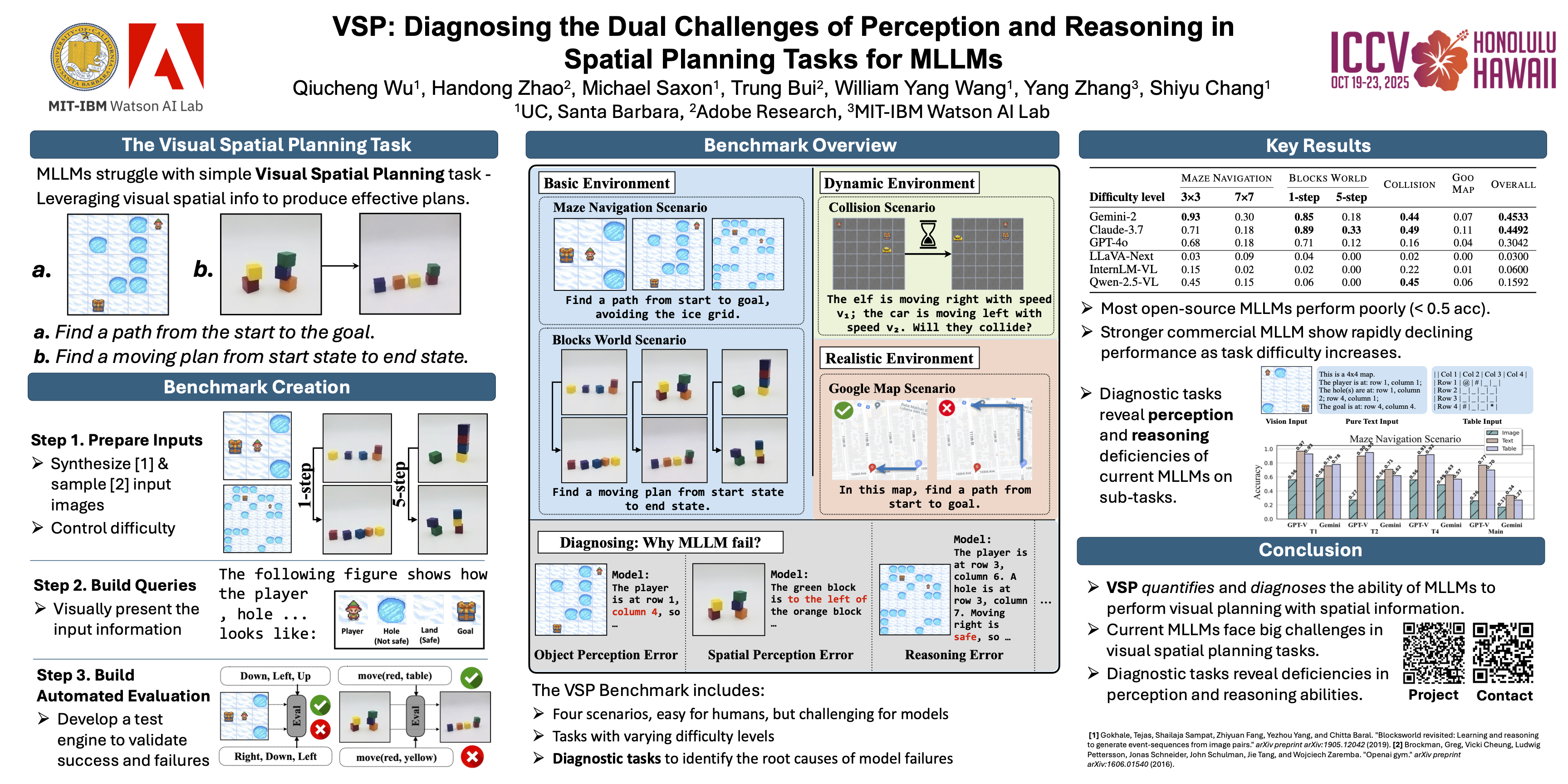 Multimodal large language models are an exciting emerging class of language models (LMs) that have merged classic LM capabilities with those of image processing systems. However, how these capabilities integrate is often not intuitive and warrants direct investigation. One understudied capability in MLLMs is visual spatial planning---the ability to comprehend the spatial arrangements of objects and devise action plans to achieve desired outcomes in visual scenes. It is unclear why MLLMs fall short on these tasks generally considered easy for humans, given their successes across other diverse scenarios. To this end, we introduce VSP, a benchmark that 1) evaluates the spatial planning capability in MLLMs in general, and 2) diagnoses this capability via finer-grained sub-tasks, including perception and reasoning, and measure the capabilities of models through these sub-tasks. Our evaluation confirms that both open-source and private MLLMs fail to generate effective plans for even simple spatial planning tasks. Evaluations on the fine-grained analytical tasks further reveal fundamental deficiencies in the models’ visual perception and bottlenecks in reasoning abilities, explaining their worse performance in the general spatial planning tasks. Our work illuminates future directions for improving MLLMs' abilities in spatial planning.
