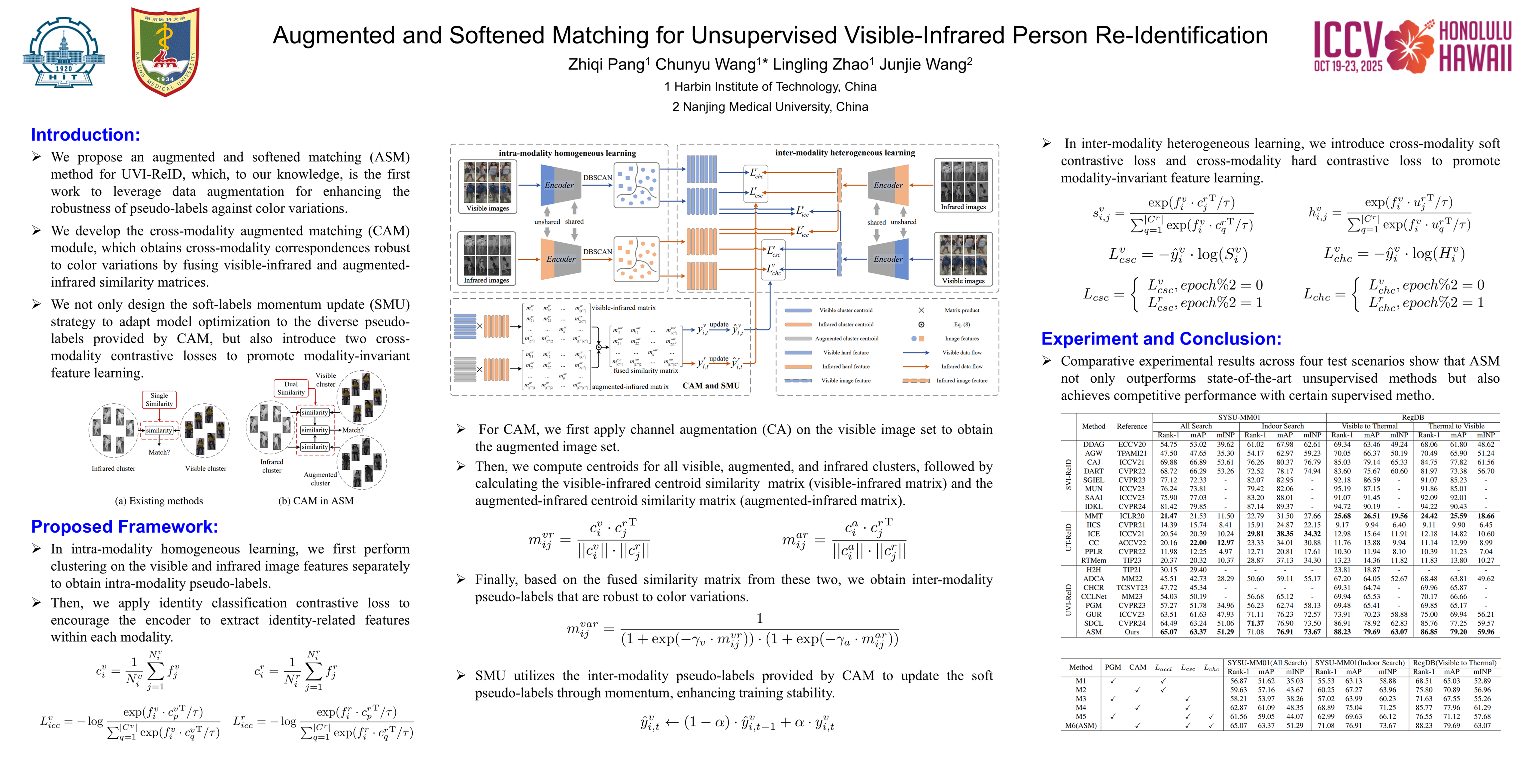 Color variations, a key challenge in the unsupervised visible-infrared person re-identification (UVI-ReID) task, have garnered significant attention. While existing UVI-ReID methods have made substantial efforts during the optimization phase to enhance the model’s robustness to color variations, they often overlook the impact of color variations on the acquisition of pseudo-labels. To address this, in this paper, we focus on improving the robustness of pseudo-labels to color variations through data augmentation and propose an augmented and softened matching (ASM) method. Specifically, we first develop the cross-modality augmented matching (CAM) module, which performs channel augmentation on visible images to generate augmented images. Then, based on the fusion of the visible-infrared and augmented-infrared centroid similarity matrices, CAM establishes cross-modality correspondences that are robust to color variations. To increase training stability, we design a soft-labels momentum update (SMU) strategy, which converts traditional one-hot labels into soft-labels through momentum updates, thus adapting to CAM. During the optimization phase, we introduce the cross-modality soft contrastive loss and cross-modality hard contrastive loss to promote modality-invariant learning from the perspectives of shared and diversified features, respectively. Extensive experimental results validate the effectiveness of the proposed method, showing that ASM not only outperforms state-of-the-art unsupervised methods but also competes with some supervised methods.