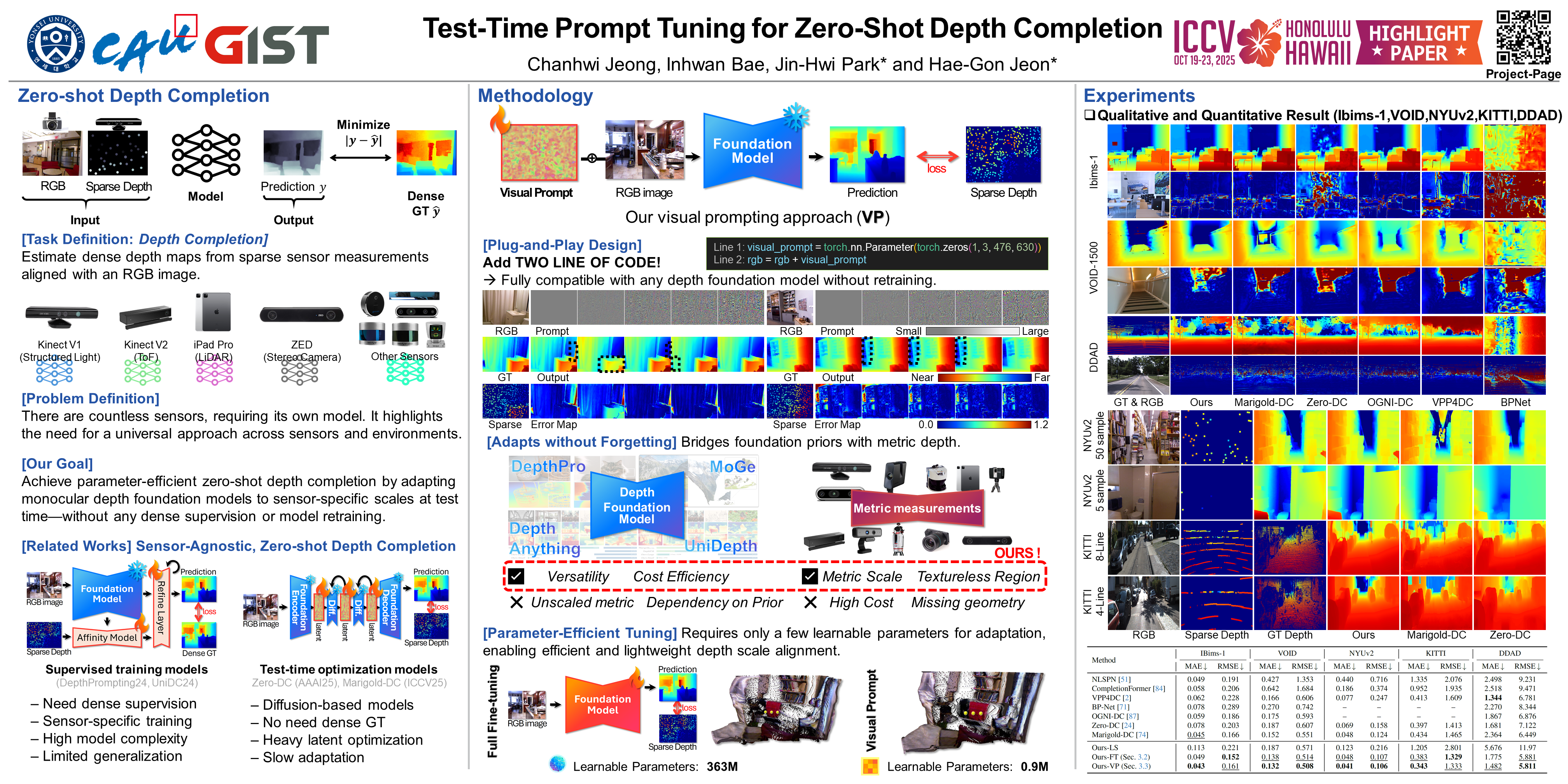 Zero-shot depth completion with metric scales poses significant challenges, primarily due to performance limitations such as domain specificity and sensor characteristics. One recent emerging solution is to integrate monocular depth foundation models into depth completion frameworks, yet these efforts still face issues with suboptimal performance and often require further adaptation to the target task. Surprisingly, we find that a simple test-time training, which fine-tunes monocular depth foundation models on sparse depth measurements from sensors just as it is, yields reasonable results. However, this test-time training obviously incurs high computational costs and introduces biases towards specific conditions, making it impractical for real-world scenarios. In this paper, we introduce a new approach toward parameter-efficient zero-shot depth completion. Our key idea of this work is to leverage visual prompt tuning, achieving sensor-specific depth scale adaptation without forgetting foundational knowledge. Experimental results on diverse datasets demonstrate that our approach outperforms relevant state-of-the-art methods, showing superior generalization and efficiency. Our source code is available in the supplementary materials.