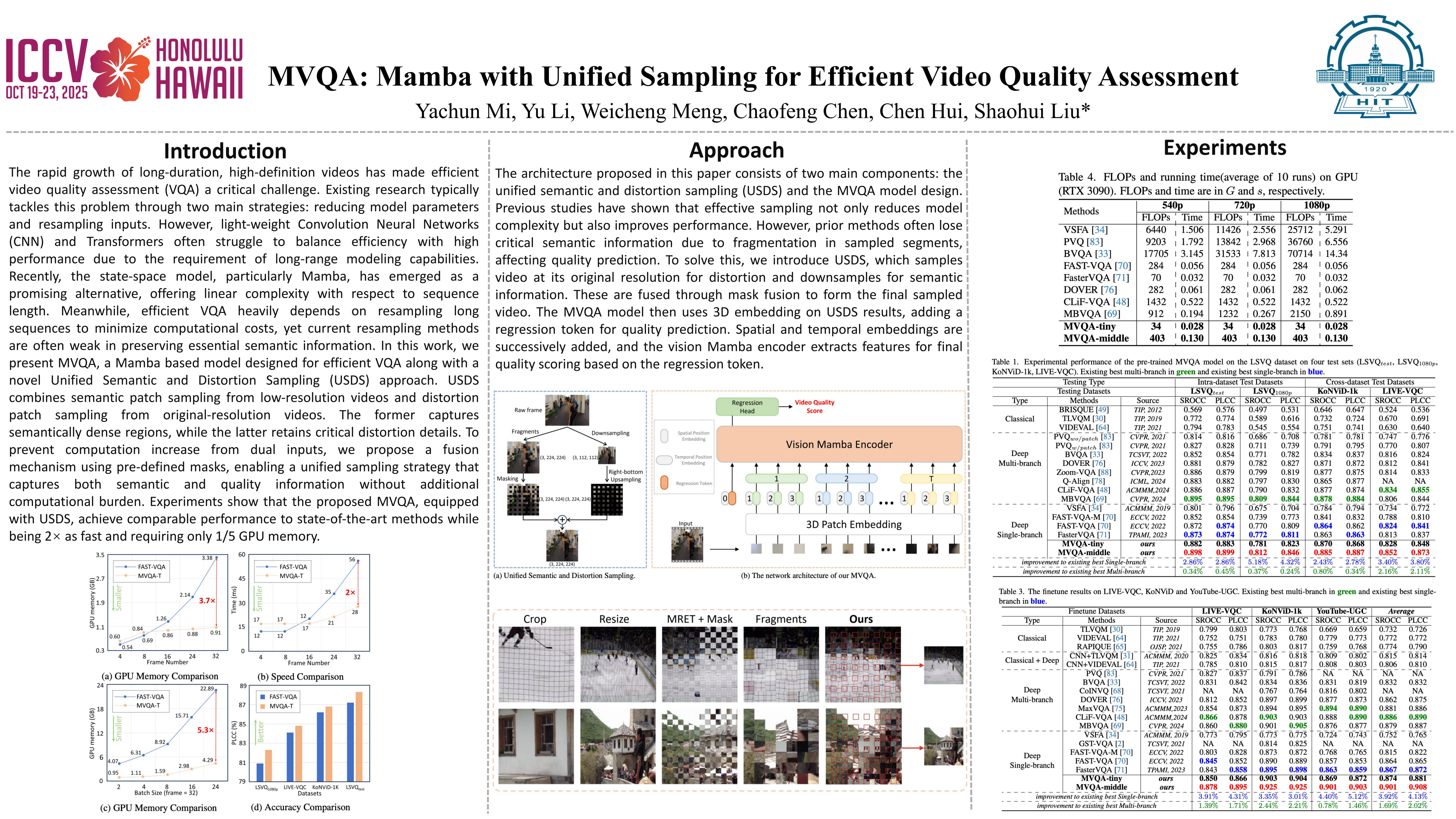 The rapid growth of long-duration, high-definition videos has made efficient video quality assessment (VQA) a critical challenge. Existing research typically tackles this problem through two main strategies: reducing model parameters and resampling inputs. However, light-weight Convolution Neural Networks (CNN) and Transformers often struggle to balance efficiency with high performance due to the requirement of long-range modeling capabilities. Recently, the state-space model, particularly Mamba, has emerged as a promising alternative, offering linear complexity with respect to sequence length. Meanwhile, efficient VQA heavily depends on resampling long sequences to minimize computational costs, yet current resampling methods are often weak in preserving essential semantic information. In this work, we present MVQA, a Mamba-based model designed for efficient VQA along with a novel Unified Semantic and Distortion Sampling (USDS) approach. USDS combines semantic patch sampling from low-resolution videos and distortion patch sampling from original-resolution videos. The former captures semantically dense regions, while the latter retains critical distortion details. To prevent computation increase from dual inputs, we propose a fusion mechanism using pre-defined masks, enabling a unified sampling strategy that captures both semantic and quality information without additional computational burden. Experiments show that the proposed MVQA, equipped with USDS, achieve comparable performance to state-of-the-art methods while being $2\times$ as fast and requiring only $1/5$ GPU memory.