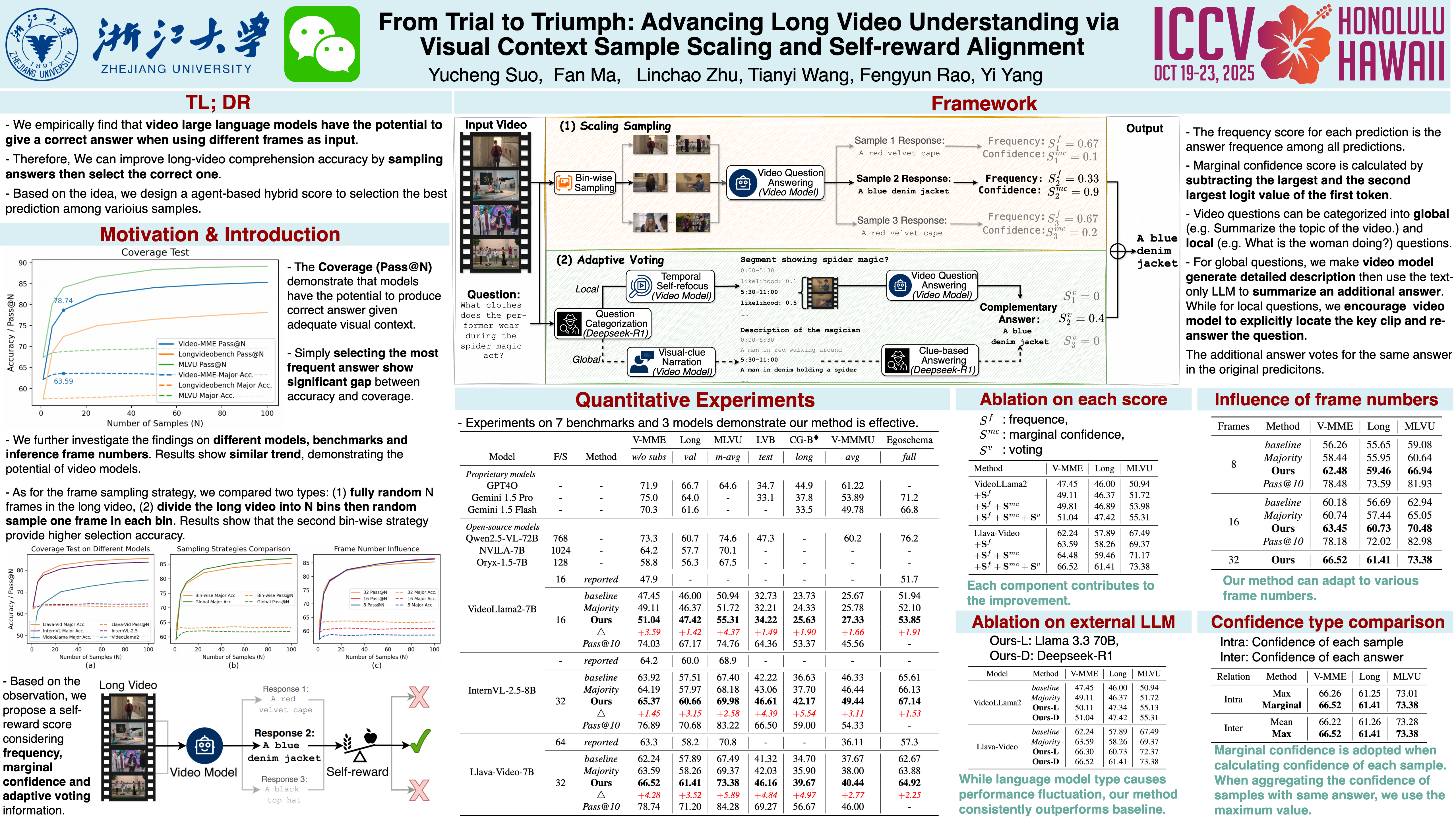 Multi-modal Large language models (MLLMs) show remarkable ability in video understanding. Nevertheless, understanding long videos remains challenging as the models can only process a finite number of frames in a single inference, potentially omitting crucial visual information. To address the challenge, we propose generating multiple predictions through visual context sampling, followed by a scoring mechanism to select the final prediction. Specifically, we devise a bin-wise sampling strategy that enables MLLMs to generate diverse answers based on various combinations of keyframes, thereby enriching the visual context. To determine the final prediction from the sampled answers, we employ a self-reward by linearly combining three scores: (1) a frequency score indicating the prevalence of each option, (2) a marginal confidence score reflecting the inter-intra sample certainty of MLLM predictions, and (3) a reasoning score for different question types, including clue-guided answering for global questions and temporal self-refocusing for local questions. The frequency score ensures robustness through majority correctness, the confidence-aligned score reflects prediction certainty, and the typed-reasoning score addresses cases with sparse key visual information using tailored strategies. Experiments show that this approach covers the correct answer for a high percentage of long video questions, on seven datasets show that our method improves the performance of three MLLMs.