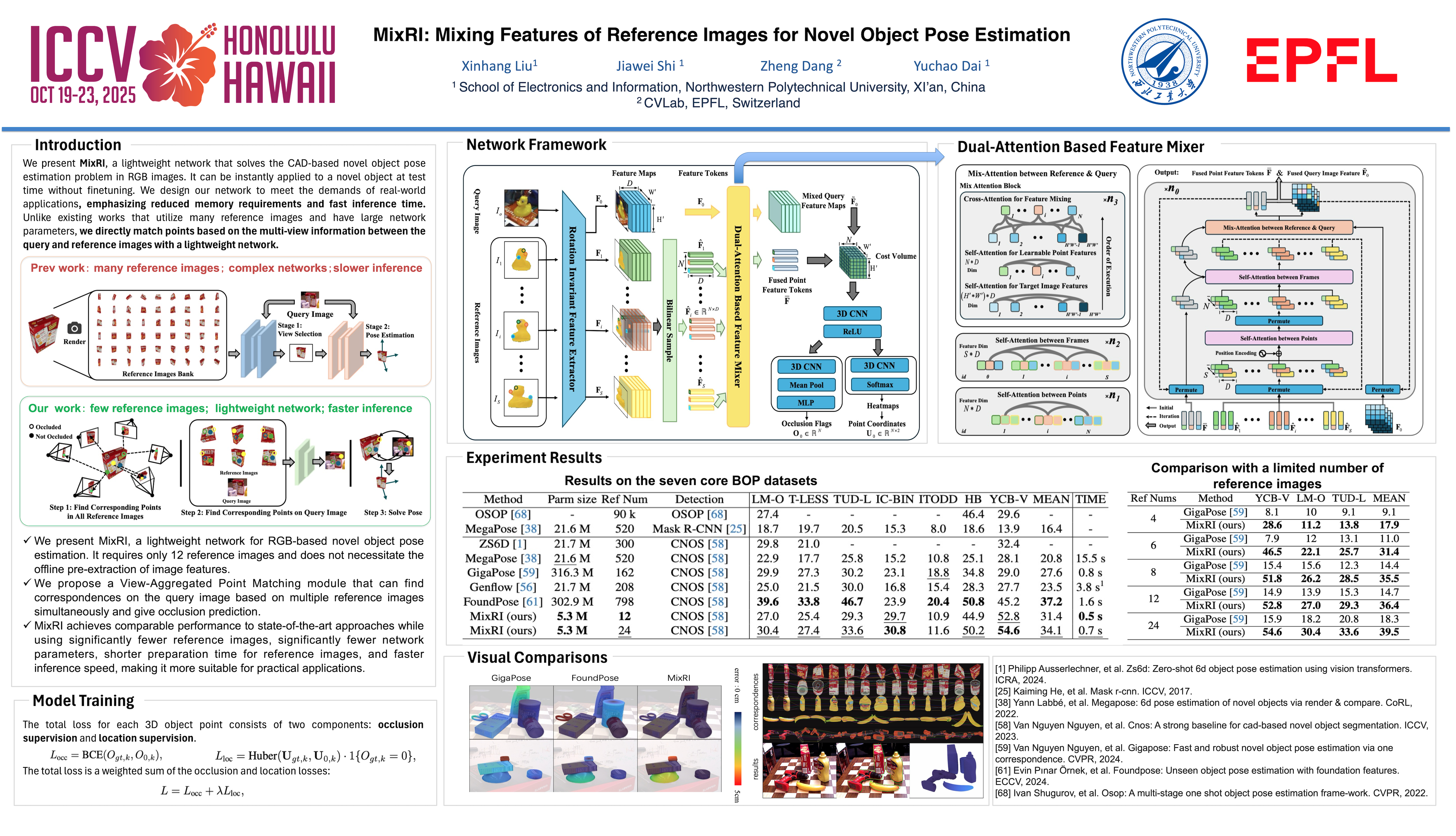 We present MixRI, a lightweight network that solves the CAD-based novel object pose estimation problem in RGB images. It can be instantly applied to a novel object at test time without finetuning. We design our network to meet the demands of real-world applications, emphasizing reduced memory requirements and fast inference time. Unlike existing works that utilize many reference images and have large network parameters, we directly match points based on the multi-view information between the query and reference images with a lightweight network. Thanks to our reference image fusion strategy, we significantly decrease the number of reference images, thereby decreasing the time needed to process these images and the memory required to store them. Furthermore, with our lightweight network, our method requires less inference time. Though with fewer reference images, experiments on seven core datasets in the BOP challenge show that our method achieves comparable results with other methods requiring more reference images and larger network parameters.