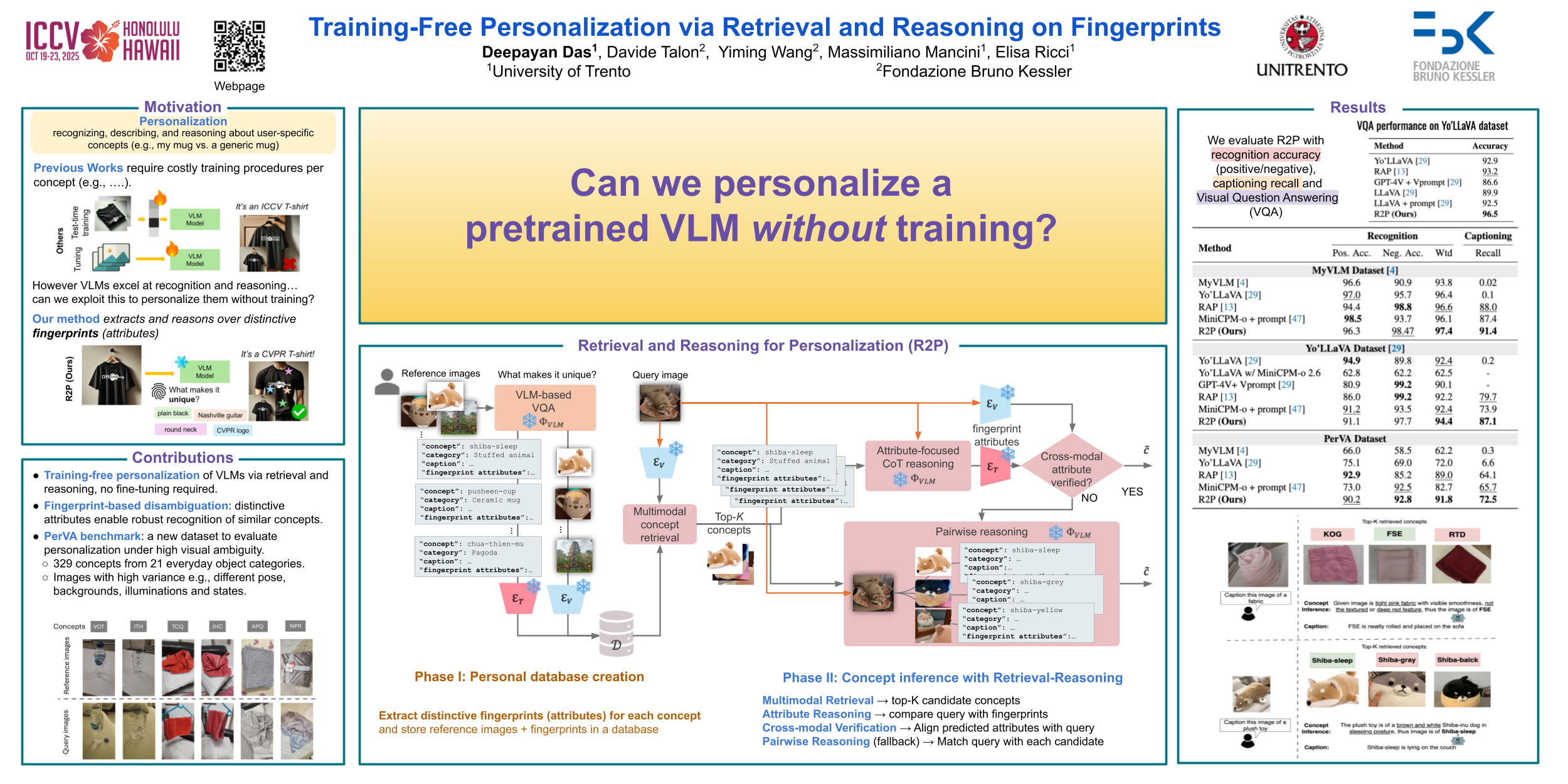 Vision Language Models (VLMs) have lead to major improvements in multimodal reasoning, yet they still struggle to understand user-specific concepts. Existing personalization methods address this limitation butheavily rely on training procedures, that can be either costly or unpleasant to individual users.We depart from existing work, and for the first time explore the training-free setting in the context of personalization. We propose a novel method, Retrieval and Reasoning for Personalization (R2P), leveraging internal knowledge of VLMs. First, we leverage VLMs to extract the concept fingerprint, i.e., key attributes uniquely defining the concept within its semantic class. When a query arrives, the most similar fingerprints are retrieved and scored via chain of thought reasoning. To reduce the risk of hallucinations, the scores are validated through cross-modal verification at the attribute level:in case of a discrepancy between the scores, R2P refines the concept association viapairwise multimodal matching, where the retrieved fingerprints and their images aredirectly compared with the query.We validate R2P on two publicly available benchmarks and a newly introduced dataset, Personal Concepts with Visual Ambiguity (PerVA), for concept identification highlighting challenges in visual ambiguity. R2P consistently outperforms state-of-the-art approaches on various downstream tasks across all benchmarks. Code will be available upon acceptance.