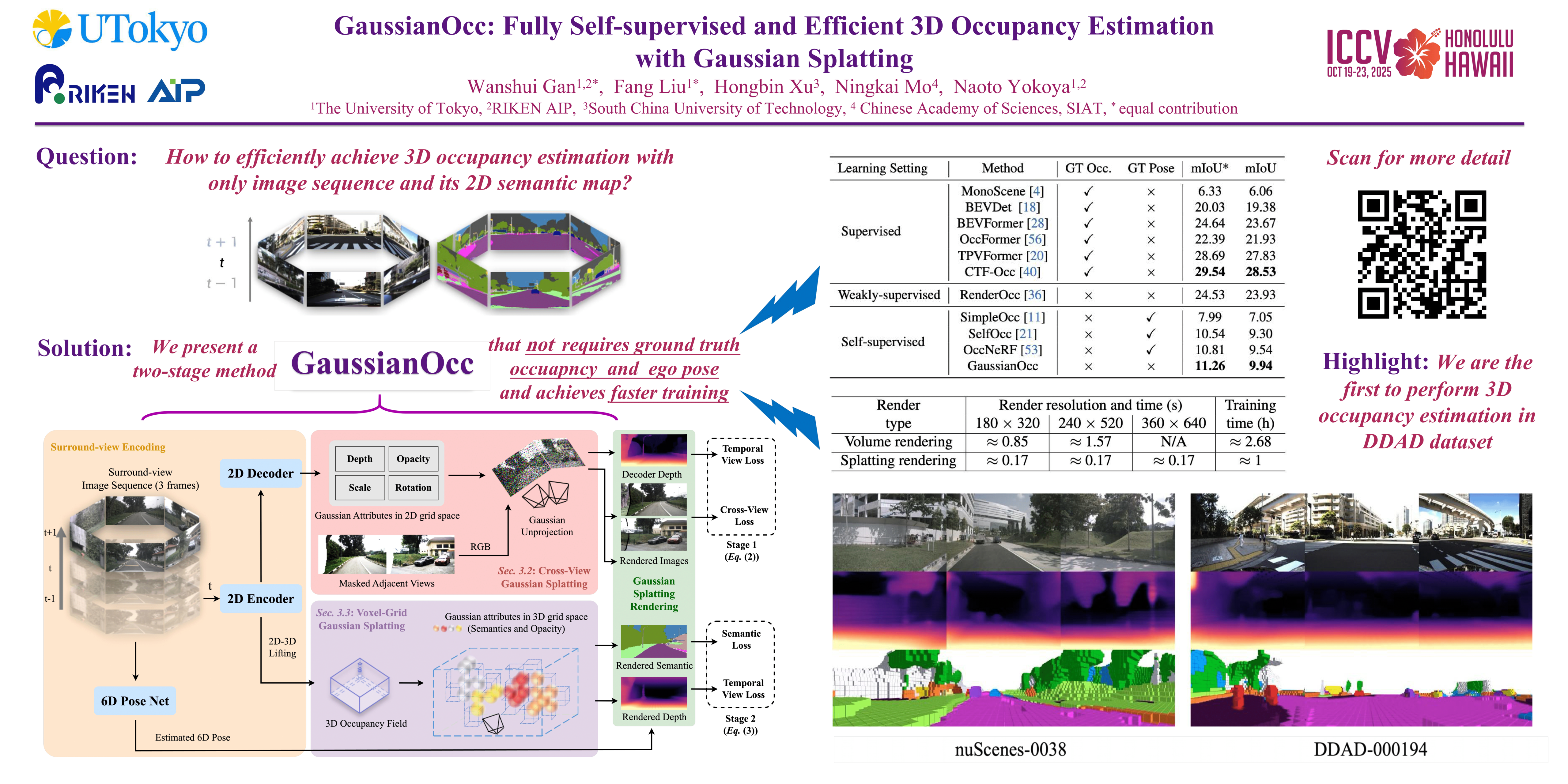 We introduce GaussianOcc, a systematic method that investigates Gaussian splatting for fully self-supervised and efficient 3D occupancy estimation in surround views. First, traditional methods for self-supervised 3D occupancy estimation still require ground truth 6D poses from sensors during training. To address this limitation, we propose Gaussian Splatting for Projection (GSP) module to provide accurate scale information for fully self-supervised training from adjacent view projection. Additionally, existing methods rely on volume rendering for final 3D voxel representation learning using 2D signals (depth maps, semantic maps), which is both time-consuming and less effective. We propose Gaussian Splatting from Voxel space (GSV) to leverage the fast rendering properties of Gaussian splatting. As a result, the proposed GaussianOcc method enables fully self-supervised (no ground truth pose) 3D occupancy estimation in competitive performance with low computational cost (2.7 times faster in training and 5 times faster in rendering).