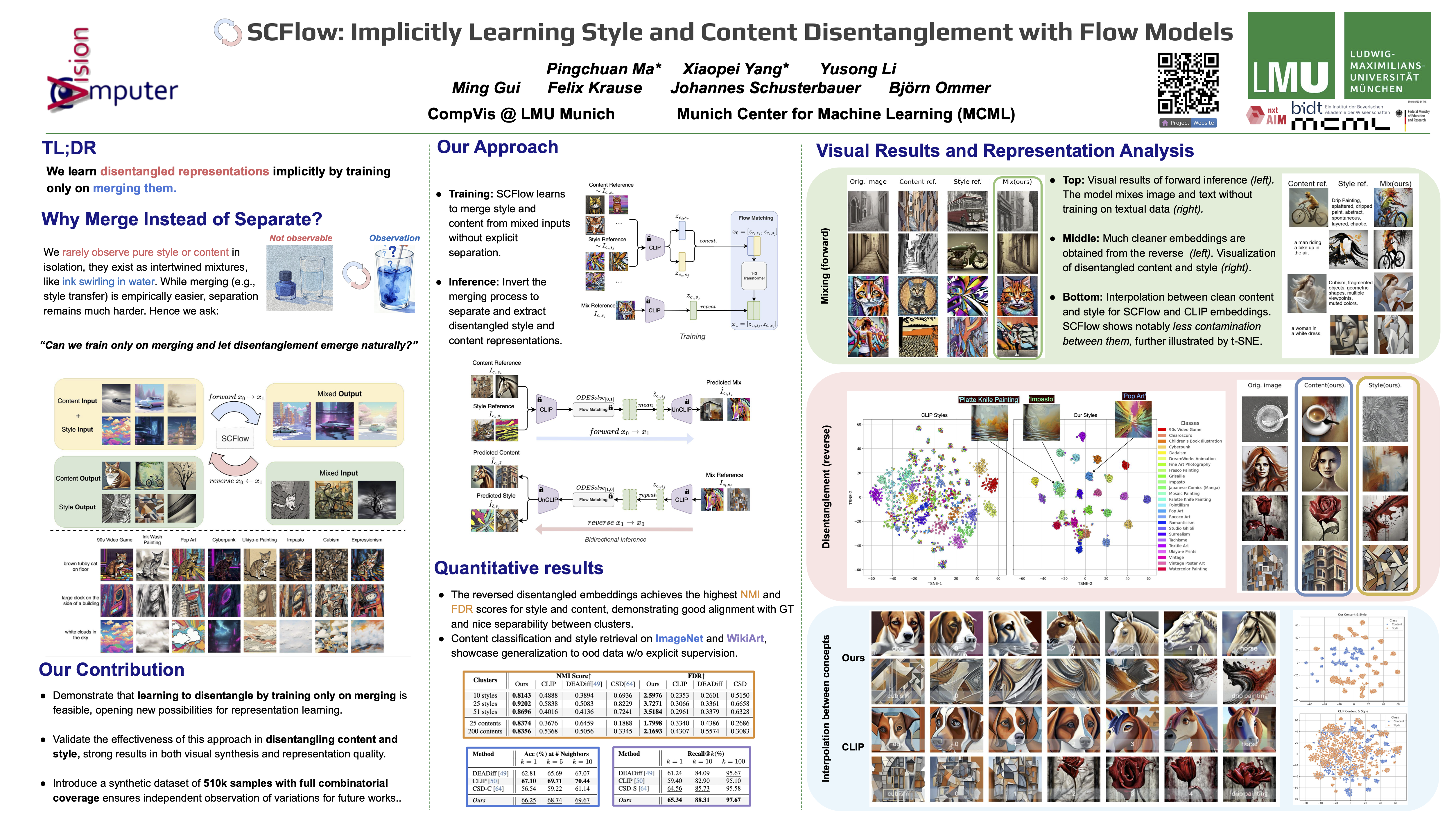 The human perception of style and content is inherently subjective and varies widely. Likewise, computer vision models learn diverse latent representations of these attributes. While generative models focus on stylization and content transfer, discriminative approaches aim to capture effective representations of style and content. However, explicitly defining these attributes remains inherently difficult. To address this, we propose a method that implicitly discovers style and content representations within a semantic-rich compact space, avoiding spatial token constraints. Leveraging flow matching, our framework effectively separates style and content without predefined definitions, offering a structured yet flexible representation that can be directly applied to any precomputed CLIP embeddings. To further facilitate this, we have curated a dataset of $510{,}000$ samples ($51$ styles $\times$ $10{,}000$ content samples) for training and evaluating our model. While our method provides a strong foundation for representation learning, it is also adaptable for controllable generation tasks. We demonstrated our implicitly learned style and content representations can generalize well to ImageNet-1k and WikiArt in a zero-shot fashion. We showcase promising visual results involving various styles and contents. \textit{We will release the code and the curated dataset.}