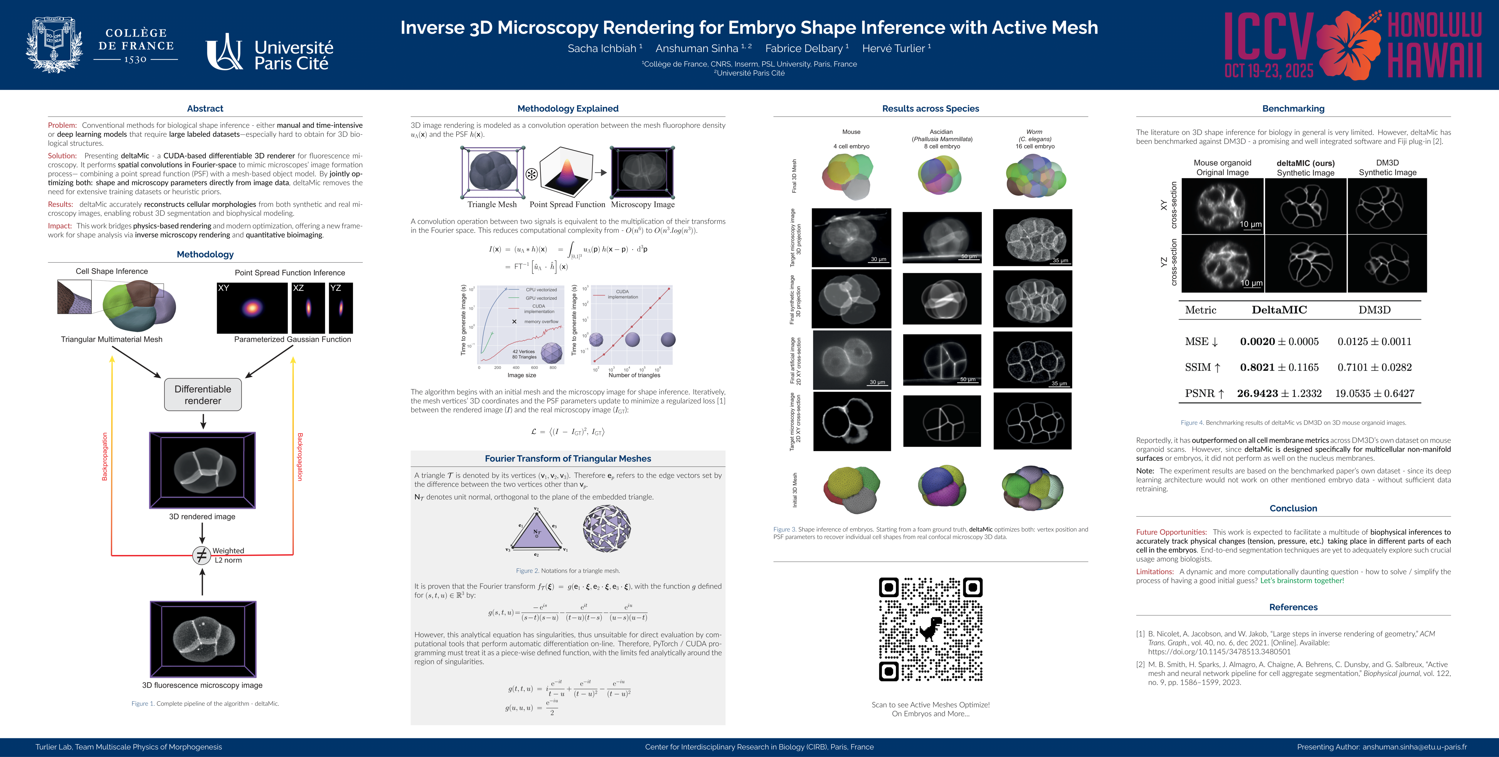 Traditional methods for biological shape inference, such as deep learning (DL) and active contour models, face limitations in 3D. DL requires large labeled datasets, which are difficult to obtain, while active contour models rely on fine-tuned hyperparameters for intensity attraction and regularization. We introduce deltaMic, a novel 3D differentiable renderer for fluorescence microscopy. By leveraging differentiable Fourier-space convolution, deltaMic accurately models the image formation process, integrating a parameterized microscope point spread function and a mesh-based object representation. Unlike DL-based segmentation, it directly optimizes shape and microscopy parameters to fit real microscopy data, removing the need for large datasets or heuristic priors. To enhance efficiency, we develop a GPU-accelerated Fourier transform for triangle meshes, significantly improving speed. We demonstrate deltaMic’s ability to reconstruct cellular shapes from synthetic and real microscopy images, providing a robust tool for 3D segmentation and biophysical modeling. This work bridges physics-based rendering with modern optimization techniques, offering a new paradigm for microscopy image analysis and inverse biophysical modeling.