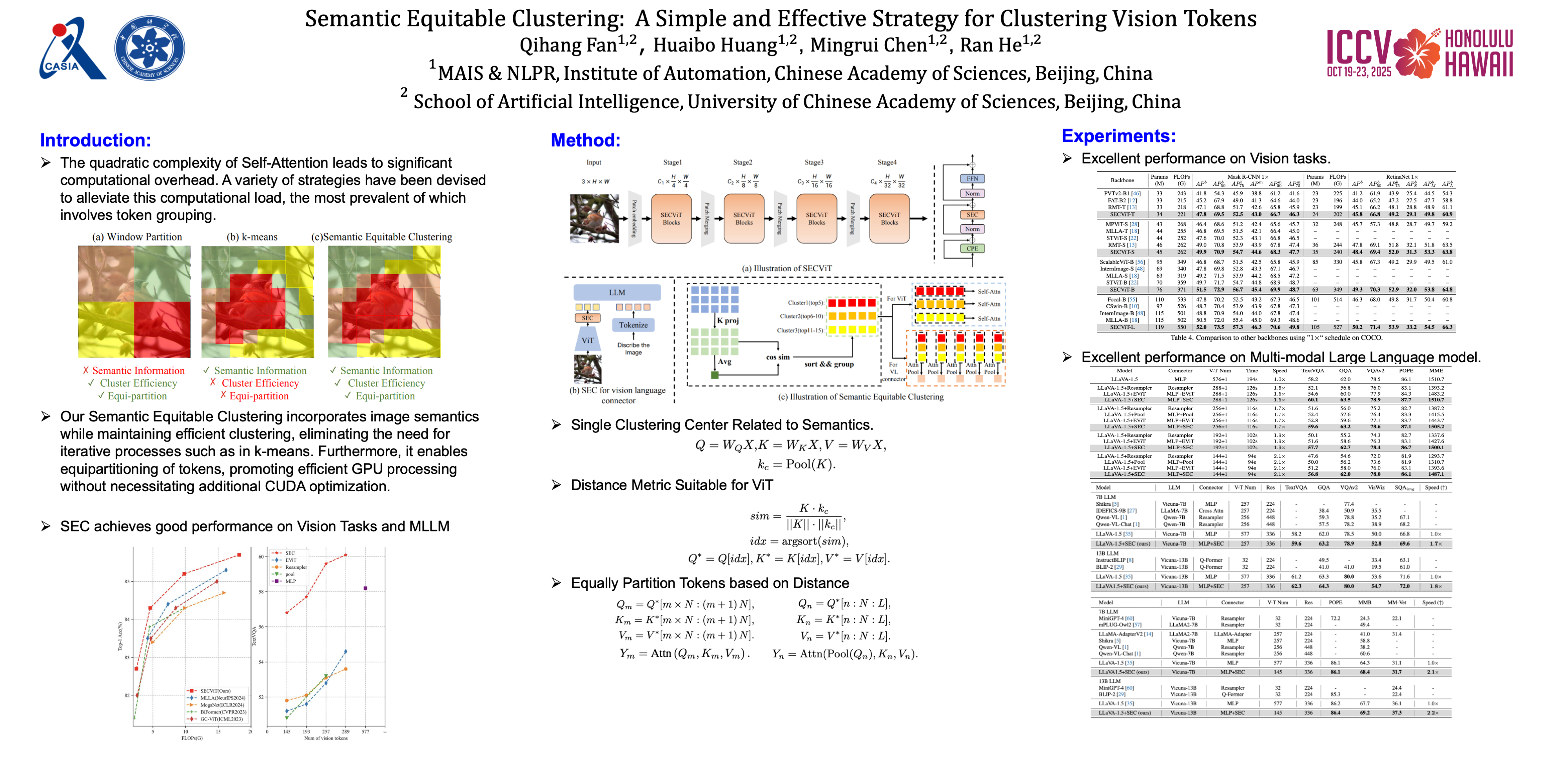 he Vision Transformer (ViT) has gained prominence for its superior relational modeling prowess. However, its global attention mechanism's quadratic complexity poses substantial computational burdens. A common remedy spatially groups tokens for self-attention, reducing computational requirements. Nonetheless, this strategy neglects semantic information in tokens, possibly scattering semantically-linked tokens across distinct groups, thus compromising the efficacy of self-attention intended for modeling inter-token dependencies. Motivated by these insights, we introduce a fast and balanced clustering method, named Semantic Equitable Clustering (SEC). SEC clusters tokens based on their global semantic relevance in an efficient, straightforward manner. In contrast to traditional clustering methods requiring multiple iterations, our method achieves token clustering in a single pass. Additionally, SEC regulates the number of tokens per cluster, ensuring a balanced distribution for effective parallel processing on current computational platforms without necessitating further optimization. Capitalizing on SEC, we propose a versatile vision backbone, SECViT. Comprehensive experiments in image classification, object detection, instance segmentation, and semantic segmentation validate to the effectiveness of SECViT. Remarkably, SECViT attains an impressive 84.3% image classification accuracy with only 27M parameters and 4.6G FLOPs, without the need for for additional supervision or data. Moreover, SEC can be conveniently and swiftly applied to multimodal large language models (MLLM), such as LLaVA, to serve as a vision language connector, effectively accelerating the model’s efficiency while maintaining unchanged or better performance.