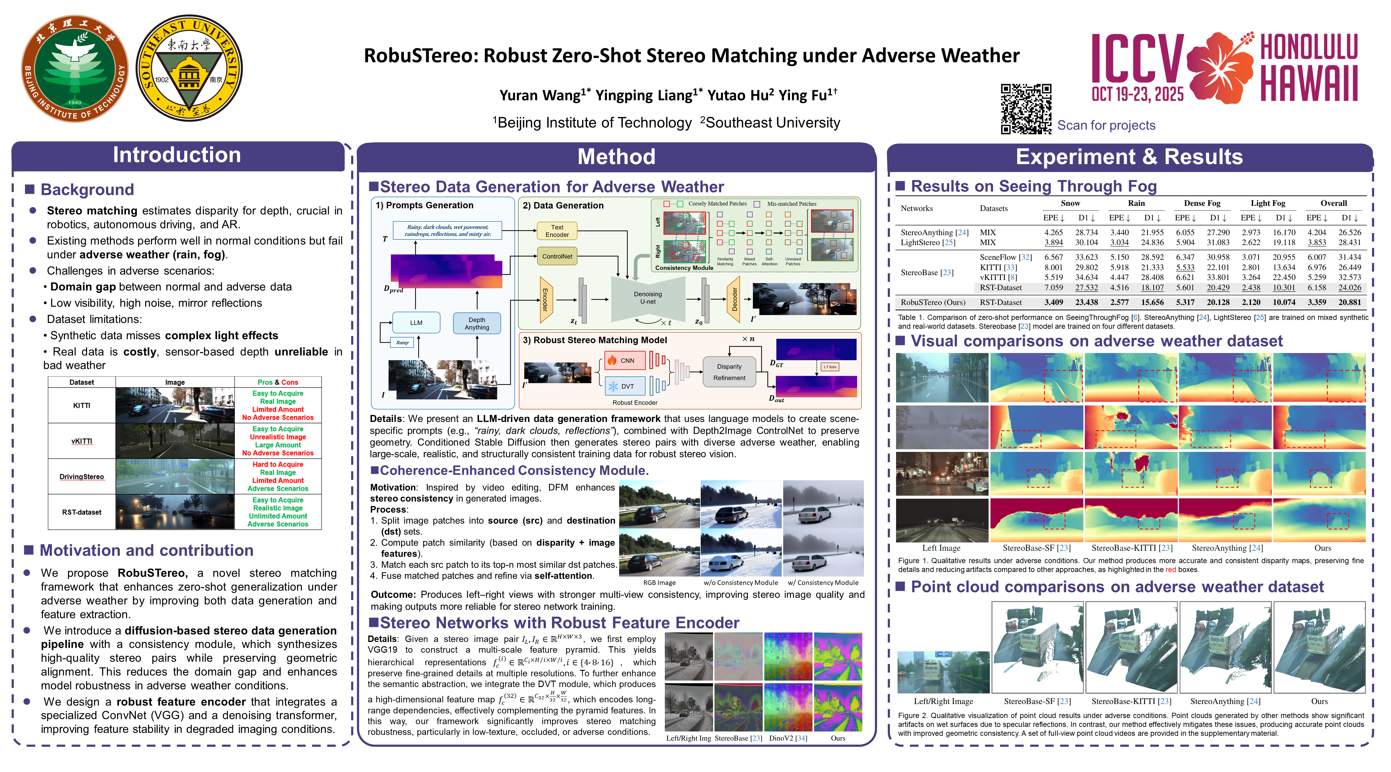 Learning-based stereo matching models struggle in adverse weather conditions due to the scarcity of corresponding training data and the challenges in extracting discriminative features from degraded images. These limitations significantly hinder zero-shot generalization to out-of-distribution weather conditions. In this paper, we propose RobuSTereo a novel framework that enhances the zero-shot generalization of stereo matching models under adverse weather by addressing both data scarcity and feature extraction challenges. First, we introduce a diffusion-based simulation pipeline with a stereo consistency module, which generates high-quality stereo data tailored for adverse conditions. By training stereo matching models on our synthetic datasets, we reduce the domain gap between clean and degraded images, significantly improving the models’ robustness to unseen weather conditions. The stereo consistency module ensures structural alignment across synthesized image pairs, preserving geometric integrity and enhancing depth estimation accuracy. Second, we design a robust feature encoder that combines a specialized ConvNet with a denoising transformer to extract stable and reliable features from degraded images. The ConvNet captures fine-grained local structures, while the denoising transformer refines global representations, effectively mitigating the impact of noise, low visibility, and weather-induced distortions. This enables more accurate disparity estimation even under challenging visual conditions. Extensive experiments demonstrate that RobuSTereo significantly improves the robustness and generalization of stereo matching models across diverse adverse weather scenarios.