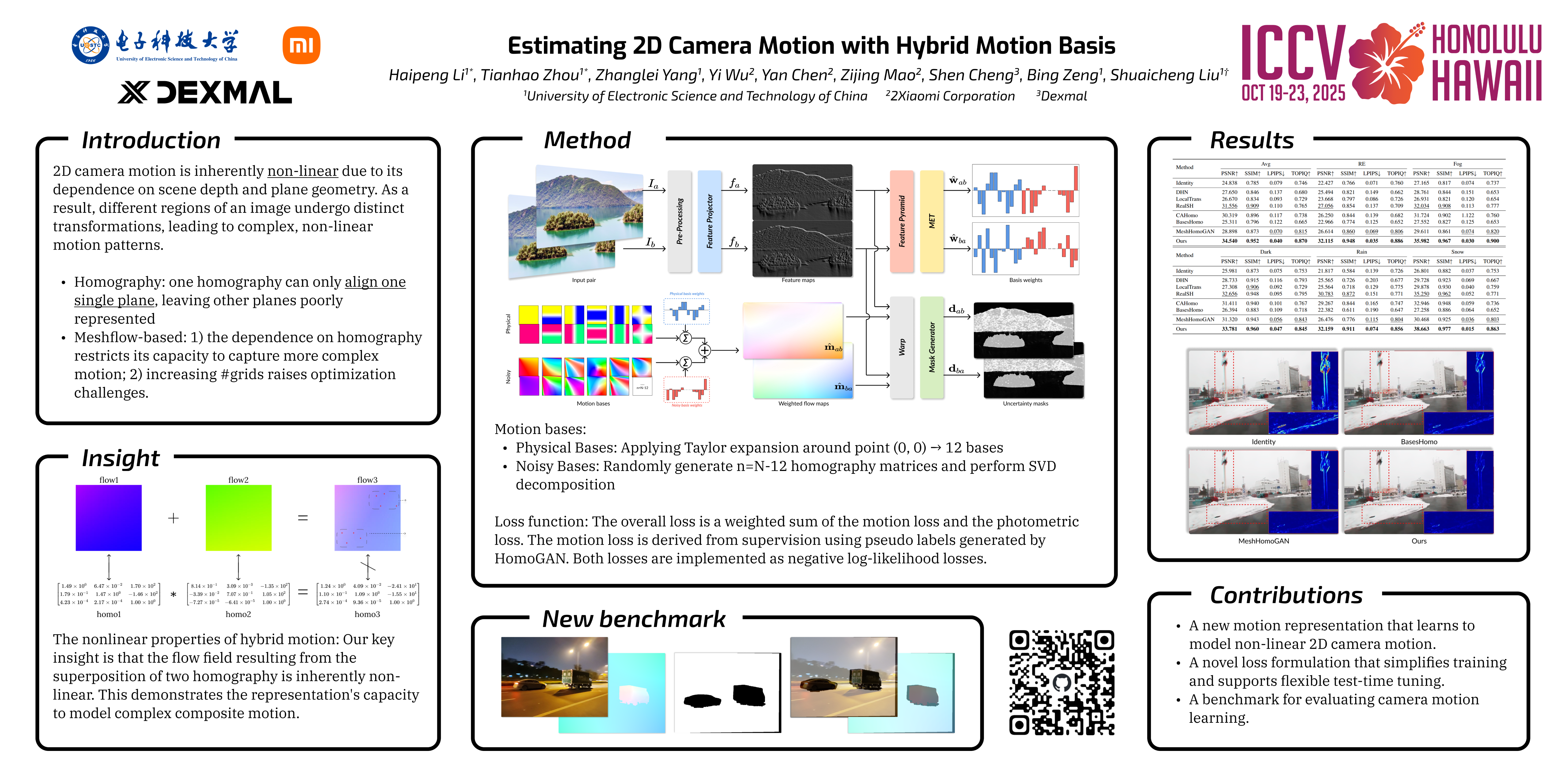 Estimating 2D camera motion is a fundamental task in computer vision, representing the non-linear projection of 3D rotation and translation onto a 2D plane. Current methods primarily rely on homography-based approaches, which model perspective transformations for planar scenes, or meshflow-based techniques, which utilize grid-based local homographies to accommodate non-linear motion. However, homography is restricted to dominant planes and meshflow’s nonlinear capacity remains limited. To address these challenges, we introduce CamFlow, a novel representation that captures non-linear 2D camera motion through the use of hybrid motion bases: 1) physical bases to model essential motion patterns and 2) noisy motion bases to enhance flexibility. In addition, we propose a hybrid probabilistic loss function, leveraging a Laplace distribution to improve robustness and facilitate efficient training.We also design a test-time adaptation strategy to refine motion estimates for video stabilization in unseen video contexts. To evaluate the camera motion, we propose a new benchmark by masking dynamic objects in existing optical flow datasets. Extensive experiments, including zero-shot evaluations across diverse conditions, demonstrate that CamFlow outperforms state-of-the-art homography and meshflow methods in terms of robustness and generalization.Code and dataset will be released upon publication.