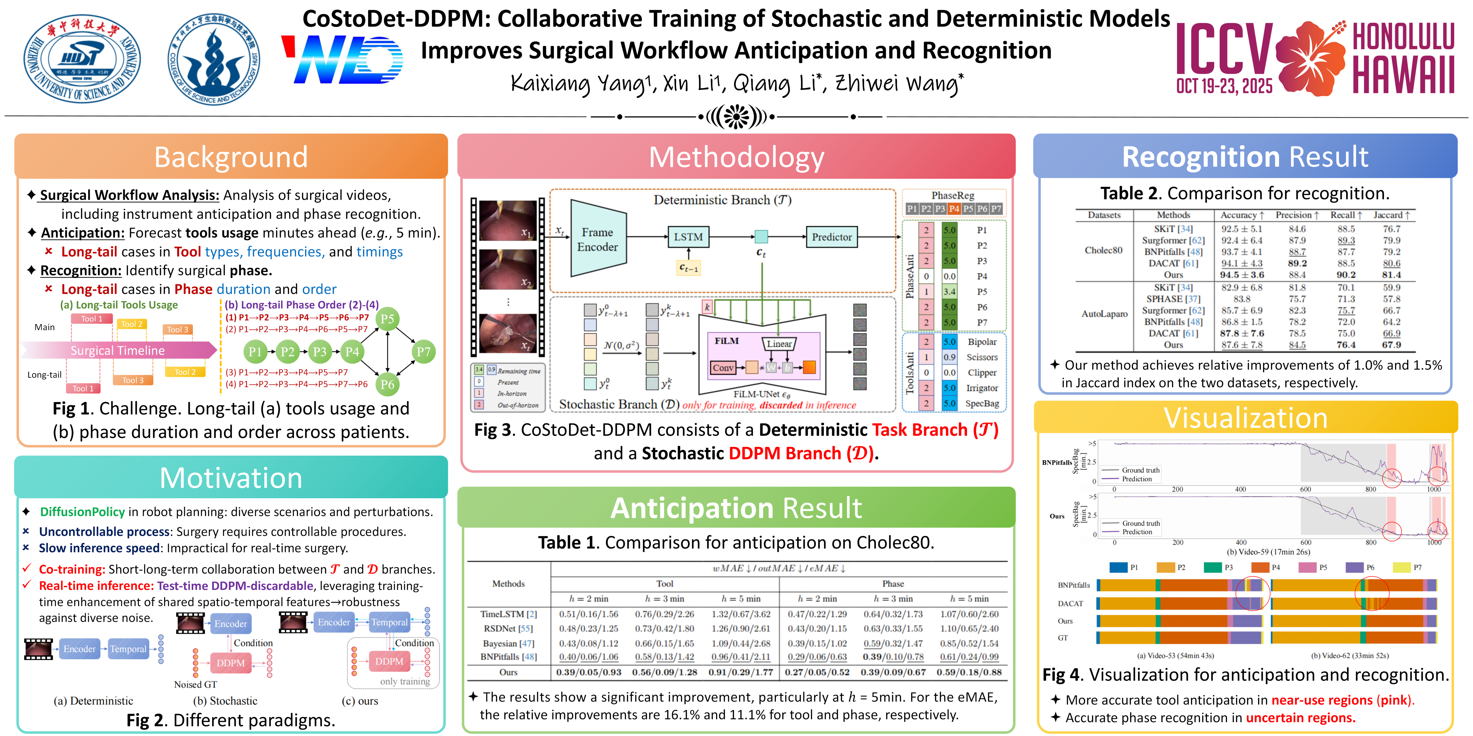 Anticipating and recognizing surgical workflows are critical for intelligent surgical assistance systems. However, existing methods rely on deterministic decision-making, struggling to generalize across the large anatomical and procedural variations inherent in real-world surgeries. In this paper, we introduce an innovative framework that incorporates stochastic modeling through a denoising diffusion probabilistic model (DDPM) into conventional deterministic learning for surgical workflow analysis. At the heart of our approach is a collaborative co-training paradigm: the DDPM branch captures procedural uncertainties to enrich feature representations, while the task branch focuses on predicting surgical phases and instrument usage. Theoretically, we demonstrate that this mutual refinement mechanism benefits both branches: the DDPM reduces prediction errors in uncertain scenarios, and the task branch directs the DDPM toward clinically meaningful representations. Notably, the DDPM branch is discarded during inference, enabling real-time predictions without sacrificing accuracy. Experiments on the Cholec80 dataset show that for the anticipation task, our method achieves a 16% reduction in eMAE compared to state-of-the-art approaches, and for phase recognition, it improves the Jaccard score by 1.0%. Additionally, on the AutoLaparo dataset, our method achieves a 1.5% improvement in the Jaccard score for phase recognition, while also exhibiting robust generalization to patient-specific variations. Our code and weight will be available.