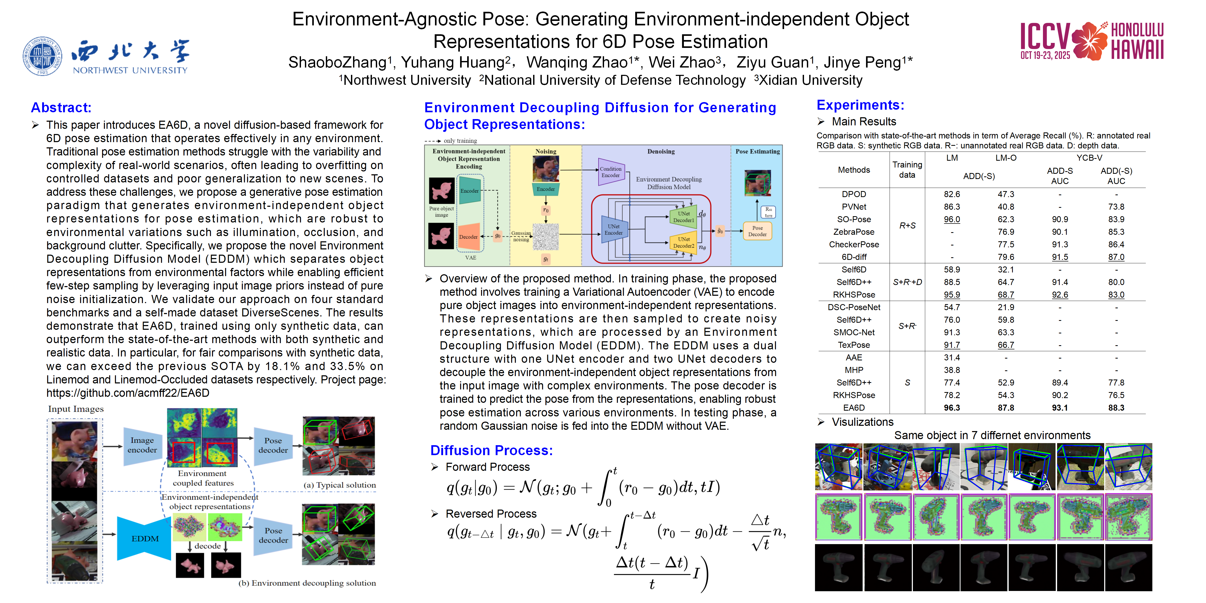 This paper introduces EA6D, a novel diffusion-based framework for 6D pose estimation that operates effectively in any environment. Traditional pose estimation methods struggle with the variability and complexity of real-world scenarios, often leading to overfitting on controlled datasets and poor generalization to new scenes. To address these challenges, we propose a generative pose estimation paradigm that generates environment-independent object representations for pose estimation, which are robust to environmental variations such as illumination, occlusion, and background clutter. Specifically, we propose the novel Environment Decoupling Diffusion Models (EDDM) which separates object representations from environmental factors while enabling efficient few-step sampling by leveraging input image priors instead of pure noise initialization. We validate our approach on four standard benchmarks and a self-made dataset DiverseScenes. The results demonstrate that EA6D, trained using only synthetic data, can outperform the state-of-the-art methods with both synthetic and realistic data. In particular, for fair comparisons with synthetic data, we can exceed the previous SOTA by $18.1\%$ and $33.5\%$ on LINEMOD and Linemod-Occluded datasets respectively.