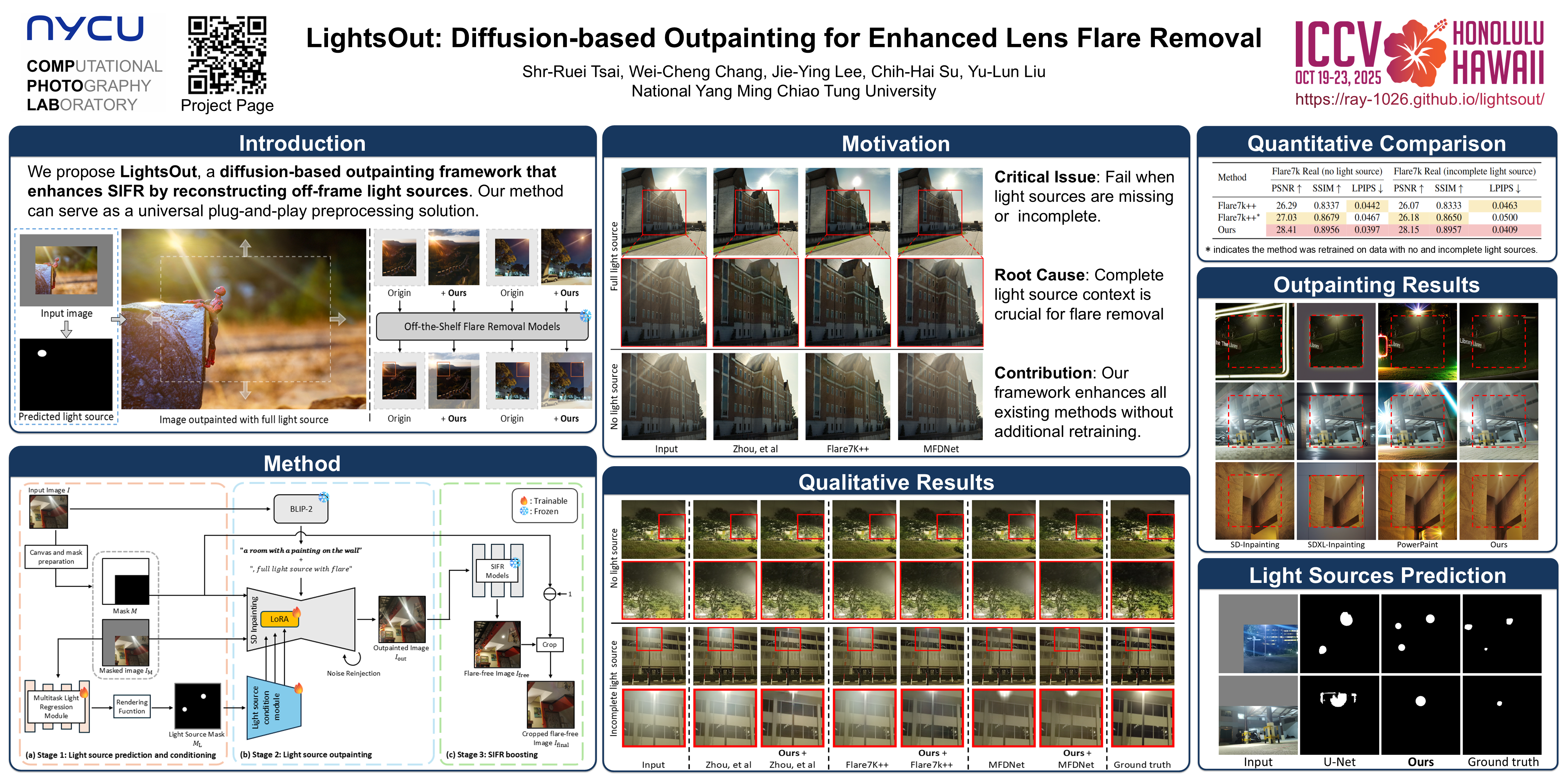 Lens flare significantly degrades image quality, impacting critical computer vision tasks like object detection and autonomous driving. Recent Single Image Flare Removal (SIFR) methods perform poorly when off-frame light sources are incomplete or absent. We propose LightsOut, a diffusion-based outpainting framework tailored to enhance SIFR by reconstructing off-frame light sources. Our method leverages a multitask regression module and LoRA fine-tuned diffusion model to ensure realistic and physically consistent outpainting results. Comprehensive experiments demonstrate LightsOut consistently boosts the performance of existing SIFR methods across challenging scenarios without additional retraining, serving as a universally applicable plug-and-play preprocessing solution.