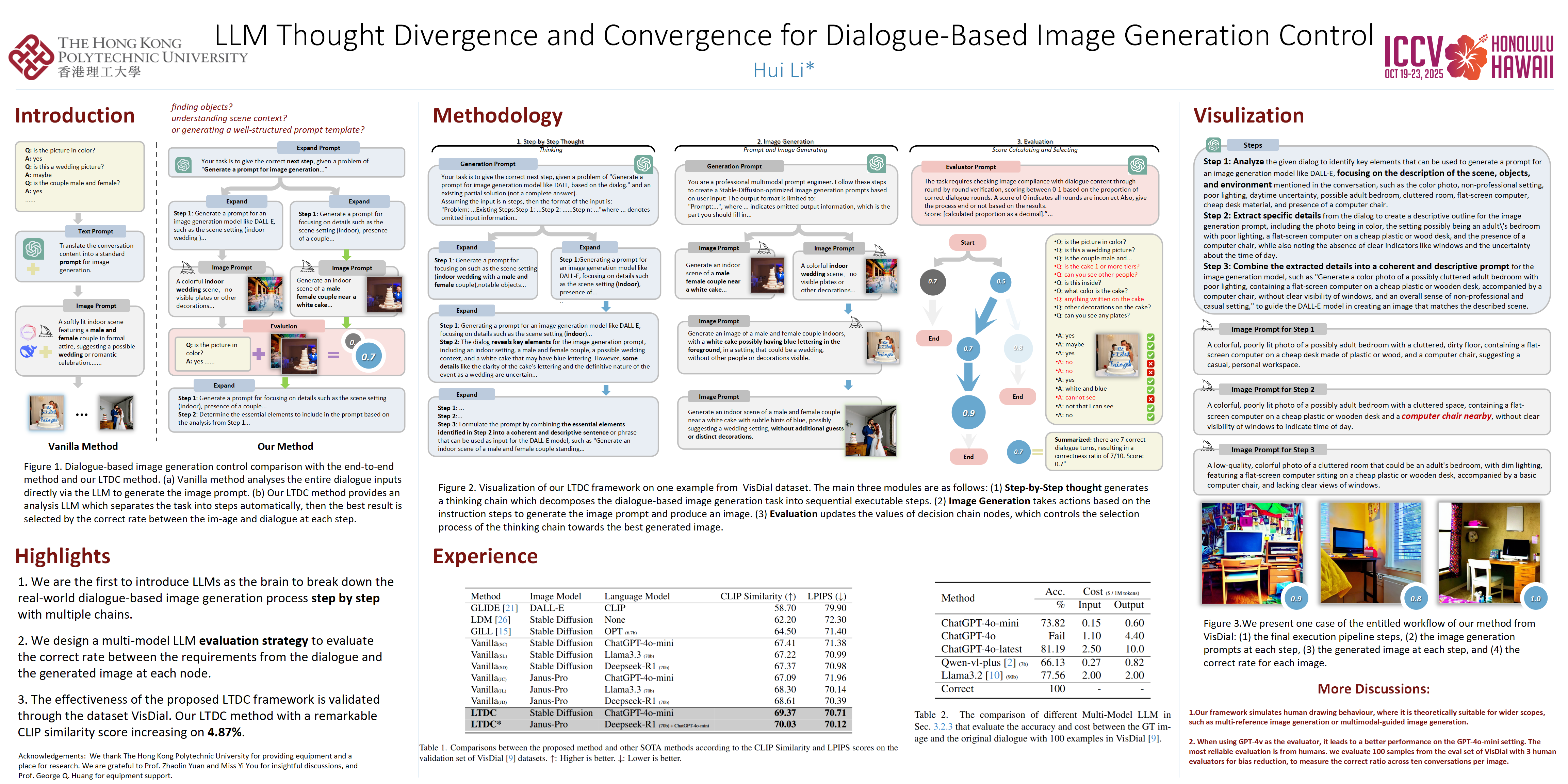 Generative AI (GenAI), which revolutionized both computer vision and natural language processing, has drawn continuous attention recently. Benefits from GenAI with the evolution of large language models (LLMs), the image generation task evolved from prompt-based to dialogue-based, which takes the real-world human intent expressed through conversations. When breaking this task into multiple steps, the best pathway of analyzing the dialogues is not determined, such as whether the objects or prompted template should be focused on the first step of dialogues analyzing. Thus, a multi-chain reasoning is requested to decompose this application beyond a pure chain-of-thought structure. After the divergent process, the question comes to how to converge the thinking chain that leads to the best matched image, which requires a new evaluation method to lead the thinking process. To address these challenges, we propose the LLM Thought Divergence and Convergence (LTDC) framework, which simulates human cognitive processes through three phases: (1) The Step-by-Step Thought process decomposes dialogue-based image generation tasks into sequential thinking chains using LLMs; (2) The Image Generation process creates image prompts following these thought instructions and produces corresponding images; (3) The Evaluation process aligns the coherence between generated images and dialogues through a multi-modal LLM, guiding the selection of optimal thinking chains. Evaluated on VisDial, our LTE framework achieves a 4.87\% improvement in CLIP similarity, demonstrating the effectiveness in generating images with higher semantic fidelity.