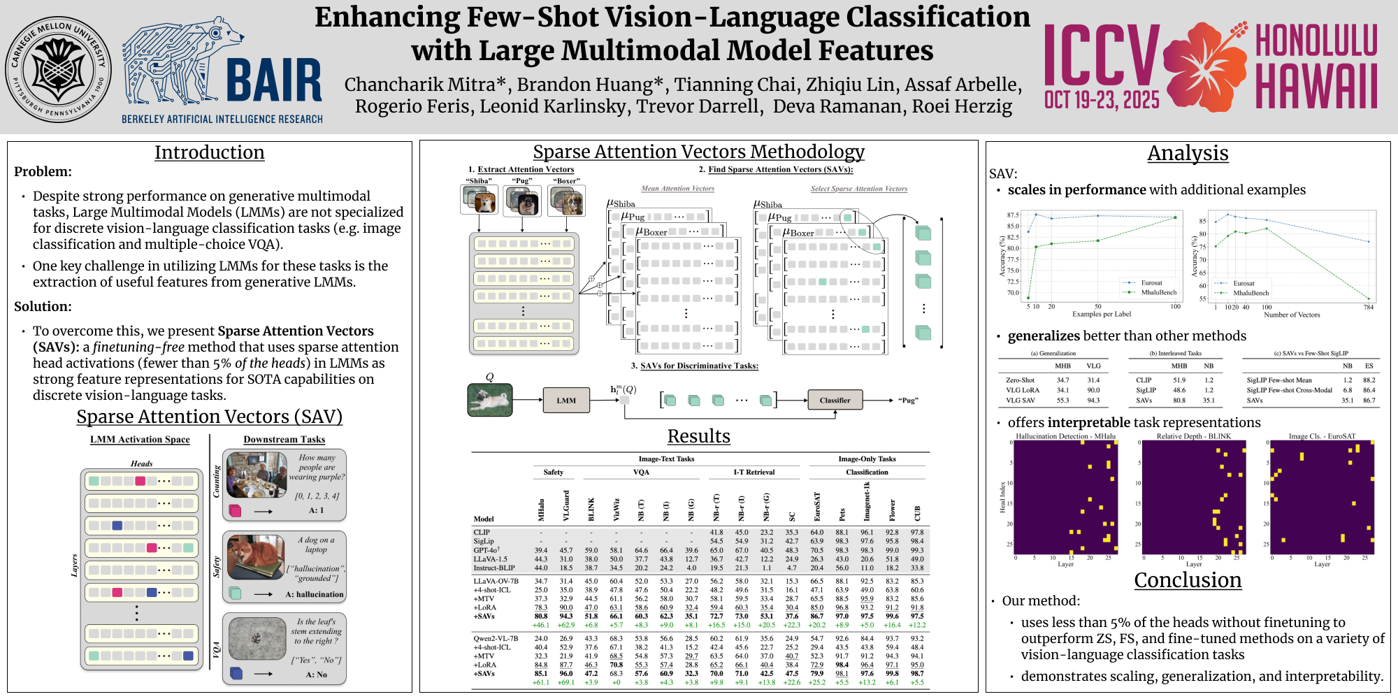 Generative Large Multimodal Models (LMMs) like LLaVA and Qwen-VL excel at a wide variety of vision-language (VL) tasks. Despite strong performance, LMMs' generative outputs are not specialized for vision-language classification tasks (i.e., tasks with vision-language inputs and discrete labels) such as image classification and multiple-choice VQA.One key challenge in utilizing LMMs for these tasks is the extraction of useful features from generative LMMs.To overcome this, we propose an approach that leverages multimodal feature extraction from the LMM's latent space.Toward this end, we present Sparse Attention Vectors (SAVs)---a finetuning-free method that leverages sparse attention head activations (fewer than 5% of the heads) in LMMs as strong feature representations.With only few-shot examples, SAVs demonstrate state-of-the-art performance compared to a variety of few-shot and finetuned baselines on a collection of vision-language classification tasks.Our experiments also imply that SAVs can scale in performance with additional examples and generalize to similar tasks, establishing SAVs as both effective and robust multimodal feature representations.