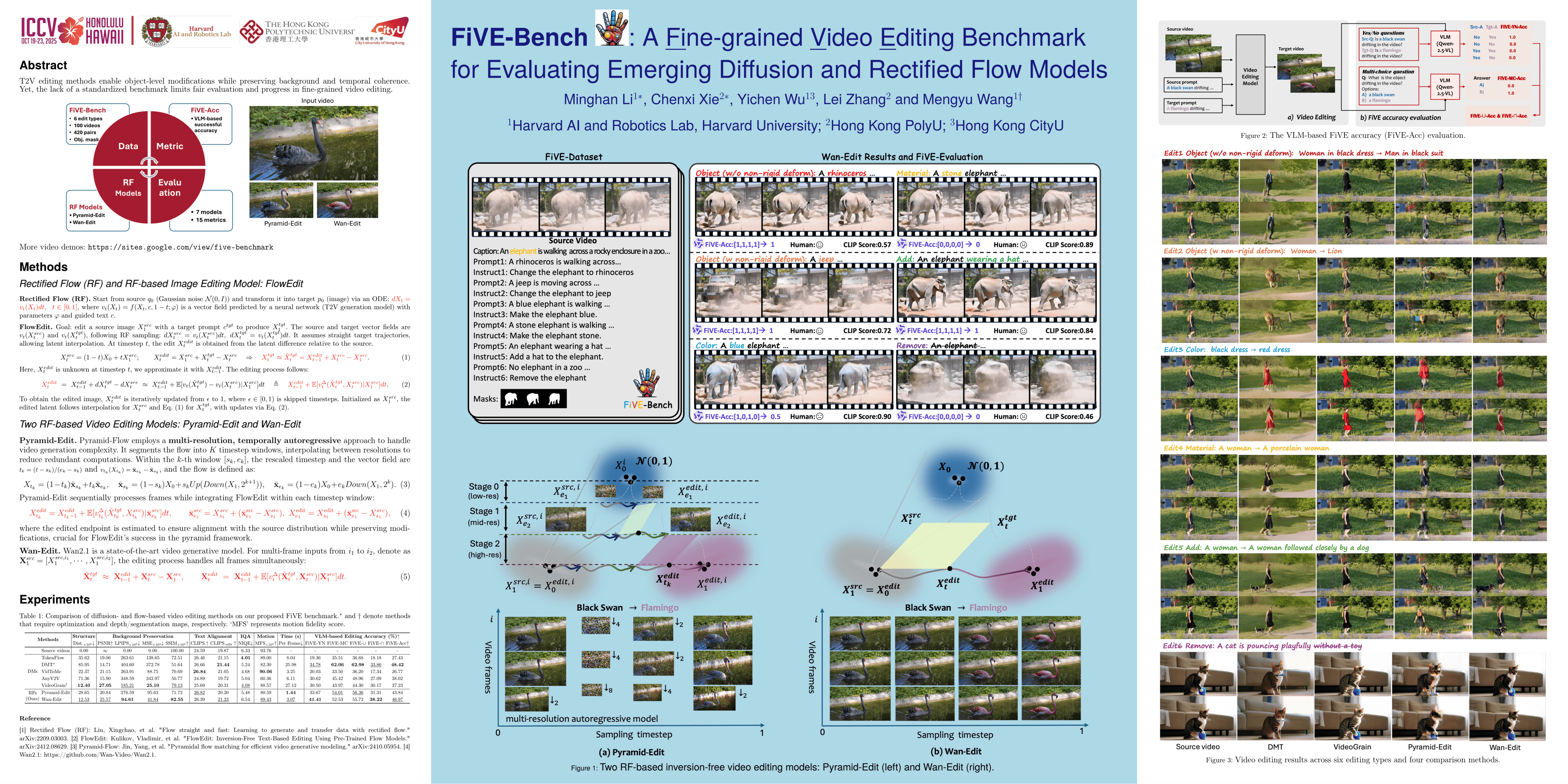 Numerous text-to-video (T2V) editing methods have emerged recently, but the lack of a standardized benchmark for fair evaluation has led to inconsistent claims and an inability to assess model sensitivity to hyperparameters. Fine-grained video editing is crucial for enabling precise, object-level modifications while maintaining context and temporal consistency. To address this, we introduce FiVE, a Fine-grained Video Editing Benchmark for evaluating emerging diffusion and rectified flow models. Our benchmark includes 74 real-world videos and 26 generated videos, featuring 6 fine-grained editing types, 420 object-level editing prompt pairs, and their corresponding masks.Additionally, we adapt the latest rectified flow (RF) T2V generation models—Pyramid-Flow and Wan2.1—by introducing FlowEdit, resulting in training-free and inversion-free video editing models Pyramid-Edit and Wan-Edit. We compare six diffusion-based editing methods with our proposed two RF-based editing methods on our proposed FiVE benchmark, evaluating them across 14 metrics. These metrics include background preservation, text-video similarity, temporal consistency, and generated video quality. To further enhance object-level evaluation, we introduce FiVE-Acc, a novel metric leveraging Vision-Language Models (VLMs) to assess the success of fine-grained video editing. Experimental results demonstrate that RF-based editing significantly outperforms diffusion-based methods, with Wan-Edit achieving the best overall performance and exhibiting the least sensitivity to hyperparameters. More video demo available on the anonymous website: https://sites.google.com/view/five-benchmark.