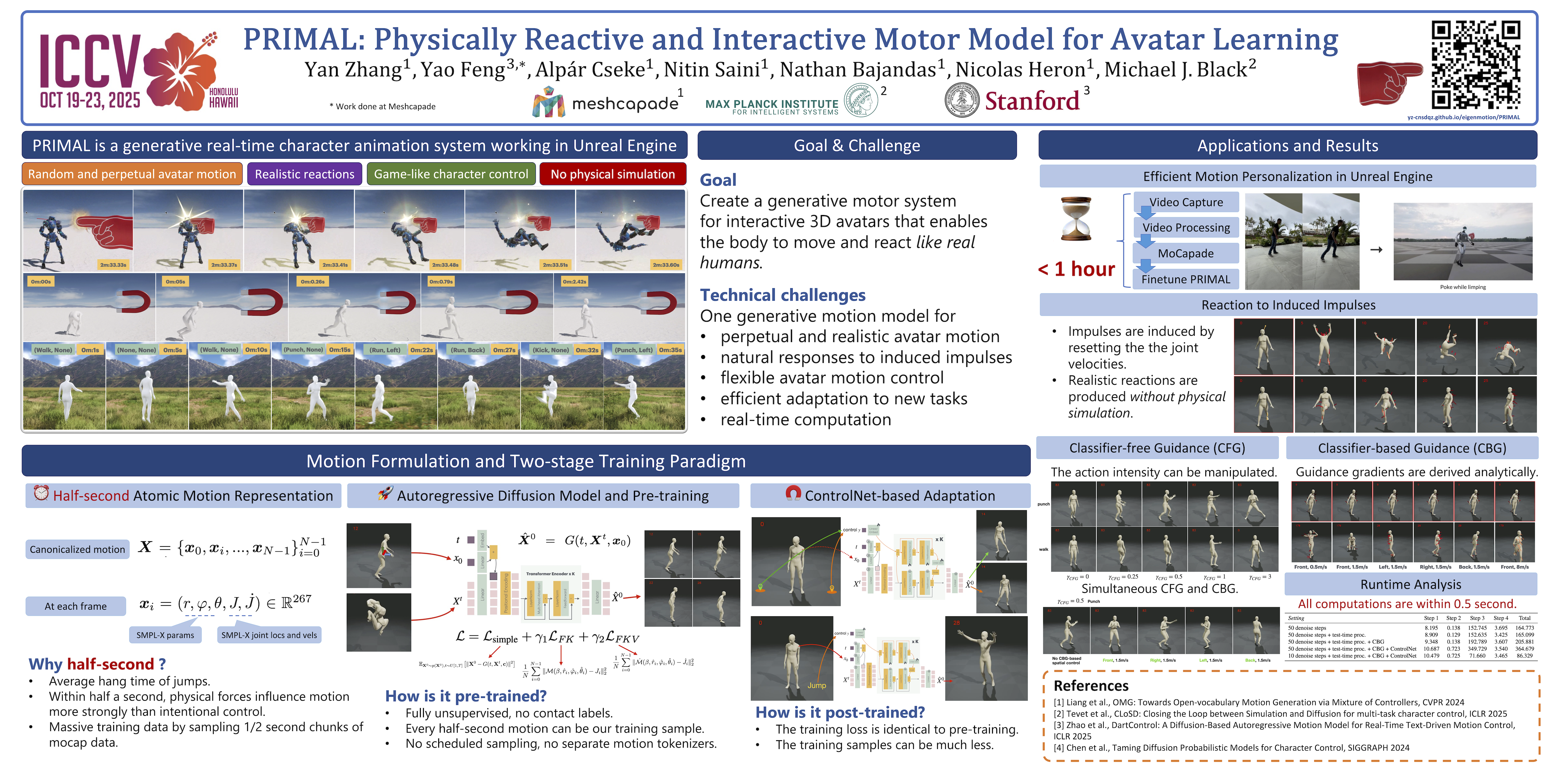 To build a motor system of the interactive avatar, it is essential to develop a generative motion model, which at least can drive the body to move in 3D space in a perpetual, realistic, controllable, and responsive manner. Although motion generation has been extensively studied in the past, most methods can be hardly regarded as embodied intelligence, due to their offline setting, slow speed, limited motion lengths, unnaturalness, and more. To overcome these limitations, we propose PRIMAL, an autoregressive diffusion model that is learned with a two-stage paradigm, inspired by recent advances of foundation models. In the pretraining stage, we let the model concentrate on learning motion dynamics from a large number of sub-second motion segments. In the adaptation phase, we propose a generic ControlNet-like adaptor, and fine-tune it on semantic action generation and spatial target reaching. Experiments show that physics effects emerge in our results. Given a single-frame initial state, our model not only generates unbounded, realistic, and controllable motion, but also enables the avatar to be responsive to induced impulses in real time. In addition, we can effectively and efficiently adapt our base model to few-shot personalized actions and the task of spatial control. Evaluations show that our proposed methods outperform state-of-the-art baselines. Based on these advantages, we build a real-time character animation system in Unreal Engine, making them ``alive''.