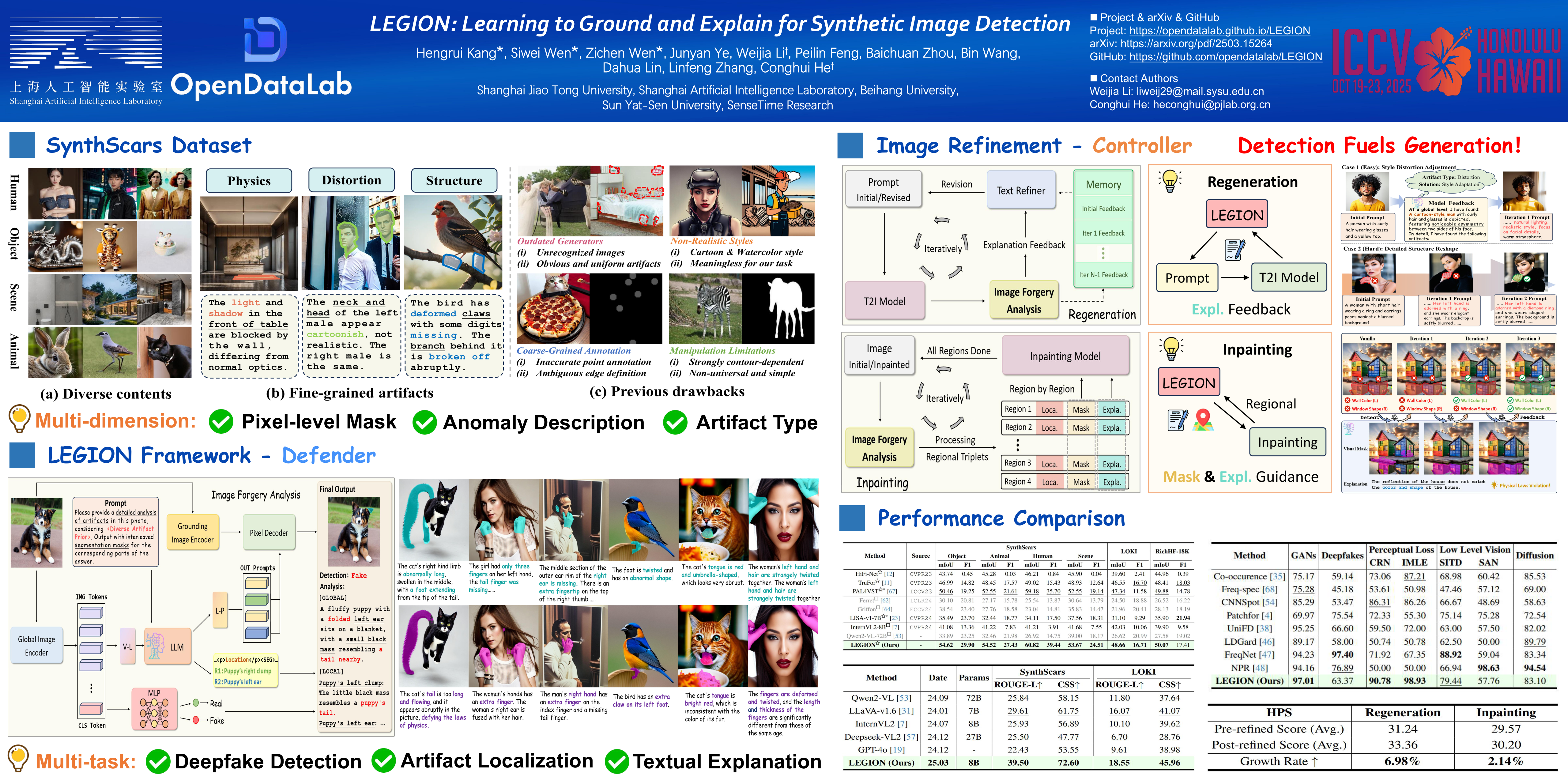 The rapid advancements in generative technology have emerged as a double-edged sword. While offering powerful tools that enhance convenience, they also pose significant social concerns. As defenders, current synthetic image detection methods often lack artifact-level textual interpretability and are overly focused on image manipulation detection, and current datasets usually suffer from outdated generators and a lack of fine-grained annotations. In this paper, we introduce SynthScars, a high-quality and diverse dataset consisting of 12,236 fully synthetic images with human-expert annotations. It features 4 distinct image content types, 3 categories of artifacts, and fine-grained annotations covering pixel-level segmentation, detailed textual explanations, and artifact category labels. Furthermore, we propose LEGION (LEarning to Ground and explain for Synthetic Image detectiON), a multimodal large language model~(MLLM)-based image forgery analysis framework that integrates artifact detection, segmentation, and explanation.Building upon this capability, we further explore LEGION as a controller, integrating it into image refinement pipelines to guide the generation of higher-quality and more realistic images. Extensive experiments show that LEGION outperforms existing methods across multiple benchmarks, particularly surpassing the second-best traditional expert on SynthScars by 3.31\% in mIoU and 7.75\% in F1 score. Moreover, the refined images generated under its guidance exhibit stronger alignment with human preferences. The code, model, and dataset will be released.