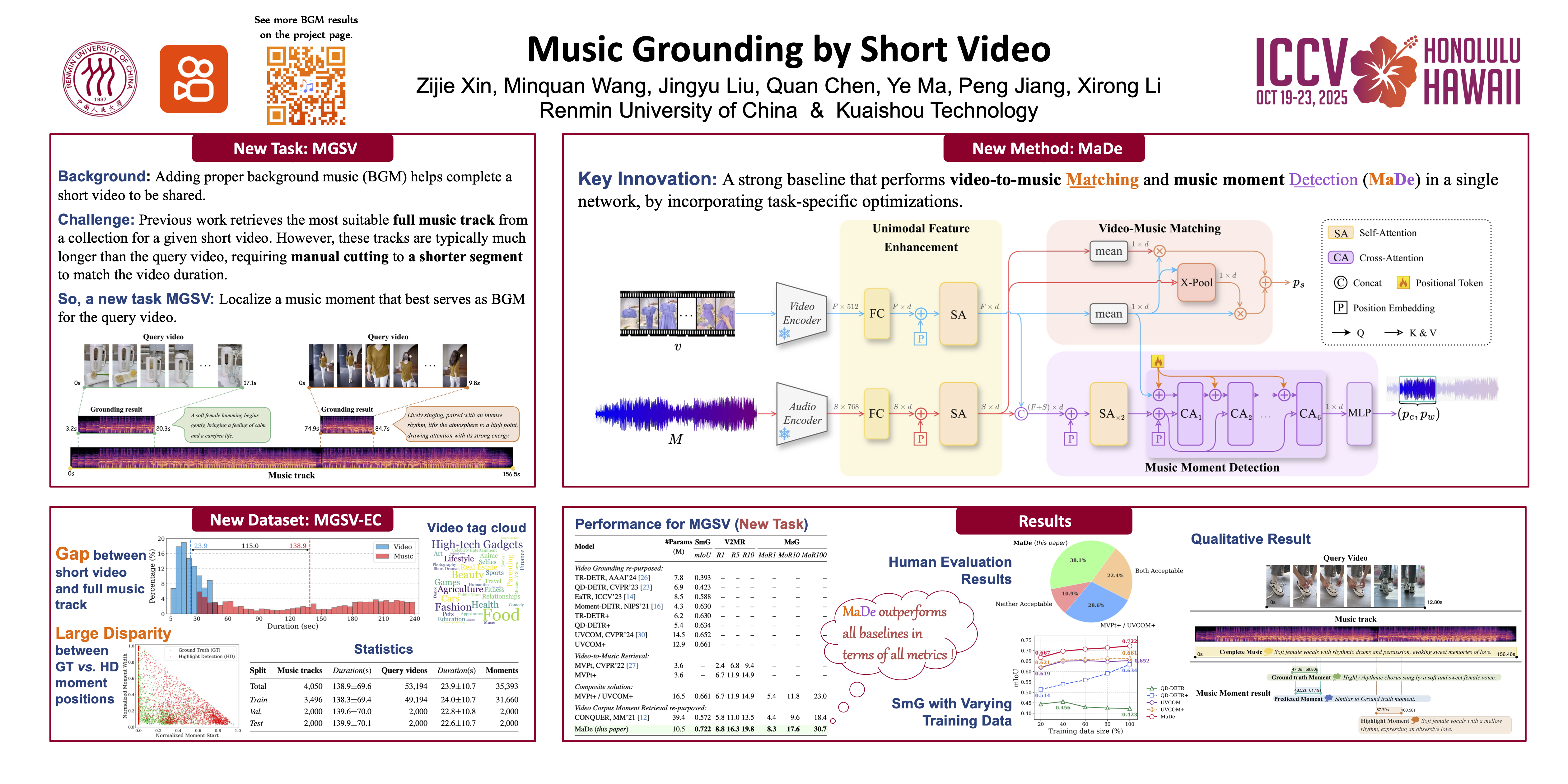 Adding proper background music helps complete a short video to be shared. Previous research tackles the task by video-to-music retrieval (V2MR), which aims to find the most suitable music track from a collection to match the content of a given query video. In practice, however, music tracks are typically much longer than the query video, necessitating (manual) trimming of the retrieved music to a shorter segment that matches the video duration. In order to bridge the gap between the practical need for music moment localization and V2MR, we propose a new task termed Music Grounding by Short Video (MGSV). To tackle the new task, we introduce a new benchmark, MGSV-EC, which comprises a diverse set of 53K short videos associated with 35k different music moments from 4k unique music tracks. Furthermore, we develop a new baseline method, MaDe, which performs both video-to-music matching and music moment detection within a unifed end-to-end deep network. Extensive experiments on MGSV-EC not only highlight the challenging nature of MGSV but also sets MaDe as a strong baseline. Data and code will be released.