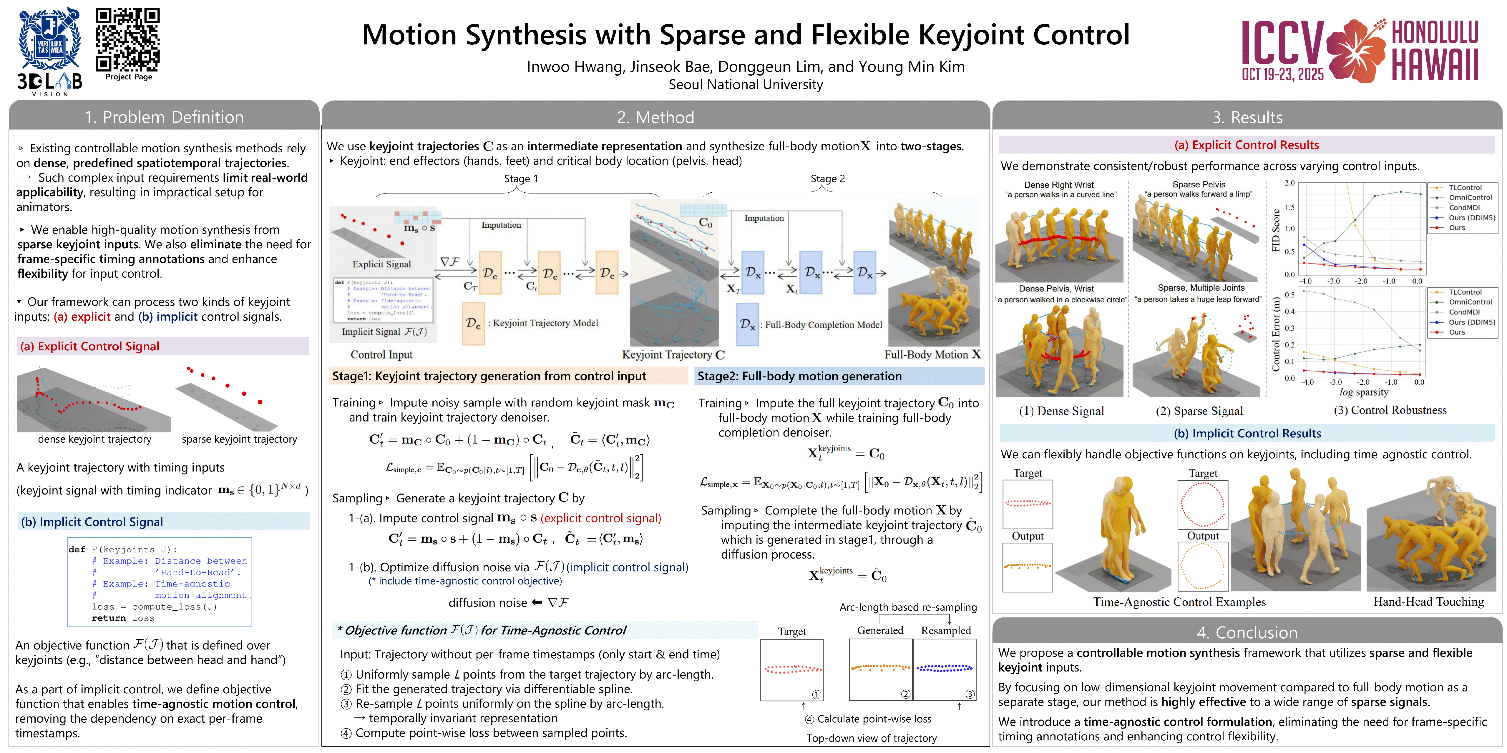 Creating expressive character animations is labor-intensive, requiring intricate manual adjustment of animators across space and time. Previous works on controllable motion generation often rely on a predefined set of dense spatio-temporal specifications (e.g., dense pelvis trajectories with exact per-frame timing), limiting practicality for animators.To process high-level intent and intuitive control in diverse scenarios, we propose a practical controllable motions synthesis framework that respects sparse and flexible keyjoint signals.Our approach employs a decomposed diffusion-based motion synthesis framework that first synthesizes keyjoint movements from sparse input control signals and then synthesizes full-body motion based on the completed keyjoint trajectories. The low-dimensional keyjoint movements can easily adapt to various control signal types, such as end-effector position for diverse goal-driven motion synthesis, or incorporate functional constraints on a subset of keyjoints.Additionally, we introduce a time-agnostic control formulation, eliminating the need for frame-specific timing annotations and enhancing control flexibility. Then, the shared second stage can synthesize a natural whole-body motion that precisely satisfies the task requirement from dense keyjoint movements.We demonstrate the effectiveness of sparse and flexible keyjoint control through comprehensive experiments on diverse datasets and scenarios.