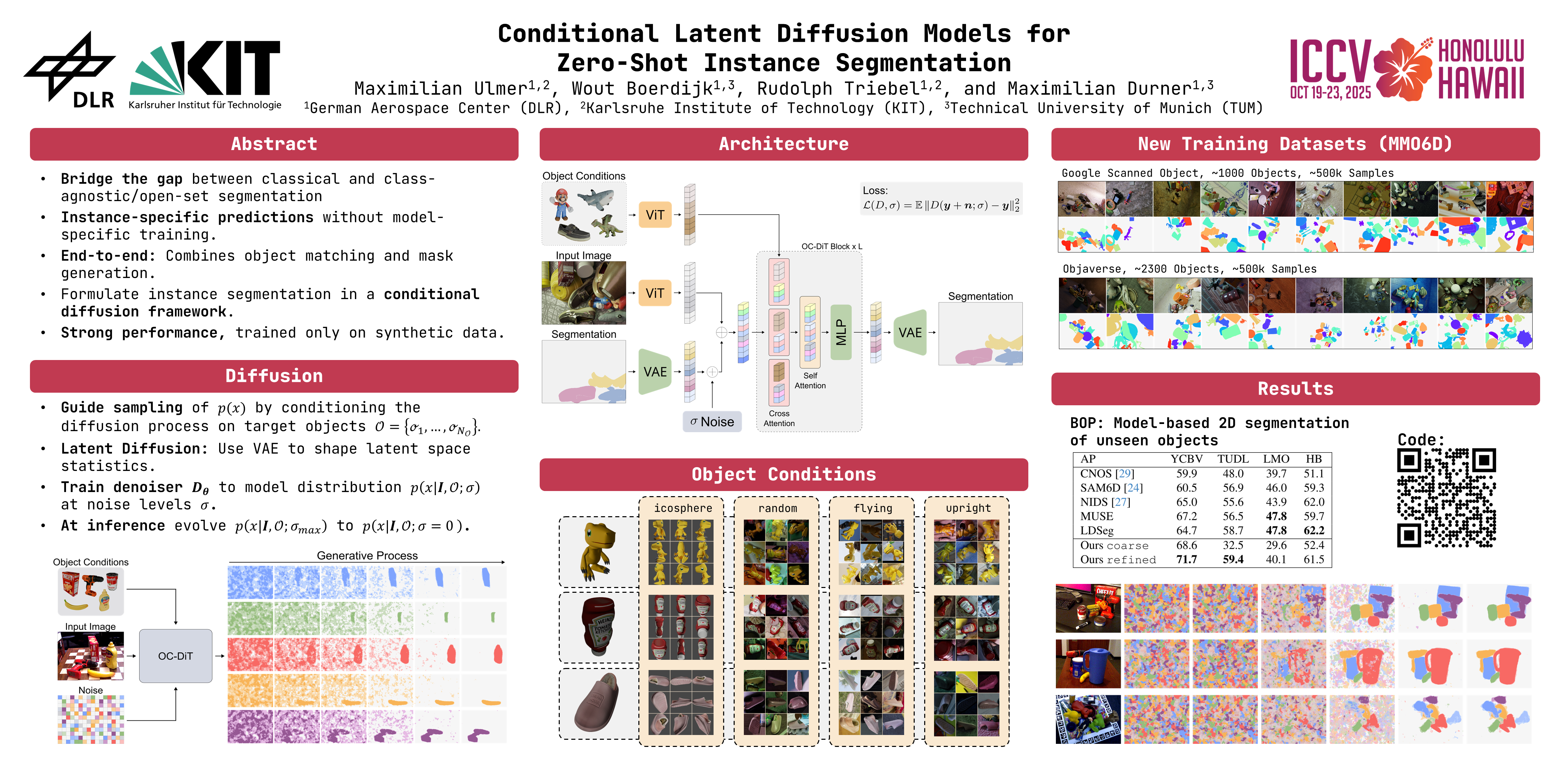 This paper presents OC-DiT, a novel class of diffusion models designed for object-centric prediction, and applies it to zero-shot instance segmentation. We propose a conditional latent diffusion framework that generates instance masks by conditioning the generative process on object templates and image features within the diffusion model's latent space. This allows our model to effectively disentangle object instances through the diffusion process, which is guided by visual object descriptors and localized image cues. Specifically, we introduce two model variants: a coarse model for generating initial object instance proposals, and a refinement model that refines all proposals in parallel. We train these models on a newly created, large-scale synthetic dataset comprising thousands of high-quality object meshes. Remarkably, our model achieves state-of-the-art performance on multiple challenging real-world benchmarks, without requiring any retraining on target data. Through comprehensive ablation studies, we demonstrate the potential of diffusion models for instance segmentation tasks. Code and the synthetic dataset will be publicly released.