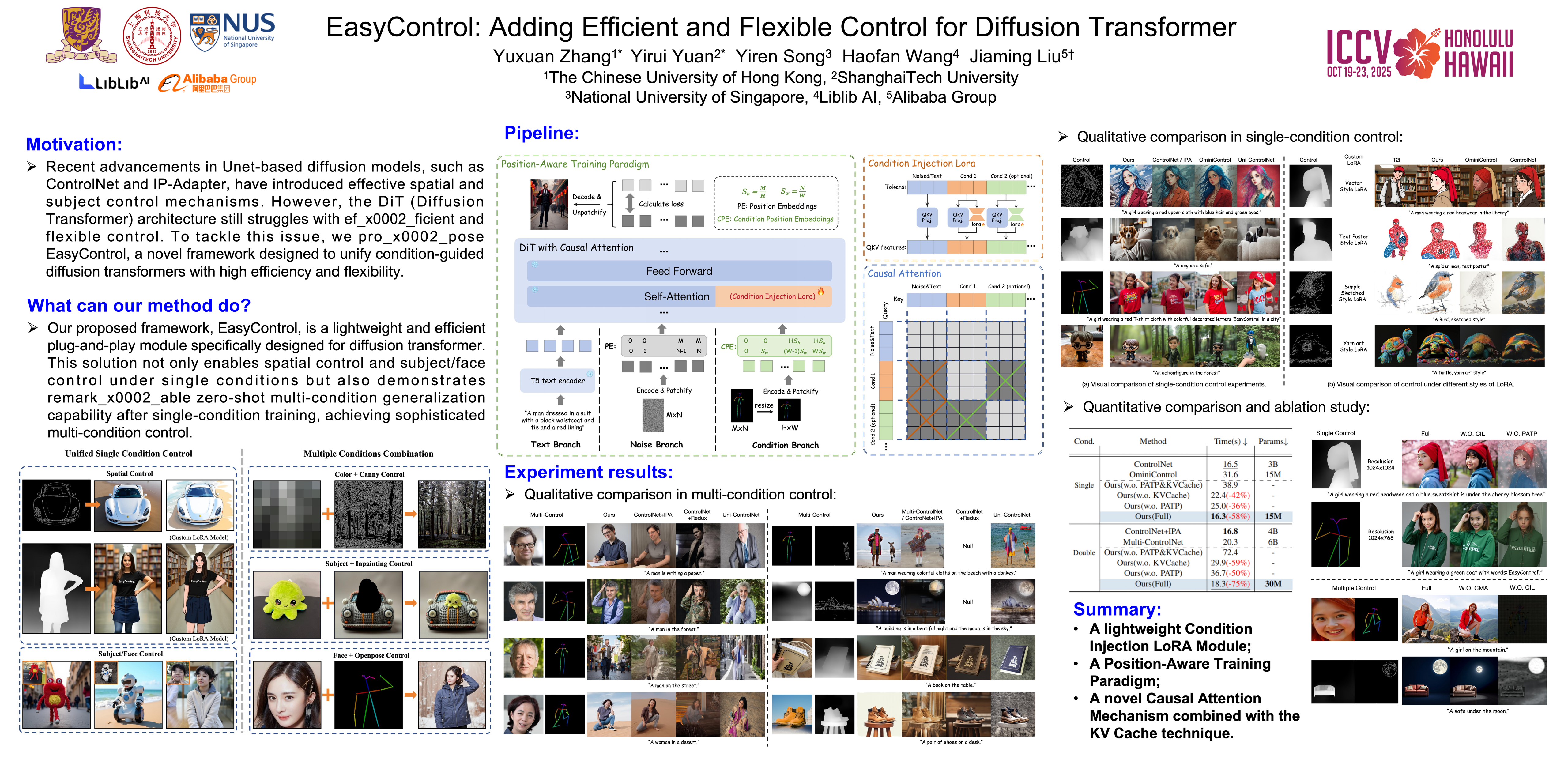 Recent advancements in Unet-based diffusion models, such as ControlNet and IP-Adapter, have introduced effective spatial and subject control mechanisms. However, the DiT (Diffusion Transformer) architecture still struggles with efficient and flexible control. To tackle this issue, we propose EasyControl, a novel framework designed to unify condition-guided diffusion transformers with high efficiency and flexibility. Our framework is built on three key innovations. First, we introduce a lightweight Condition Injection LoRA Module. This module processes conditional signals in isolation, acting as a plug-and-play solution. It avoids modifying the base model’s weights, ensuring compatibility with customized models and enabling the flexible injection of diverse conditions. Notably, this module also supports harmonious and robust zero-shot multi-condition generalization, even when trained only on single-condition data. Second, we propose a Position-Aware Training Paradigm. This approach standardizes input conditions to fixed resolutions, allowing the generation of images with arbitrary aspect ratios and flexible resolutions. At the same time, it optimizes computational efficiency, making the framework more practical for real-world applications. Third, we develop a Causal Attention Mechanism combined with the KV Cache technique, adapted for conditional generation tasks. This innovation significantly reduces the latency of image synthesis, improving the overall efficiency of the framework. Through extensive experiments, we demonstrate that EasyControl achieves exceptional performance across various application scenarios. These innovations collectively make our framework highly efficient, flexible, and suitable for a wide range of tasks.