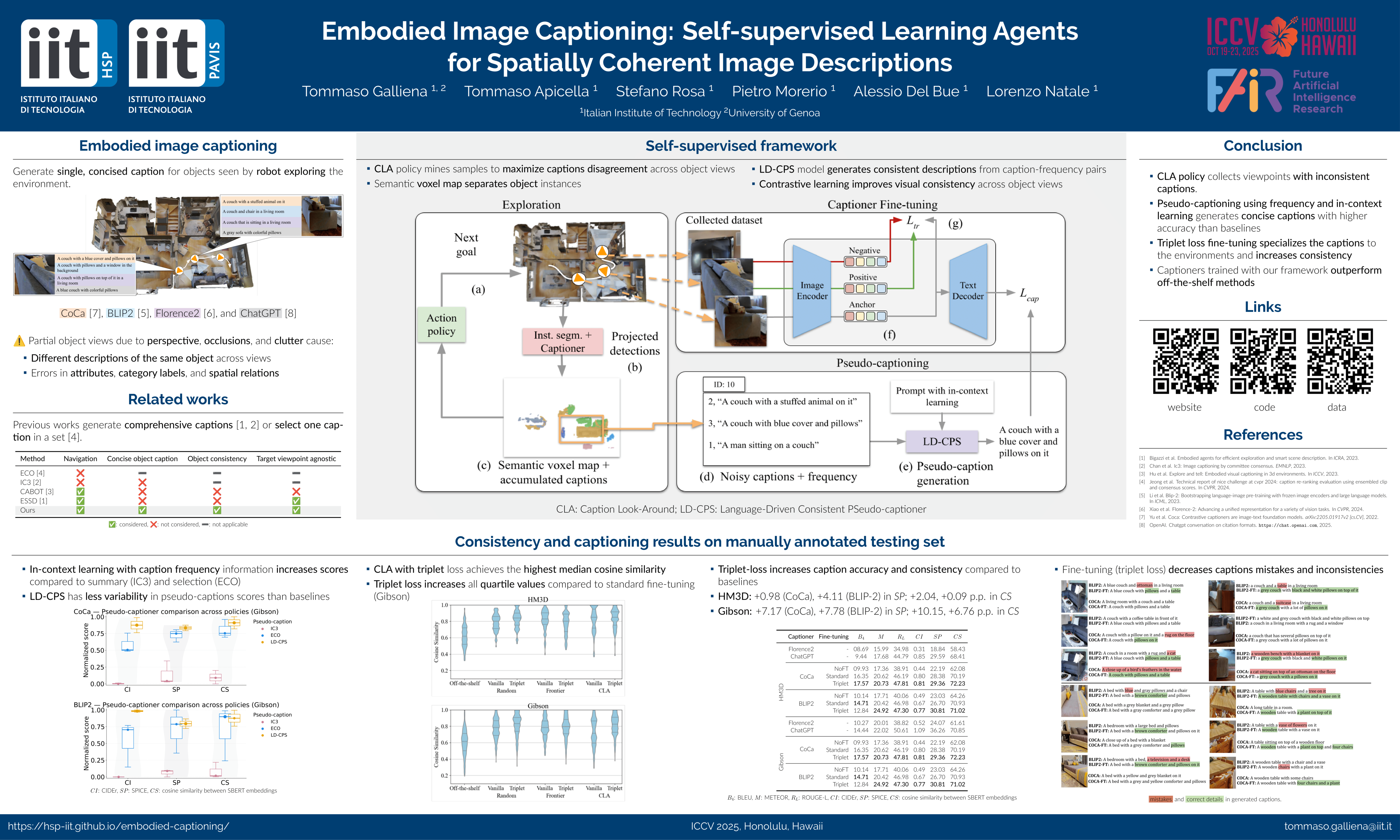 We present a self-supervised method to improve an agent's abilities in describing arbitrary objectswhile actively exploring a generic environment. This is a challenging problem, as current models struggle to obtain coherent image captions due to different camera viewpoints and clutter. We propose a three-phase framework to fine-tune existing captioning models that enhances caption accuracy and consistency across views via a consensus mechanism.First, an agent explores the environment, collecting noisy image-caption pairs. Then, a consistent pseudo-caption for each object instance is distilled via consensus using a large language model. Finally, these pseudo-captions are used to fine-tune an off-the-shelf captioning model, with the addition of contrastive learning. We analyse the performance of the combination of captioning models, exploration policies, pseudo-labeling methods, and fine-tuning strategies, on our manually labeled test set.Results show that a policy can be trained to mine samples with higher disagreement compared to classical baselines. Our pseudo-captioning method, in combination with all policies, has a higher semantic similarity compared to other existing methods, and fine-tuning improves caption accuracy and consistency by a significant margin. Code and test set annotations will be released upon paper acceptance.