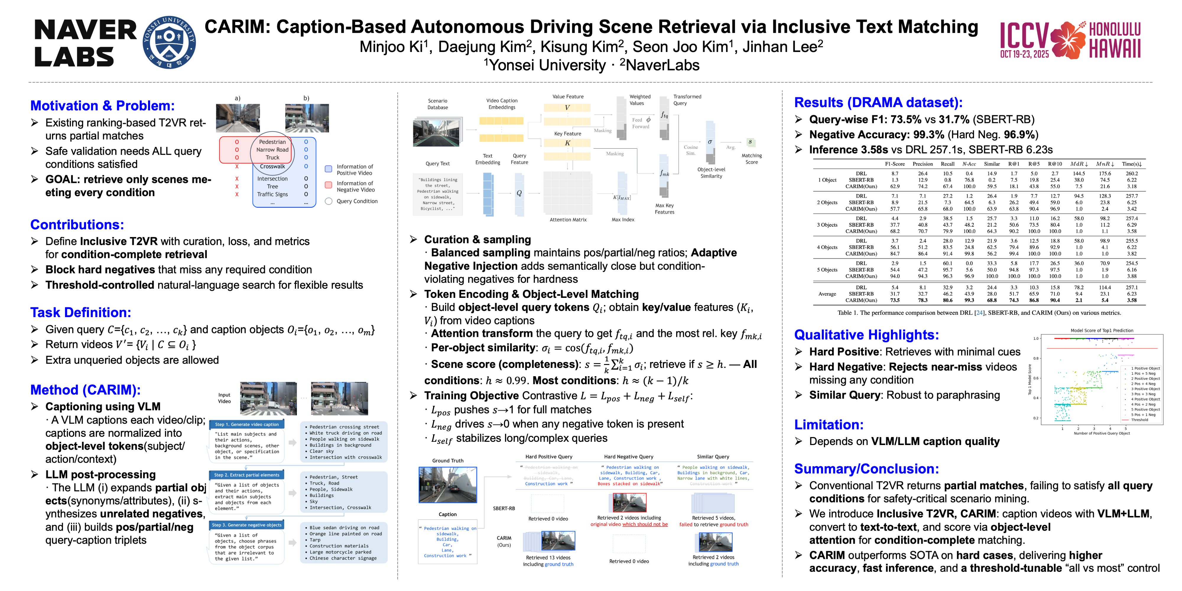 Text-to-video retrieval serves as a powerful tool for navigating vast video databases. This is particularly useful in autonomous driving to retrieve scenes from a text query to simulate and evaluate the driving system in desired scenarios. However, traditional ranking-based retrieval methods often return partial matches that do not satisfy all query conditions. To address this, we introduce Inclusive Text-to-Video Retrieval, which retrieves only videos that meet all specified conditions, regardless of additional irrelevant elements. We propose CARIM, a framework for driving scene retrieval that employs inclusive text matching. By utilizing Vision-Language Model (VLM) and Large Language Model (LLM) to generate compressed captions for driving scenes, we transform text-to-video retrieval into a more efficient text-to-text retrieval problem, eliminating modality mismatches and heavy annotation costs. We introduce a novel positive and negative data curation strategy and an attention-based scoring mechanism tailored for driving scene retrieval. Experimental results on the DRAMA dataset demonstrate that CARIM outperforms state-of-the-art retrieval methods, excelling in edge cases where traditional models fail.