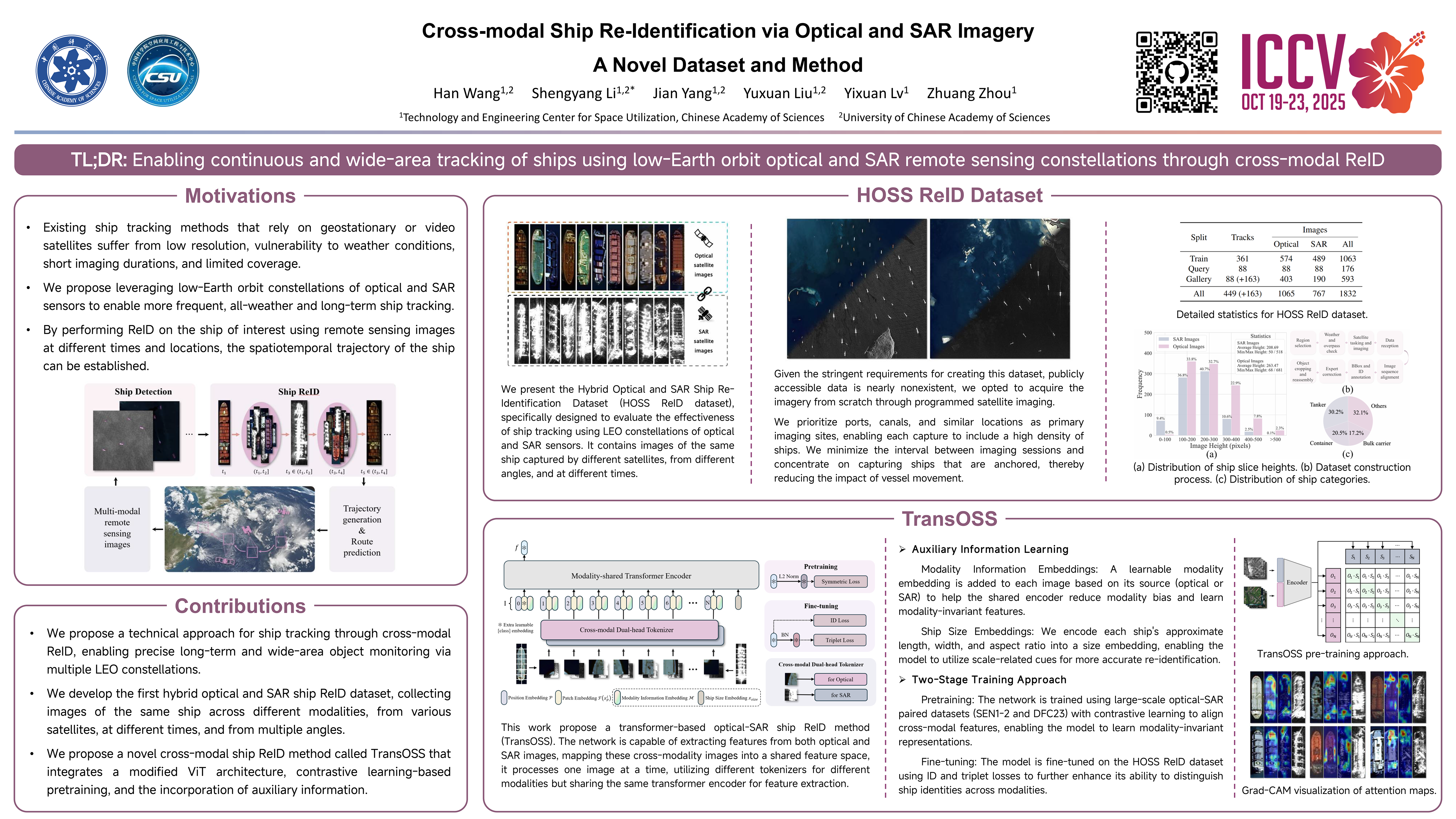 Detecting and tracking ground objects using earth observation imagery remains a significant challenge in the field of remote sensing. Continuous maritime ship tracking is crucial for applications such as maritime search and rescue, law enforcement, and shipping analysis. However, most current ship tracking methods rely on geostationary satellites or video satellites. The former offer low resolution and are susceptible to weather conditions, while the latter have short filming durations and limited coverage areas, making them less suitable for the real-world requirements of ship tracking. To address these limitations, we present the Hybrid Optical and Synthetic Aperture Radar (SAR) Ship Re-Identification Dataset (HOSS ReID dataset), designed to evaluate the effectiveness of ship tracking using low-Earth orbit constellations of optical and SAR sensors. This approach ensures shorter re-imaging cycles and enables all-weather tracking. HOSS ReID dataset includes images of the same ship captured over extended periods under diverse conditions, using different satellites of different modalities at varying times and angles. Furthermore, we propose a baseline method for cross-modal ship re-identification, TransOSS, which is built on the Vision Transformer architecture. It refines the patch embedding structure to better accommodate cross-modal tasks, incorporates additional embeddings to introduce more reference information, and employs contrastive learning to pre-train on large-scale optical-SAR image pairs, ensuring the model's ability to extract modality-invariant features. Our dataset and baseline method will be publicly available on GitHub.