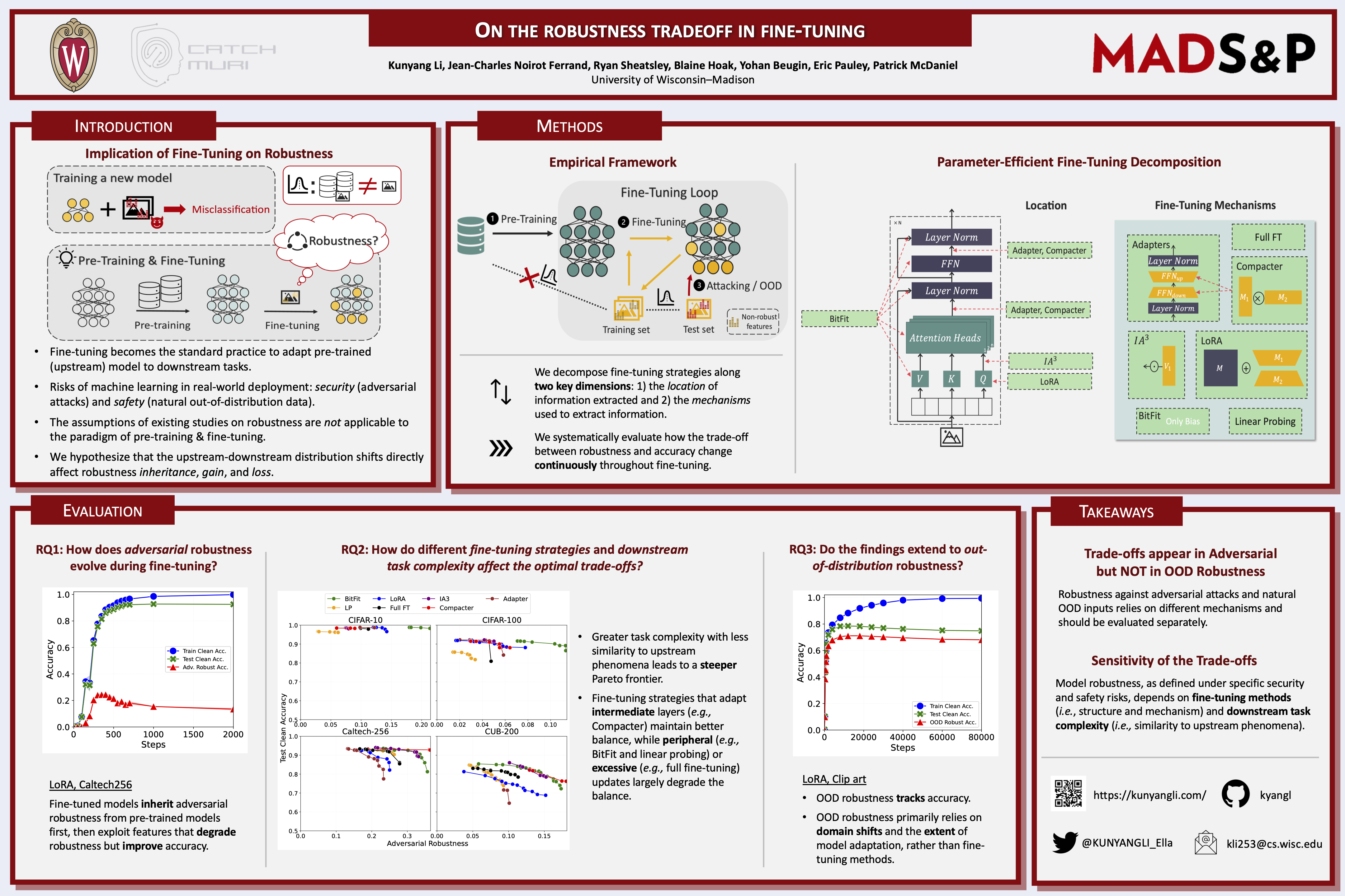 Fine-tuning has become the standard practice for adapting pre-trained (upstream) models to downstream tasks. However, the impact on model robustness is not well understood. In this work, we characterize the robustness-accuracy trade-off in fine-tuning. We evaluate the robustness and accuracy of fine-tuned models over 6 benchmark datasets and 7 different fine-tuning strategies. We observe a consistent trade-off between adversarial robustness and accuracy. Peripheral updates such as BitFit are more effective for simple tasks---over 75\% above the average measured with area under the Pareto frontiers on CIFAR-10 and CIFAR-100. In contrast, fine-tuning information-heavy layers, such as attention layers via Compacter, achieves a better Pareto frontier on more complex tasks---57.5\% and 34.6\% above the average on Caltech-256 and CUB-200, respectively. Lastly, we observe that robustness of fine-tuning against out-of-distribution data closely tracks accuracy. These insights emphasize the need for robustness-aware fine-tuning to ensure reliable real-world deployments.