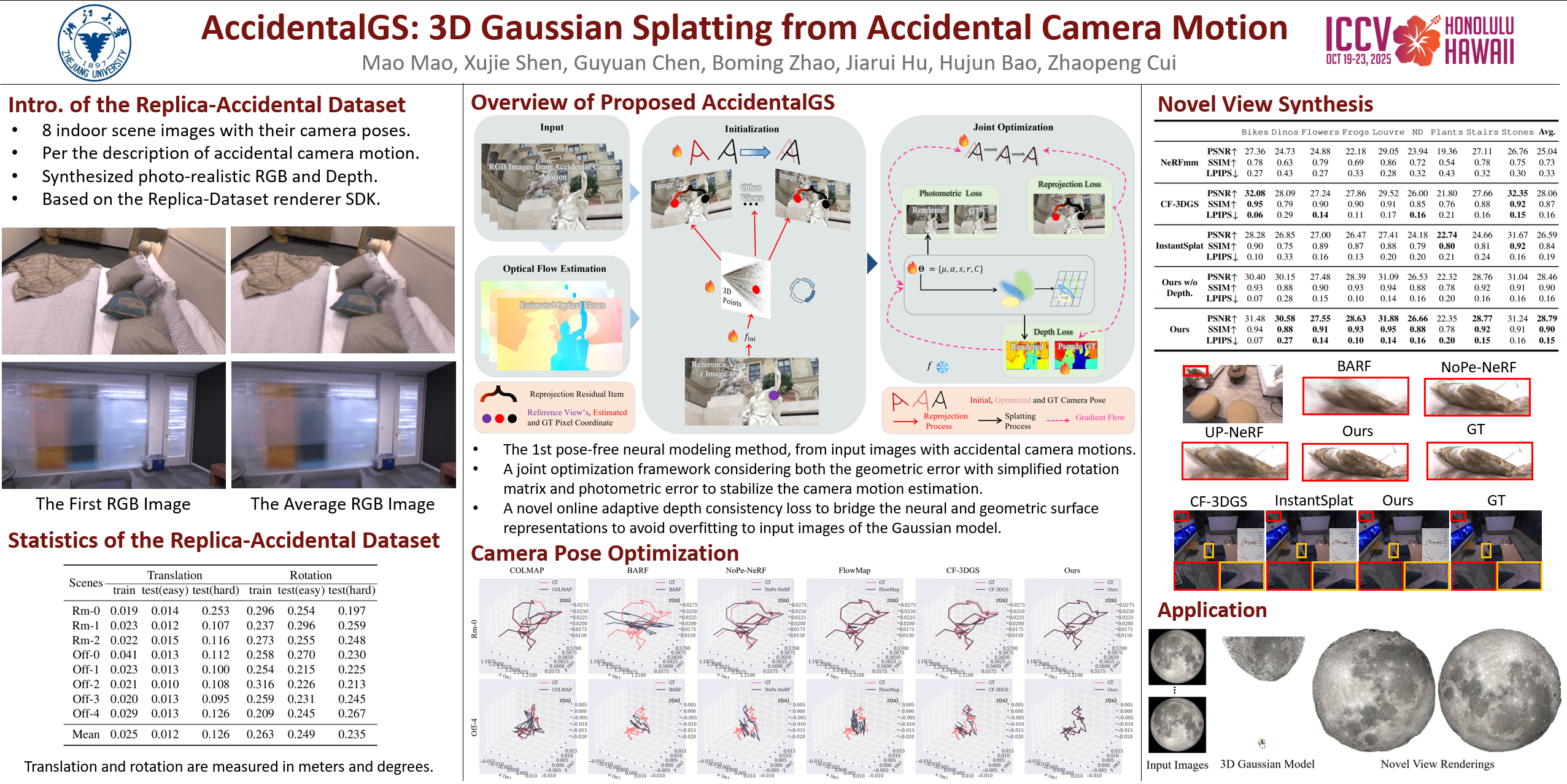 Neural 3D modeling and novel view synthesis with Neural Radiance Fields (NeRF) or 3D Gaussian Splatting (3DGS) typically requires the multi-view images with wide baselines and accurate camera poses as input. However, scenarios with accidental camera motions are rarely studied. In this paper, we propose AccidentalGS , the first method for neural 3D modeling and novel view synthesis from accidental camera motions. To achieve this, we present a novel joint optimization framework that considers geometric and photometric errors, using a simplified camera model for stability. We also introduce a novel online adaptive depth-consistency loss to prevent the overfitting of the Gaussian model to input images. Extensive experiments on both synthetic and real-world datasets show that AccidentalGS achieves more accurate camera poses and realistic novel views compared to existing methods, and supports 3D modeling and neural rendering even for the Moon with telescope-like images.