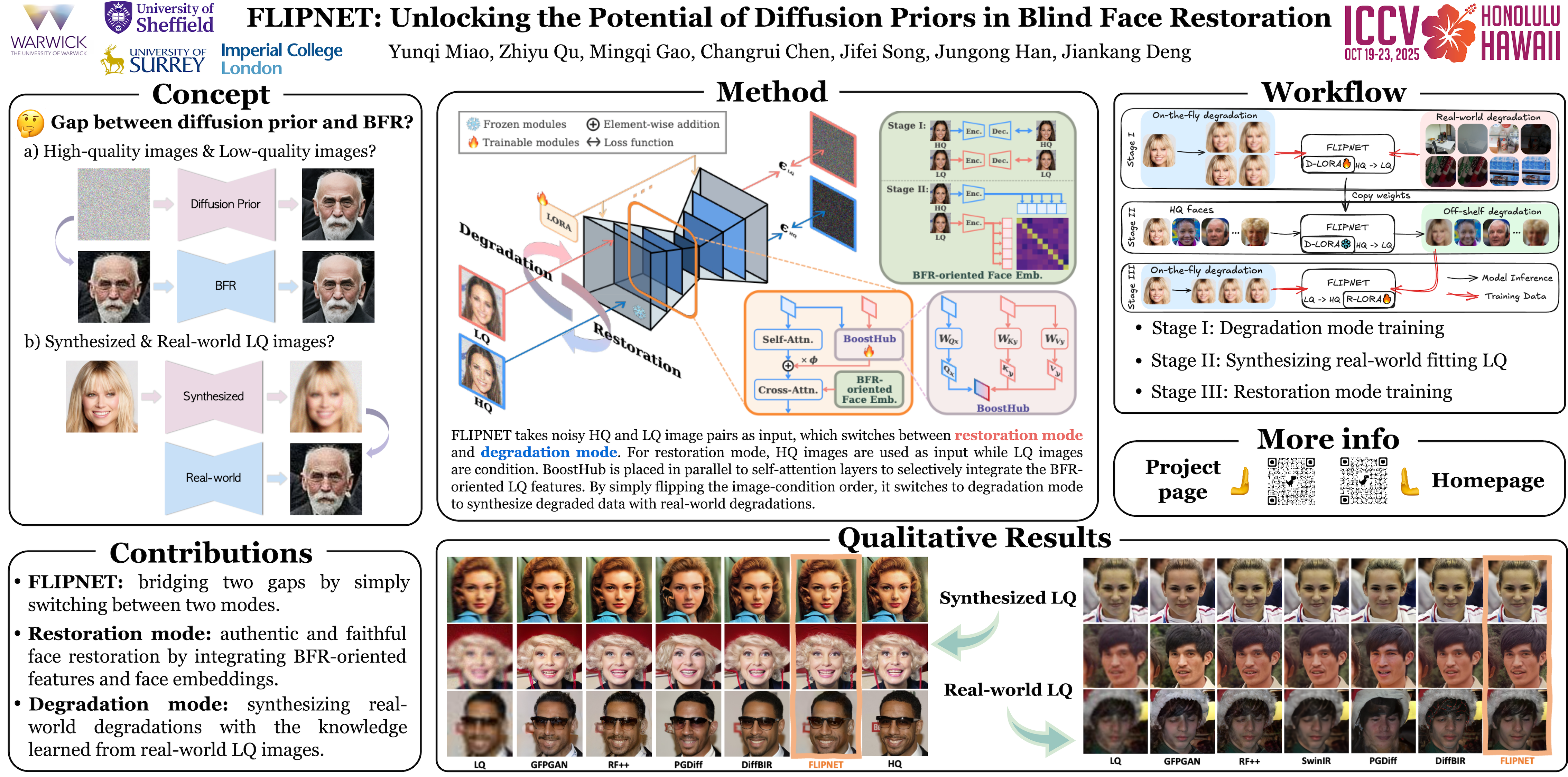 Although diffusion prior is rising as a powerful solution for blind face restoration (BFR), the inherent gap between the vanilla diffusion model and BFR settings hinders its seamless adaptation. The gap mainly stems from the discrepancy between 1) high-quality (HQ) and low-quality (LQ) images and 2) synthesized and real-world images.The vanilla diffusion model is trained on images with no or less degredations, while BFR handles moderately to severely degraded images.Additionally, LQ images used for training are synthesized by a naive degradation model with limited degradation patterns, which fails to simulate the complex and unknown degradations in real-world scenarios.In this work, we use a unified network FLIPNET that switches between two modes to address specific gaps.In restoration mode, the model gradually integrates BFR-oriented features and face embeddings from LQ images to achieve authentic and faithful face restoration.In degradation mode, the model synthesizes real-world like degraded images based on the knowledge learned from real-world degradation datasets.Extensive evaluations on benchmark datasets show that our model 1) outperforms previous diffusion prior based BFR methods in terms of authenticity and fidelity, and 2) outperforms the naive degradation model in modeling the real-world degradations.