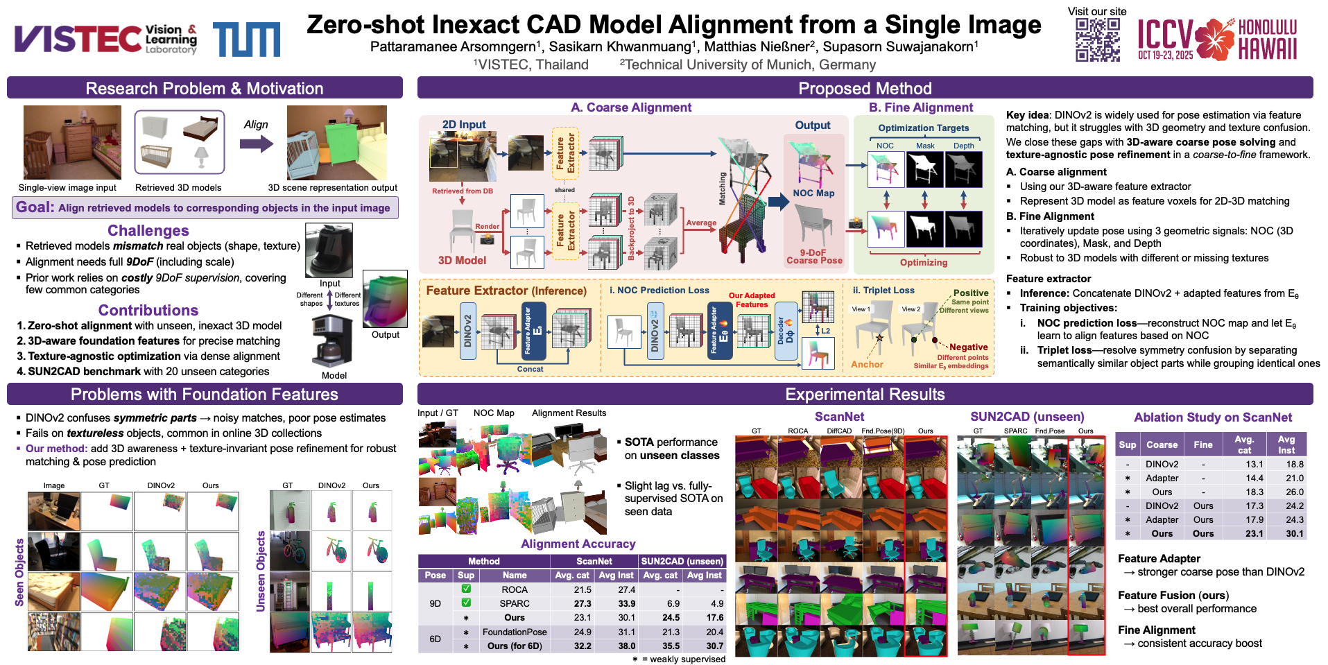 One practical approach to infer 3D scene structure from a single image is to retrieve a closely matching 3D model from a database and align it with the object in the image. Existing retrieve-and-alignmethods rely on supervised training with images and pose annotations, which limits them to a narrow set of object categories. To address this, we propose an unsupervised 9-DoF alignment method for inexact 3D models that requires no pose annotations and generalizes to unseen categories. Our approach derives a novel feature space based on foundation features that ensure multi-view consistency and overcome symmetry ambiguities inherent in foundation features using a self-supervised triplet loss.Additionally, we introduce a texture-invariant pose refinement technique that performs dense alignment in normalized object coordinates, estimated through the enhanced feature space.We conduct extensive evaluations on the real-world ScanNet25k dataset, where our method outperforms SOTA unsupervised baselines by +4.3% mean alignment accuracy and is the only unsupervised approach to surpass the supervised ROCA by +2.7%.To assess generalization, we introduce SUN2CAD, a real-world test set with 20 novel object categories, where our method achieves SOTA results without prior training on them.