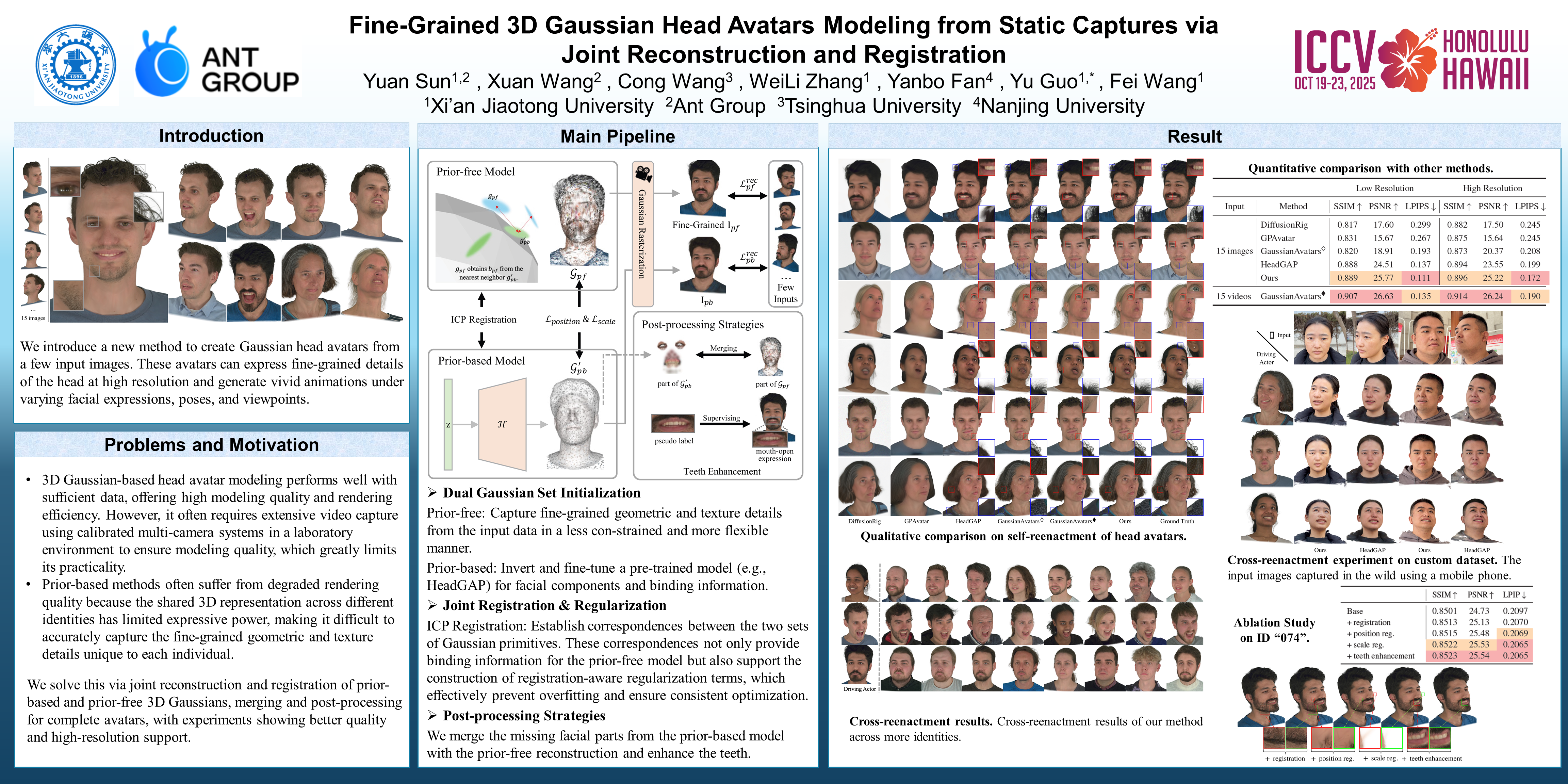 Recently, 3D head avatar modeling based on 3D Gaussians has demonstrated significant advantages in rendering quality and efficiency, provided there is sufficient data. Some efforts have begun to train prior models on large datasets to develop generalizable 3D Gaussian head avatar modeling methods. Unfortunately, due to the limited expressive power of identity-shared 3D representations, the prior-based modeling often result in degenerated rendering quality. To overcome this limitation, we propose to formulate the 3D Gaussian head avatar modeling as a joint reconstruction and registration problem. Given static input images (e.g., a short mobile phone capture), we optimize two sets of 3D Gaussians: the prior-based one possesses complete animation rigging information inferred from the prior model and produces plausible modeling results, while the prior-free one is used to more freely capture the fine-grained geometric and texture details in the input images. Additionally, we simultaneously solve the registration problem between the two 3D Gaussian sets. On one hand, the registration results will provide binding information for the prior-free reconstruction to make it animatable. On the other hand, during optimization, the prior-based Gaussian can regularize the prior-free reconstruction to resist overfitting and perform good in novel expressions. Finally, we merge the parts of the prior-based reconstruction that are occluded in the input images with the prior-free reconstruction set, and then apply appropriate post-processing strategies (such as teeth enhancement) to produce a complete head avatar. We evaluated our method on the public Nersemble dataset and our own in-the-wild data. The experiments demonstrate that, under the same experimental settings, our method significantly improves modeling quality and provides better support for detailed modeling at higher resolutions.