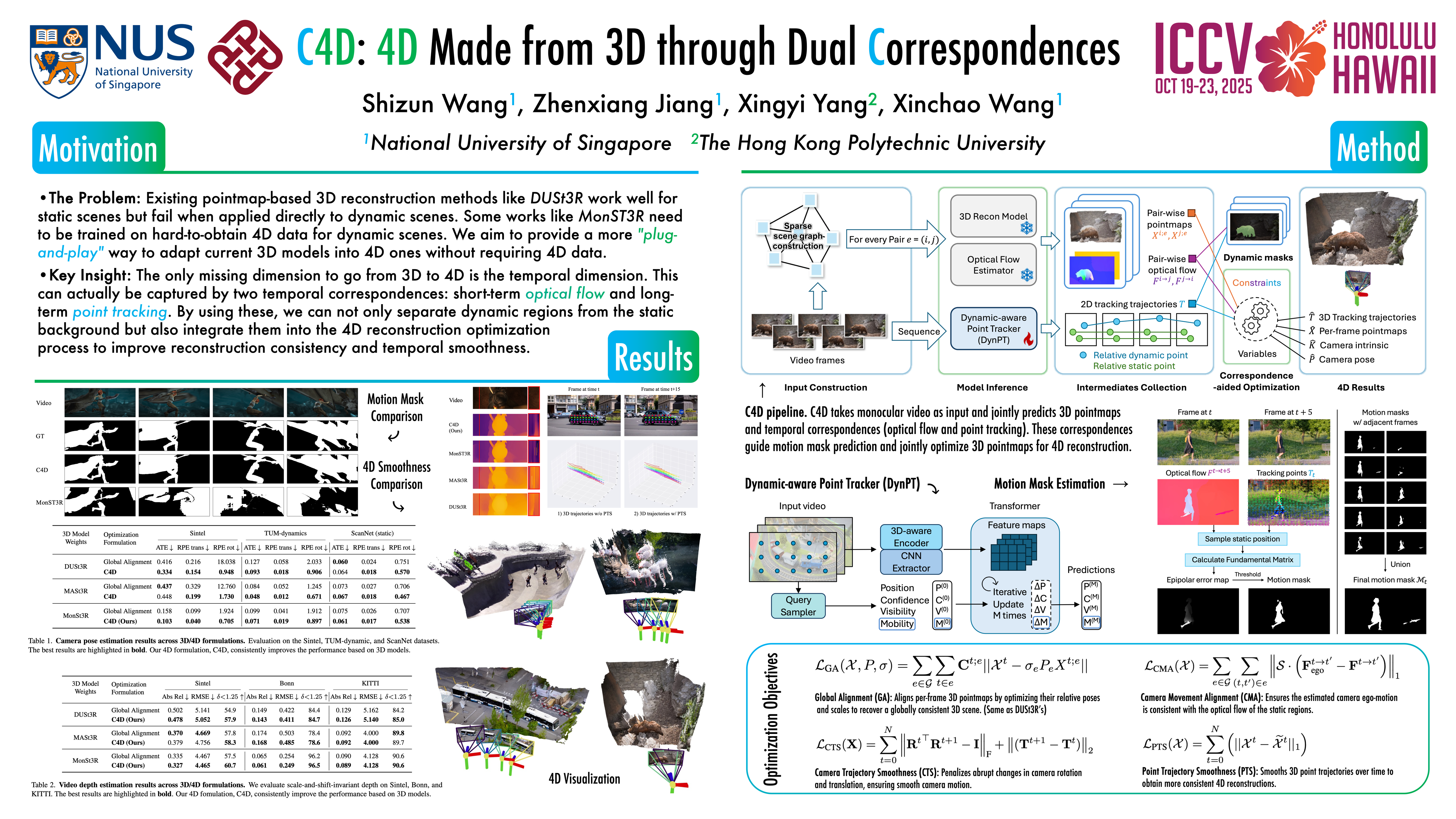 Recovering 4D from monocular video, which jointly estimates dynamic geometry and camera poses, is an inevitably challenging problem. While recent pointmap-based 3D reconstruction methods (e.g., DUSt3R) have made great progress in reconstructing static scenes, directly applying them to dynamic scenes leads to inaccurate results. This discrepancy arises because moving objects violate multi-view geometric constraints, disrupting the reconstruction.To address this, we introduce C4D, a framework that leverages temporal Correspondences to extend existing 3D reconstruction formulation to 4D. Specifically, apart from predicting pointmaps, C4D captures two types of correspondences: short-term optical flow and long-term point tracking. We train a dynamic-aware point tracker that provides additional mobility information, facilitating the estimation of motion masks to separate moving elements from the static background, thus offering more reliable guidance for dynamic scenes.Furthermore, we introduce a set of dynamic scene optimization objectives to recover per-frame 3D geometry and camera parameters. Simultaneously, the correspondences lift 2D trajectories into smooth 3D trajectories, enabling fully integrated 4D reconstruction.Experiments show that our framework achieves complete 4D recovery and demonstrates strong performance across multiple downstream tasks, including depth estimation, camera pose estimation, and point tracking.