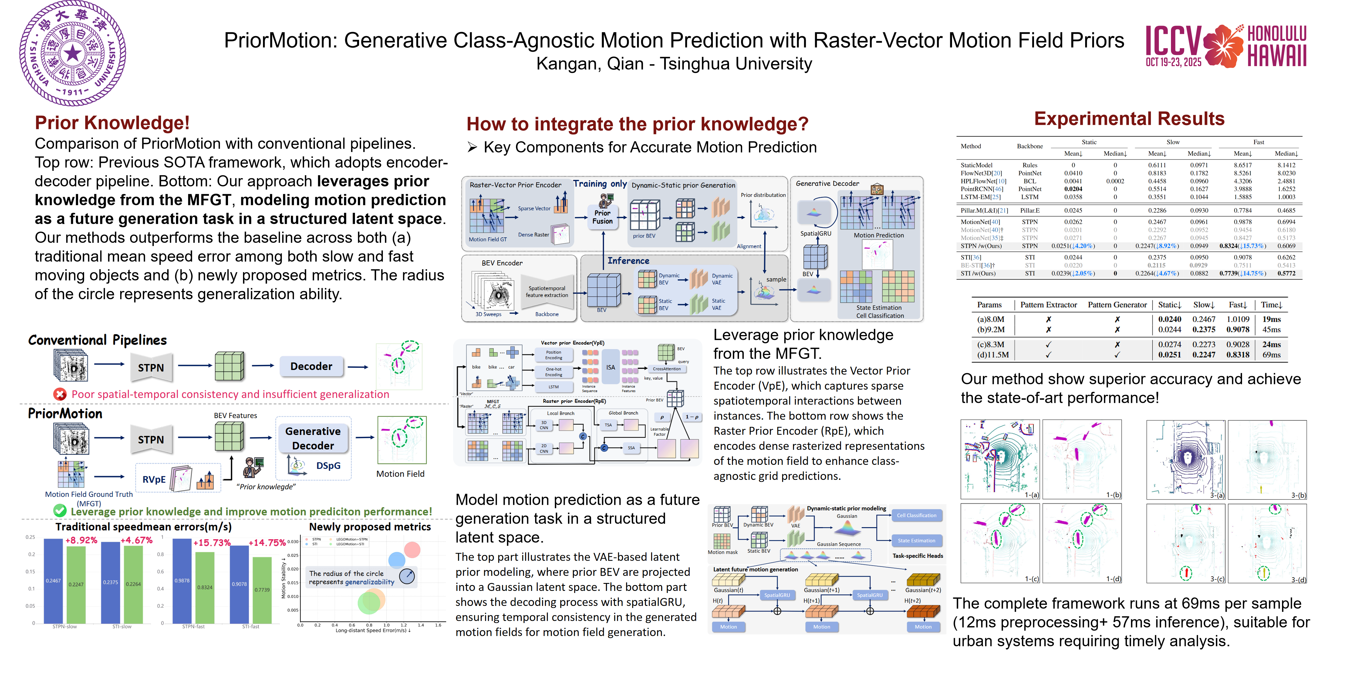 Reliable spatial and motion perception is essential for safe autonomous navigation. Recently, class-agnostic motion prediction on bird's-eye view (BEV) cell grids derived from LiDAR point clouds has gained significant attention. However, existing frameworks typically perform cell classification and motion prediction on a per-pixel basis, neglecting important motion field priors such as rigidity constraints, temporal consistency, and future interactions between agents. These limitations lead to degraded performance, particularly in sparse and distant regions.To address these challenges, we introduce $\textbf{PriorMotion}$, an innovative generative framework designed for class-agnostic motion prediction that integrates essential motion priors by modeling them as distributions within a structured latent space. Specifically, our method captures structured motion priors using raster-vector representations and employs a variational autoencoder with distinct dynamic and static components to learn future motion distributions in the latent space. Experiments on the nuScenes dataset demonstrate that $\textbf{PriorMotion}$ outperforms state-of-the-art methods across both traditional metrics and our newly proposed evaluation criteria. Notably, we achieve improvements of approximately 15.24\% in accuracy for fast-moving objects, an 3.59\% increase in generalization, a reduction of 0.0163 in motion stability, and a 31.52\% reduction in prediction errors in distant regions. Further validation on FMCW LiDAR sensors confirms the robustness of our approach.