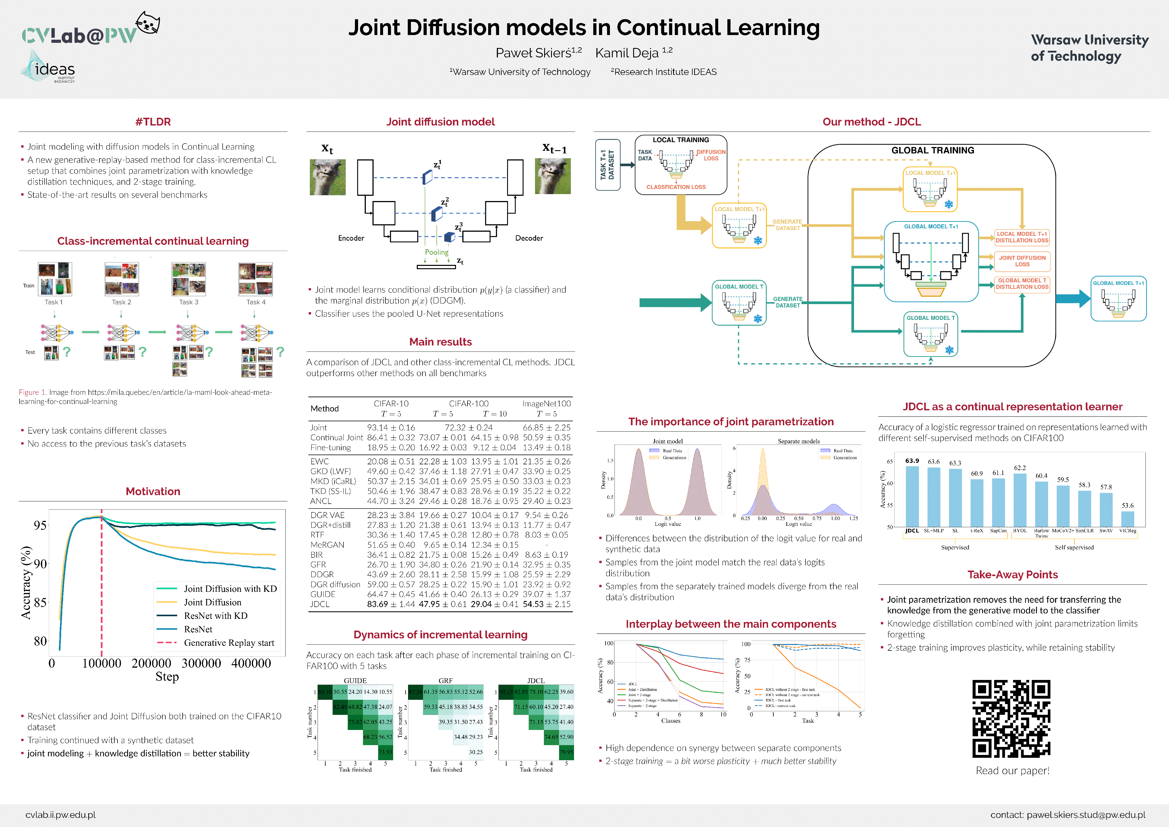 In this work, we introduce JDCL - a new method for continual learning with generative rehearsal based on joint diffusion models. Neural networks suffer from catastrophic forgetting defined as abrupt loss in the model's performance when retrained with additional data coming from a different distribution. Generative-replay-based continual learning methods try to mitigate this issue by retraining a model with a combination of new and rehearsal data sampled from a generative model. In this work, we propose to extend this idea by combining a continually trained classifier with a diffusion-based generative model into a single - jointly optimized neural network. We show that such shared parametrization, combined with the knowledge distillation technique allows for stable adaptation to new tasks without catastrophic forgetting. We evaluate our approach on several benchmarks, where it outperforms recent state-of-the-art generative replay techniques. Additionally, we extend our method to the semi-supervised continual learning setup, where it outperforms competing buffer-based replay techniques, and evaluate, in a self-supervised manner, the quality of trained representations.