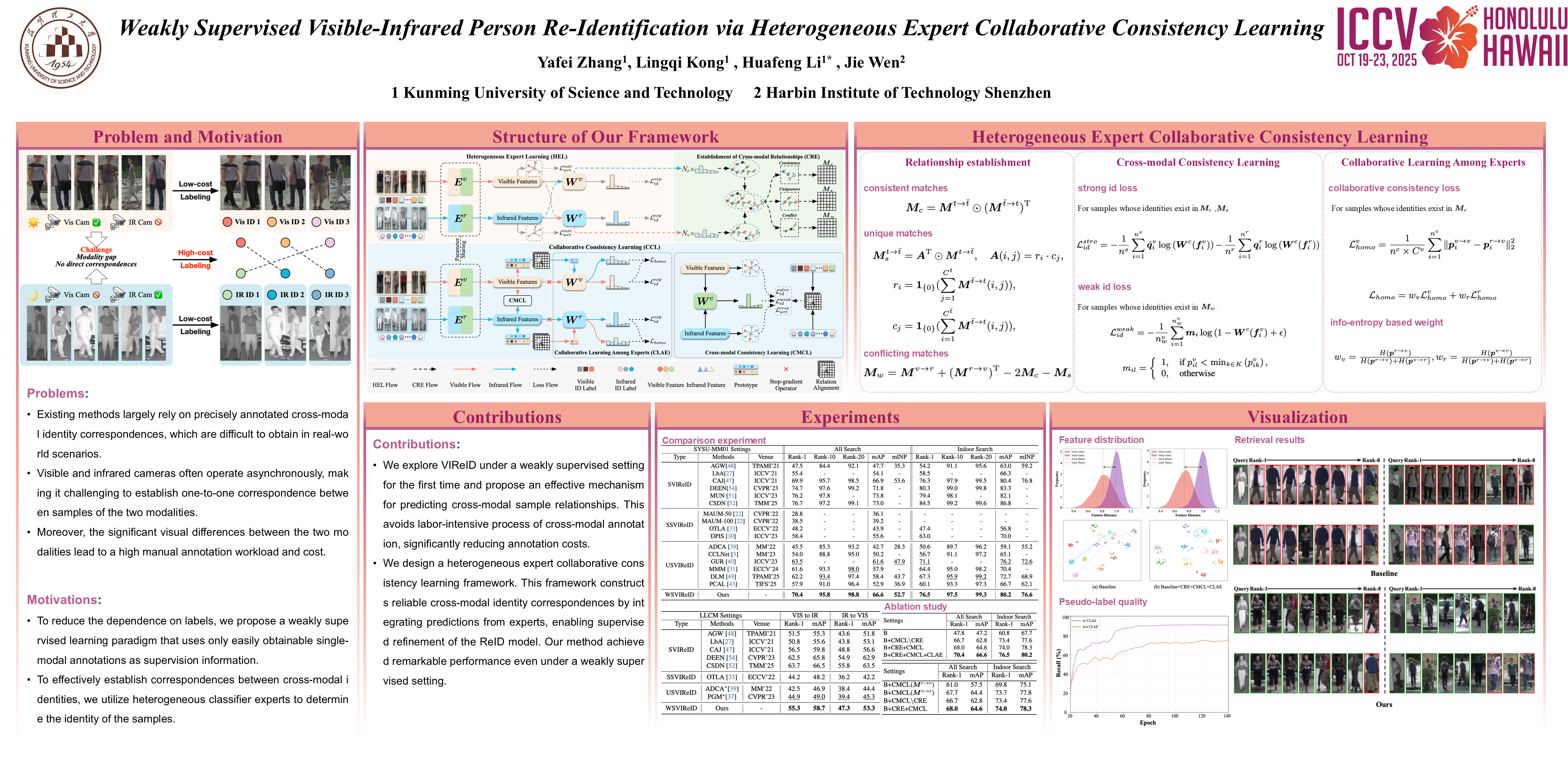 To reduce the reliance of visible-infrared person re-identification (ReID) models on labeled cross-modal samples, this paper explores a weakly supervised cross-modal person ReID method that uses only single-modal sample identity labels, addressing scenarios where cross-modal identity labels are unavailable. To mitigate the impact of missing cross-modal labels on model performance, we propose a heterogeneous expert collaborative consistency learning framework, designed to establish robust cross-modal identity correspondences in a weakly supervised manner. This framework leverages labeled data from each modality to independently train dedicated classification experts. To associate cross-modal samples, these classification experts act as heterogeneous predictors, predicting the identities of samples from the other modality. To improve prediction accuracy, we design a cross-modal relationship fusion mechanism that effectively integrates predictions from different experts. Under the implicit supervision provided by cross-modal identity correspondences, collaborative and consistent learning among the experts is encouraged, significantly enhancing the model’s ability to extract modality-invariant features and improve cross-modal identity recognition. Experimental results on two challenging datasets validate the effectiveness of the proposed method.