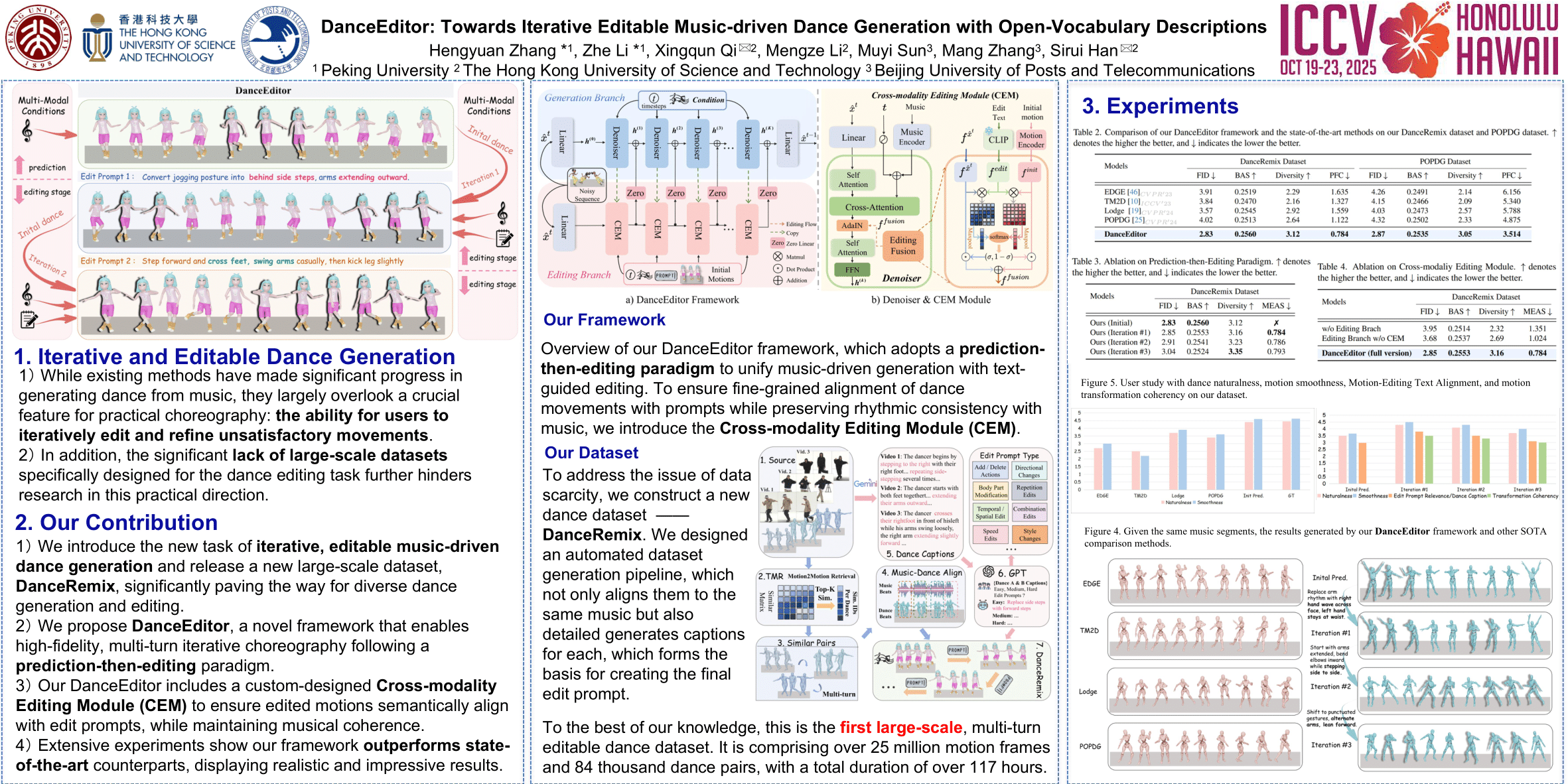 Generating coherent and diverse human dances from music signals has gained tremendous progress in animating virtual avatars. While existing methods enable dance synthesis directly, they overlook affording editable dance movements for users is more practical in real choreography scenes.Moreover, the lack of high-quality dance datasets incorporating iterative editing also limits addressing this challenge.To achieve this goal, we first construct $\textbf{DanceRemix}$, a large-scale multi-turn editable dance dataset comprising the prompt featuring over 12.6M dance frames and 42K pairs.In addition, we propose a novel framework for iterative and editable dance generation coherently aligned with given music signals, namely $\textbf{DanceEditor}$. Considering the dance motion should be both musical rhythmic and enable iterative editing by user descriptions, our framework is built upon a prediction-then-editing paradigm unifying multi-modal conditions.At the initial prediction stage, our framework improves the authority of generated results by directly modeling dance movements from tailored aligned music.Moreover, at the subsequent iterative editing stages, we incorporate text descriptions as conditioning information to draw the editable results through a specific-designed $\textbf{Cross-modality Edition Module (CEM)}$.Specifically, CEM adaptively integrates the initial prediction with music and text prompts as temporal motion cues to guide the synthesized sequences.Thereby the results display music harmonic while preserving fine-grained semantic alignment with text descriptions.Extensive experiments demonstrate that our method outperforms the state-of-the-art models on our newly collected DanceRemix dataset.