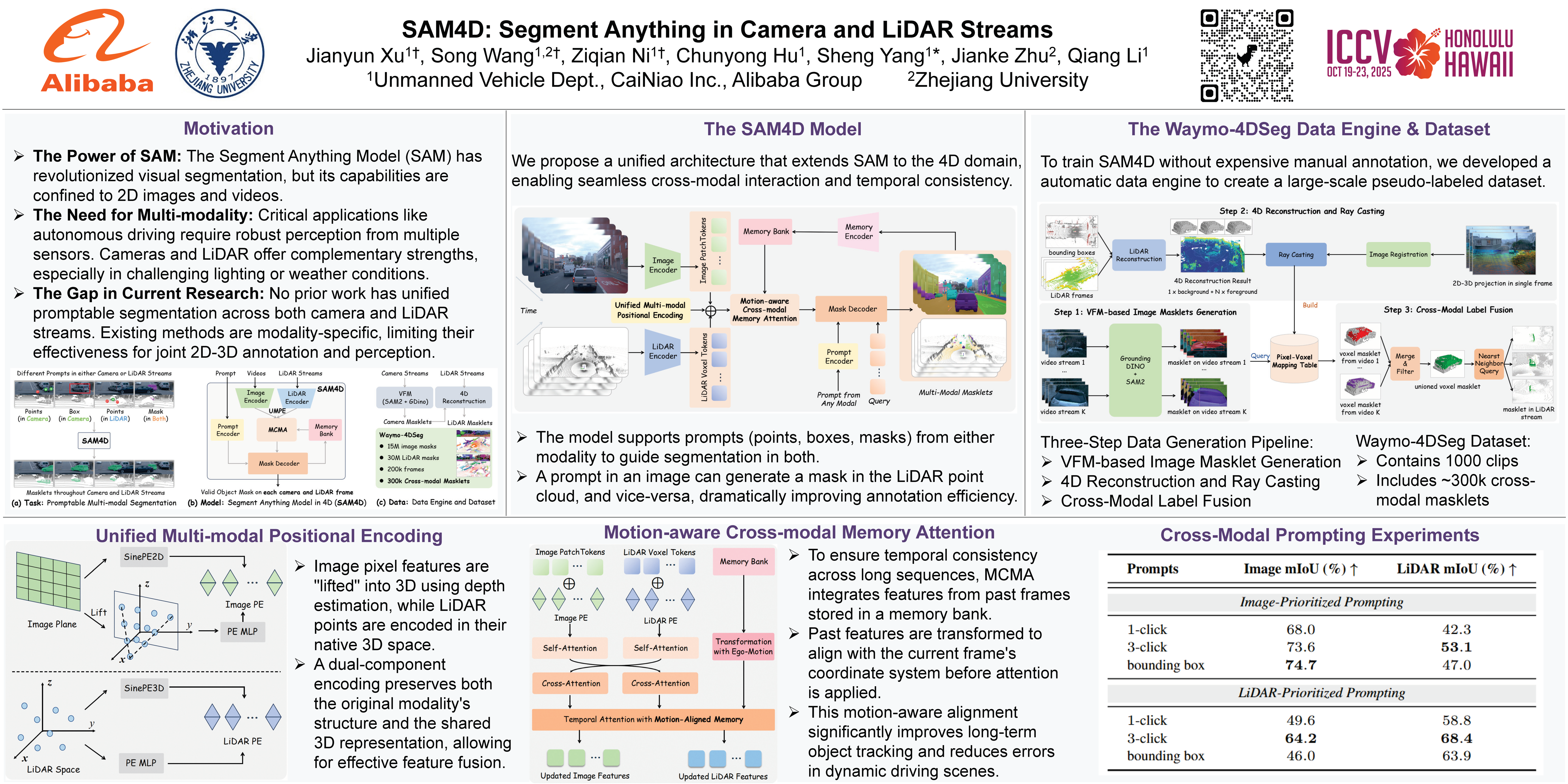 We present SAM4D, a multi-modal and temporal foundation model designed for promptable segmentation across camera and LiDAR streams. Unified Multi-modal Positional Encoding (UMPE) is introduced to align camera and LiDAR features in a shared 3D space, enabling seamless cross-modal prompting and interaction. Additionally, we propose Motion-aware Cross-modal Memory Attention (MCMA), which leverages ego-motion compensation to enhance temporal consistency and long-horizon feature retrieval, ensuring robust segmentation across dynamically changing autonomous driving scenes. To avoid annotation bottlenecks, we develop a multi-modal automated data engine that synergizes VFM-driven video masklets, spatiotemporal 4D reconstruction, and cross-modal masklet fusion. This framework generates camera-LiDAR aligned pseudo-labels at a speed orders of magnitude faster than human annotation while preserving VFM-derived semantic fidelity in point cloud representations. We conduct extensive experiments on the constructed Waymo-4DSeg, which demonstrate the powerful cross-modal segmentation ability and great potential in data annotation of proposed SAM4D.