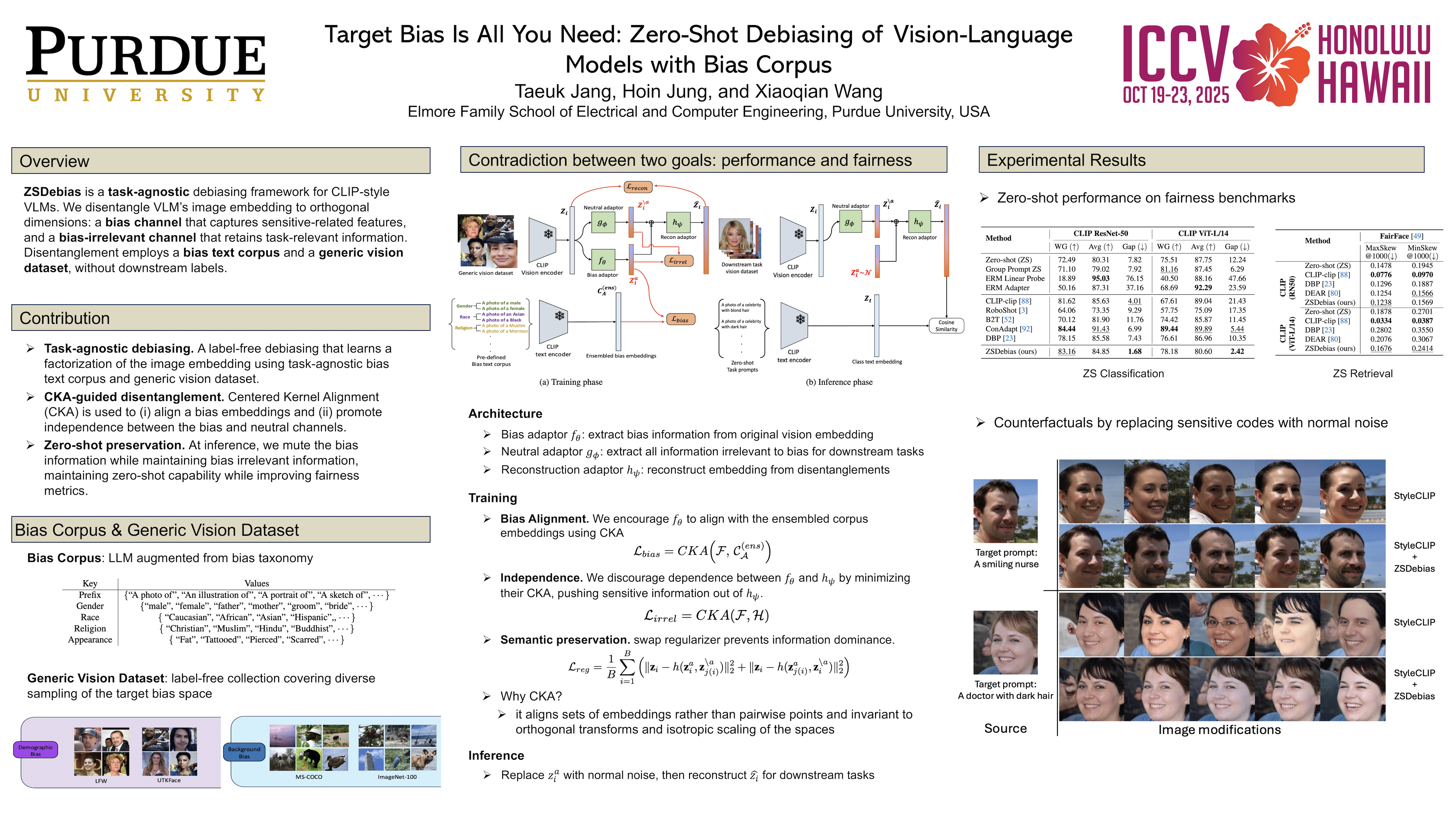 Vision-Language Models (VLMs) like CLIP have shown remarkable zero-shot performance by aligning different modalities in the embedding space, enabling diverse applications from image editing to visual question answering (VQA). However, these models often inherit biases from their training data, resulting in performance disparities across specific subpopulations. Traditional debiasing methods for VLMs primarily focus on specific downstream tasks using labeled datasets, which we argue is insufficient given the broad applicability of VLMs. Specifically, these methods struggle with generalizability, transferability, and feasibility due to overfitting, limited task applicability, and regulatory constraints on the use of sensitive data, making them less practical in real-world scenarios. To address these challenges, we propose a novel task-agnostic method for learning debiased image embeddings in VLMs. Our approach does not require expensive annotated datasets or curated prompts for downstream tasks, while still preserving the inherent zero-shot capabilities of these models. Instead, we leverage easily accessible information: 1) a bias text corpus generated by a large language model, and 2) a generic unsupervised vision dataset. Our method disentangles the image embedding into bias and neutral components by applying centered kernel alignment (CKA) regularization to the text-vision representational similarity, using the bias text corpus over the generic vision dataset. Experimental results validate the effectiveness of our approach across multiple tasks, offering a practical and versatile solution to debiasing VLMs.