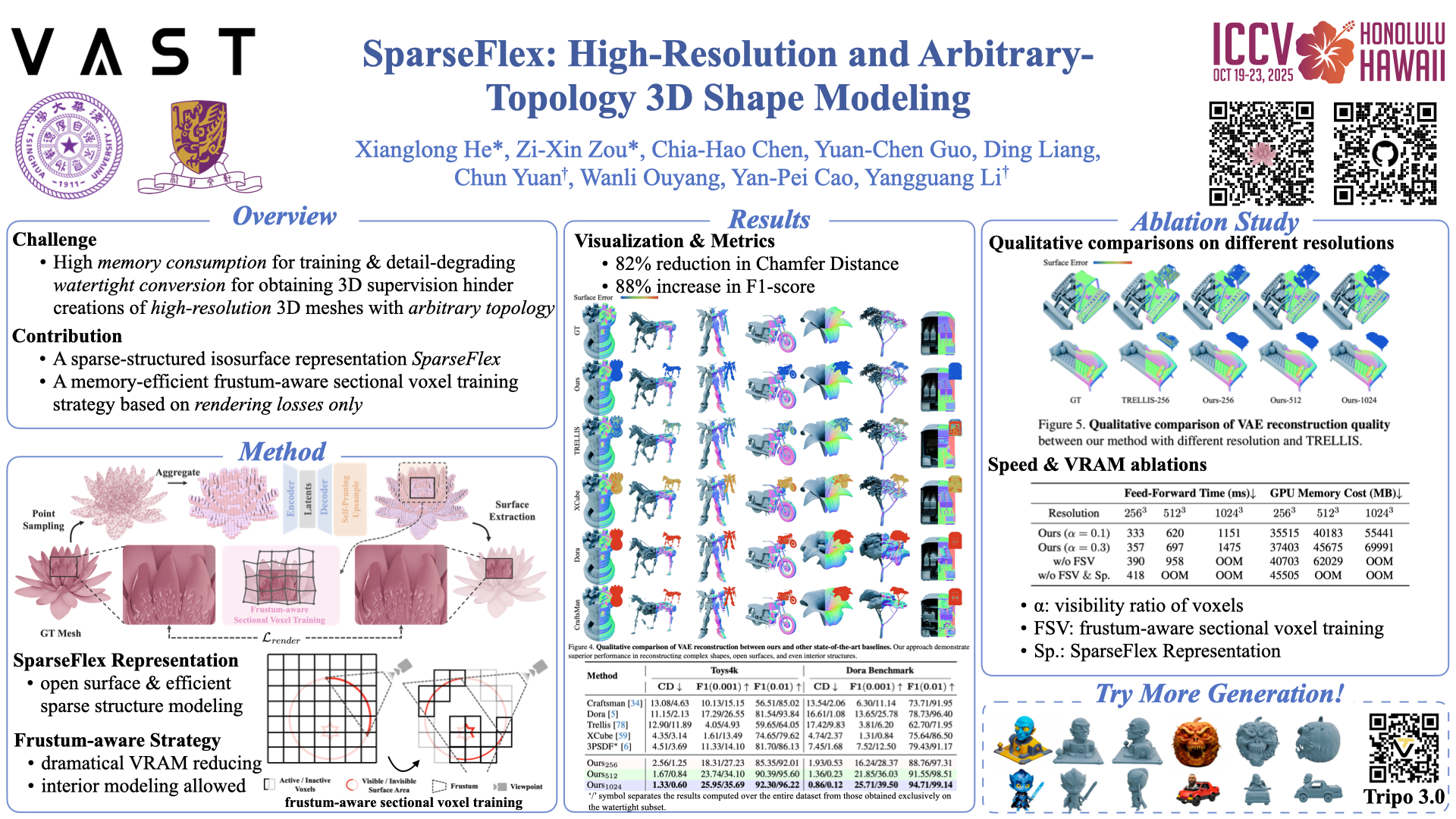 Creating high-fidelity 3D meshes with arbitrary topology, including open surfaces and complex interiors, remains a significant challenge. Existing implicit field methods often require costly and detail-degrading watertight conversion, while other approaches struggle with high resolutions. This paper introduces SparseFlex, a novel sparse-structured isosurface representation that enables differentiable mesh reconstruction at resolutions up to 1024^3 directly from rendering losses. SparseFlex combines the accuracy of Flexicubes with a sparse voxel structure, focusing computation on surface-adjacent regions and efficiently handling open surfaces. Crucially, we introduce a frustum-aware sectional voxel training strategy that activates only relevant voxels during rendering, dramatically reducing memory consumption and enabling high-resolution training. This also allows, for the first time, the reconstruction of mesh interiors using only rendering supervision. Building upon this, we demonstrate a complete shape modeling pipeline by training a variational autoencoder (VAE) and a rectified flow transformer for high-quality 3D shape generation. Our experiments show state-of-the-art reconstruction accuracy, with a ~82% reduction in Chamfer Distance and a ~88% increase in F-score compared to previous methods, and demonstrate the generation of high-resolution, detailed 3D shapes with arbitrary topology. By enabling high-resolution, differentiable mesh reconstruction and generation with rendering losses, SparseFlex significantly advances the state-of-the-art in 3D shape representation and modeling.