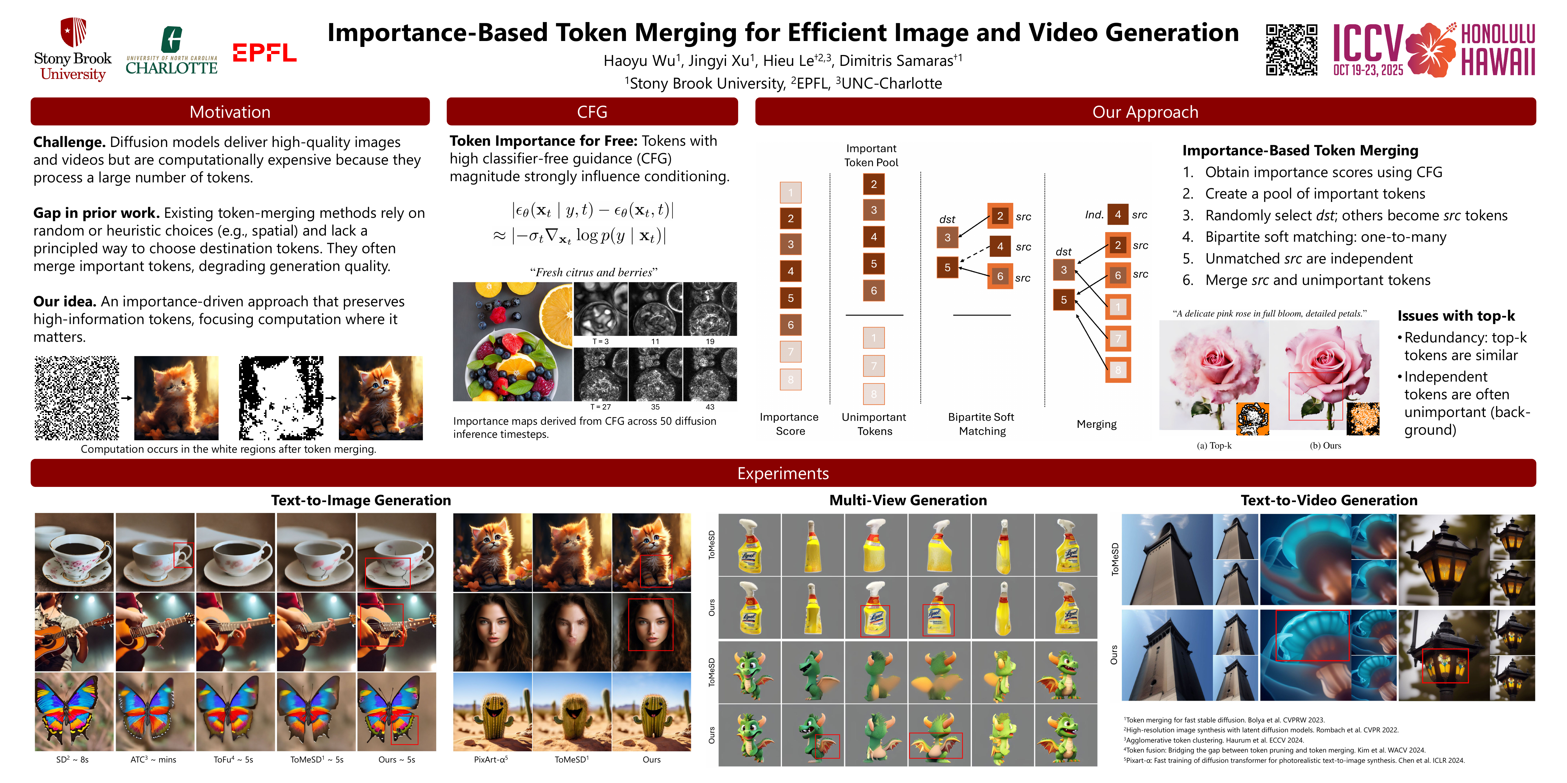 Token merging can effectively accelerate various vision systems by processing groups of similar tokens only once and sharing the results across them. However, existing token grouping methods are often ad hoc and random, disregarding the actual content of the samples. We show that preserving high-information tokens during merging—those essential for semantic fidelity and structural details—significantly improves sample quality, producing finer details and more coherent, realistic generations. Despite being simple and intuitive, this approach remains underexplored.To do so, we propose an importance-based token merging method that prioritizes the most critical tokens in computational resource allocation, leveraging readily available importance scores, such as those from classifier-free guidance in diffusion models. Experiments show that our approach significantly outperforms baseline methods across multiple applications, including text-to-image synthesis, multi-view image generation, and video generation with various model architectures such as Stable Diffusion, Zero123++, AnimateDiff, or PixArt-$\alpha$.