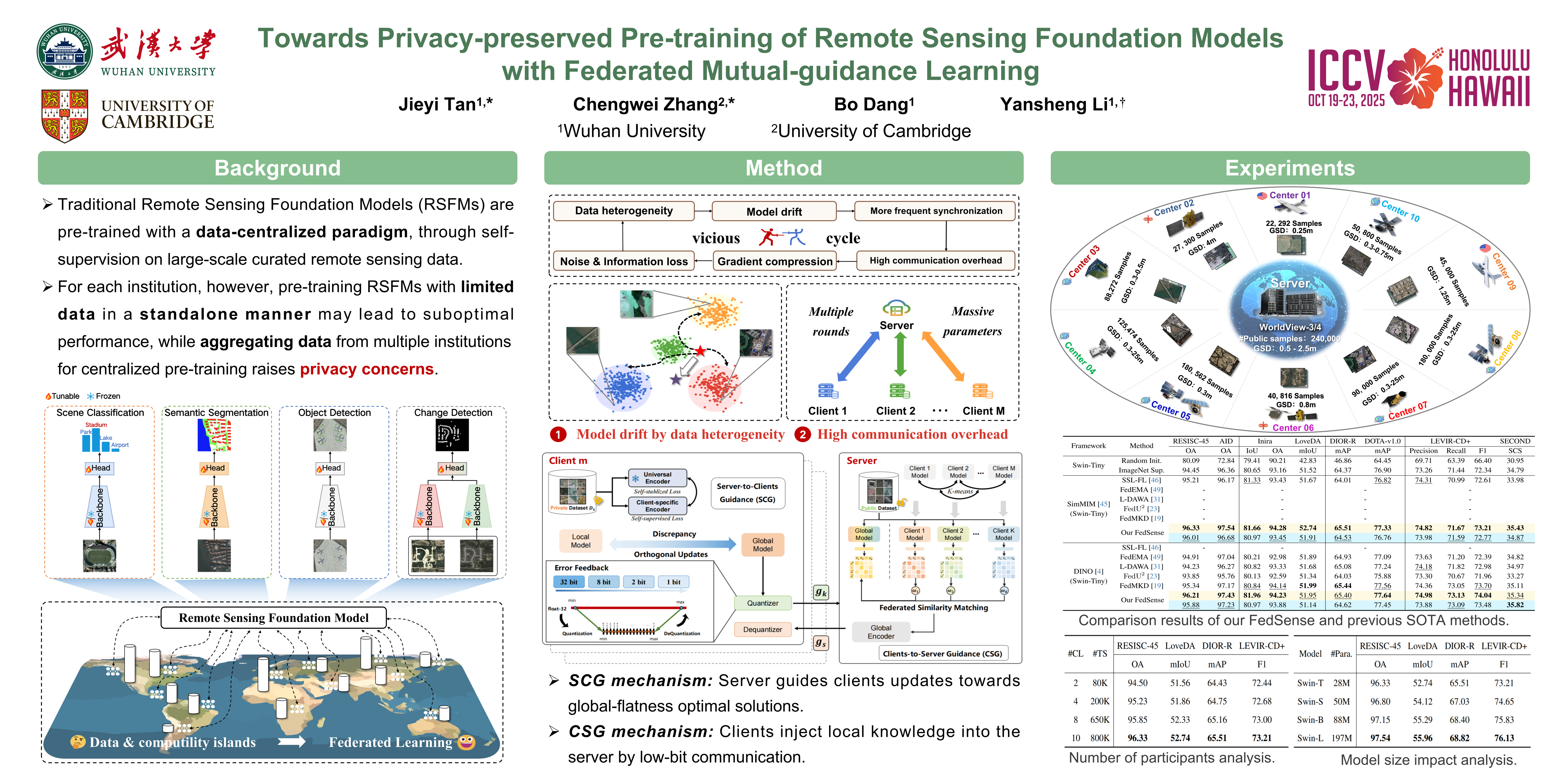 Traditional Remote Sensing Foundation models (RSFMs) are pre-trained with a data-centralized paradigm, through self-supervision on large-scale curated remote sensing data. For each institution, however, pre-training RSFMs with limited data in a standalone manner may lead to suboptimal performance, while aggregating remote sensing data from multiple institutions for centralized pre-training raises privacy concerns. Seeking for collaboration is a promising solution to resolve this dilemma, where multiple institutions can collaboratively train RSFMs without sharing private data. In this paper, we propose a novel privacy-preserved pre-training framework (FedSense), which enables multiple institutions to collaboratively train RSFMs without sharing private data. However, it is a non-trivial task hindered by a vicious cycle, which results from model drift by remote sensing data heterogeneity and high communication overhead. To break this vicious cycle, we introduce Federated Mutual-guidance Learning. Specifically, we propose a Server-to-Clients Guidance (SCG) mechanism to guide clients updates towards global-flatness optimal solutions. Additionally, we propose a Clients-to-Server Guidance (CSG) mechanism to inject local knowledge into the server by low-bit communication. Extensive experiments on four downstream tasks demonstrate the effectiveness of our FedSense in both full-precision and communication-reduced scenarios, showcasing remarkable communication efficiency and performance gains.