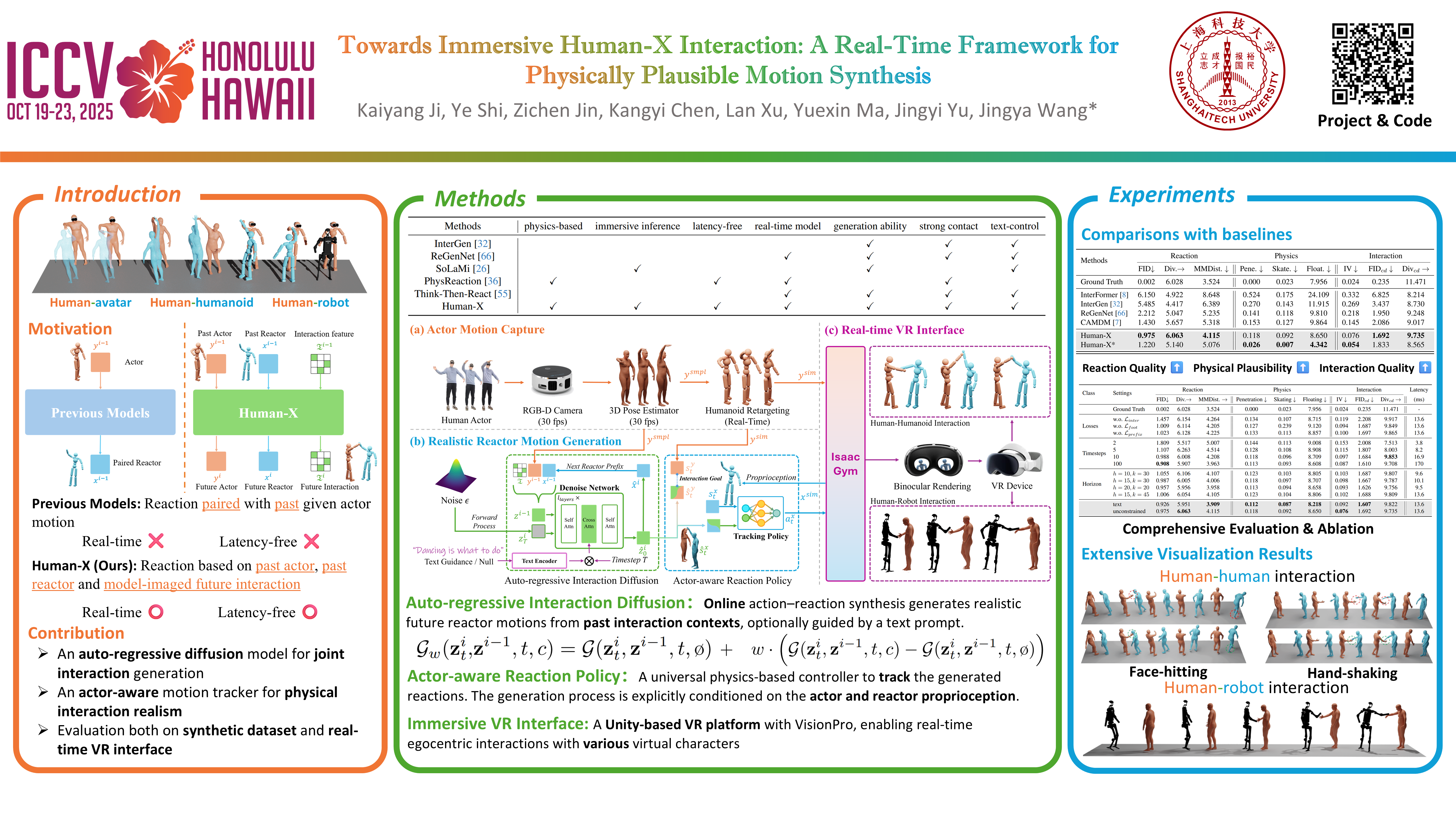 Real-time synthesis of physically plausible human interactions remains a critical challenge for immersive VR/AR systems and humanoid robotics. While existing methods demonstrate progress in kinematic motion generation, they often fail to address the fundamental tension between real-time responsiveness, physical feasibility, and safety requirements in dynamic human-machine interactions. We introduce Human-X, a novel framework designed to enable immersive and physically plausible human interactions across diverse entities, including human-avatar, human-humanoid, and human-robot systems. Unlike existing approaches that focus on post-hoc alignment or simplified physics, our method jointly predicts actions and reactions in real-time using an auto-regressive reaction diffusion planner, ensuring seamless synchronization and context-aware responses. To enhance physical realism and safety, we integrate an actor-aware motion tracking policy trained with reinforcement learning, which dynamically adapts to interaction partners’ movements while avoiding artifacts like foot sliding and penetration. Extensive experiments on the Inter-X and InterHuman datasets demonstrate significant improvements in motion quality, interaction continuity, and physical plausibility over state-of-the-art methods. Our framework is validated in real-world applications, including virtual reality interface for human-robot interaction, showcasing its potential for advancing human-robot collaboration.