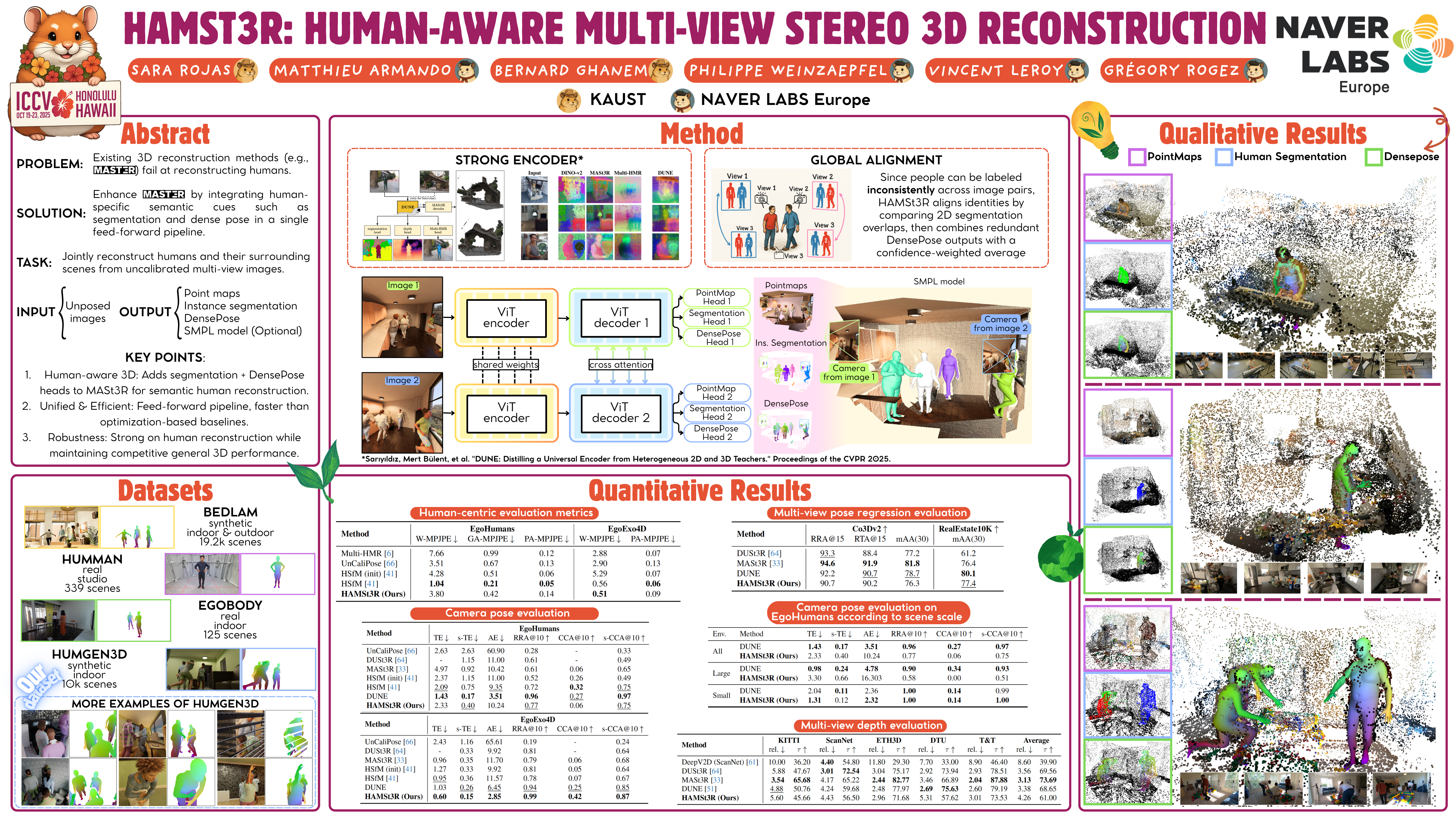 Recovering the 3D geometry of a scene from a sparse set of uncalibrated images is a long-standing problem in computer vision. While recent learning-based approaches such as DUSt3R and MASt3R have demonstrated impressive results by directly predicting dense scene geometry, they are primarily trained on outdoor scenes with static environments and struggle to handle human-centric scenarios. In this work, we introduce HAMSt3R, an extension of MASt3R for joint human and scene 3D reconstruction from sparse, uncalibrated multi-view images. First, we use a strong image encoder by distilling the ones from MASt3R and from a state-of-the-art Human Mesh Recovery (HMR) model, multi-HMR, for a better understanding of scene geometry and human bodies. Our method then incorporates additional network heads to segment humans, estimate dense correspondences via DensePose, and predict depth in human-centric environments, enabling a more holistic 3D reconstruction. By leveraging the outputs of our different heads, HAMSt3R produces a dense point map enriched with human semantic information in 3D.Unlike existing methods that rely on complex optimization pipelines, our approach is fully feed-forward and efficient, making it suitable for real-world applications.We evaluate our model on EgoHumans and EgoExo4D, two challenging benchmarks containing diverse human-centric scenarios. Additionally, we validate its generalization to traditional multi-view stereo tasks, as well as multi-view pose regression. Our results demonstrate that our method can reconstruct humans effectively while preserving strong performance in general 3D reconstruction tasks, bridging the gap between human and scene understanding in 3D vision.